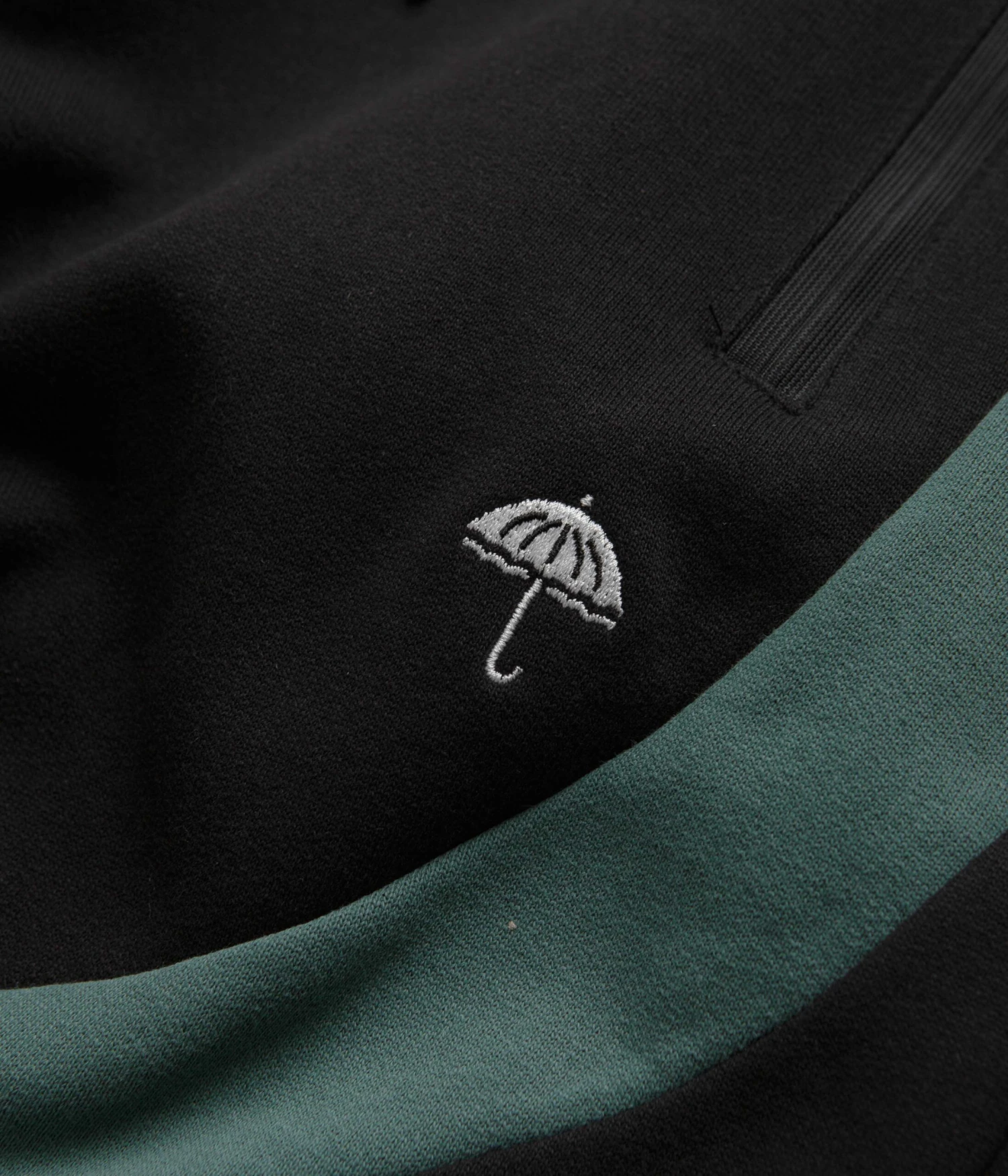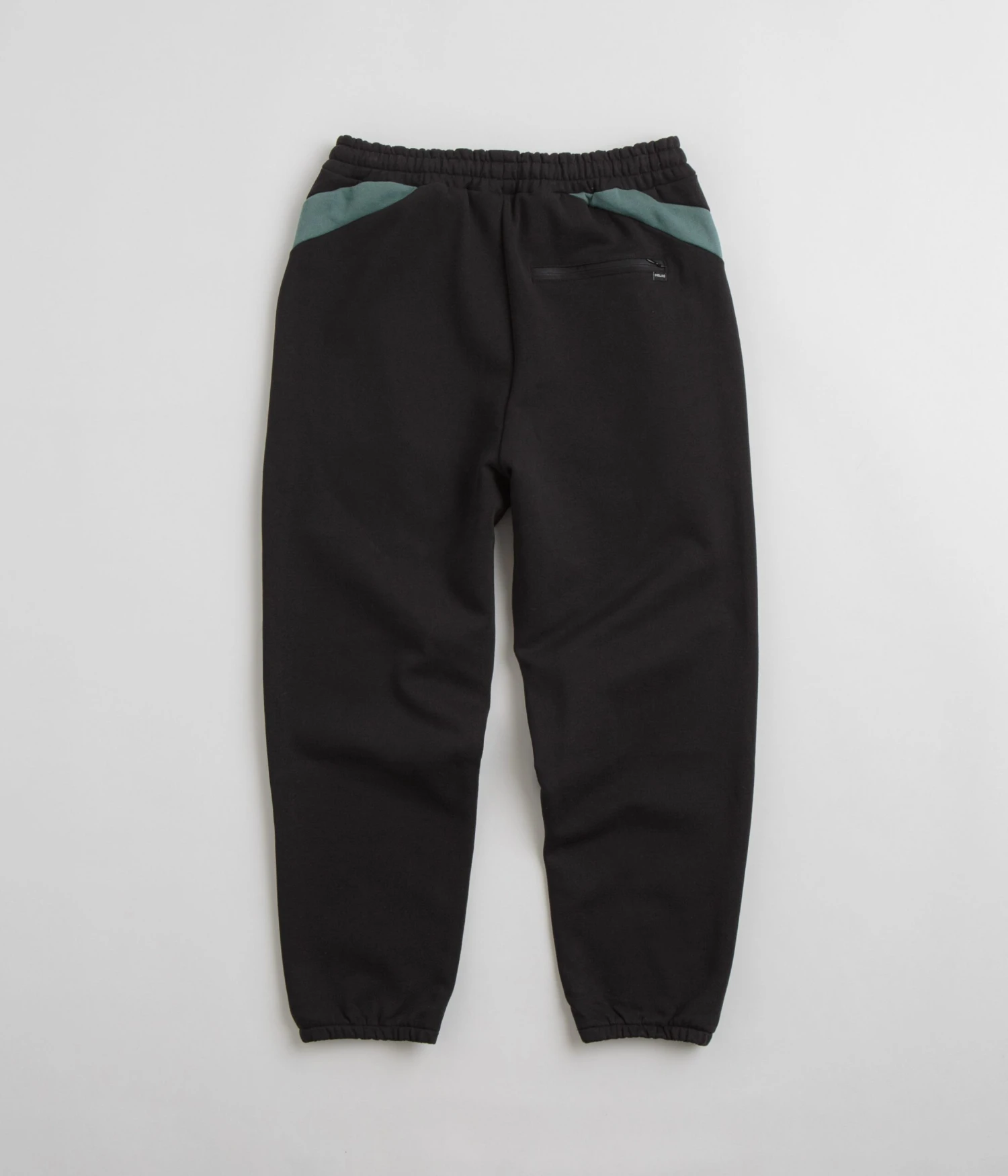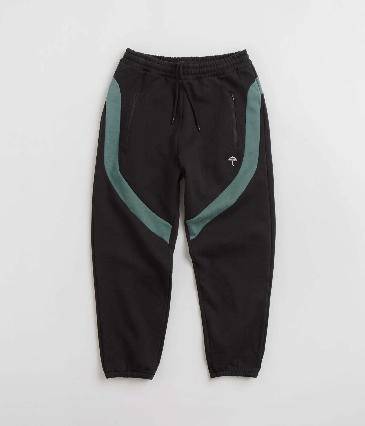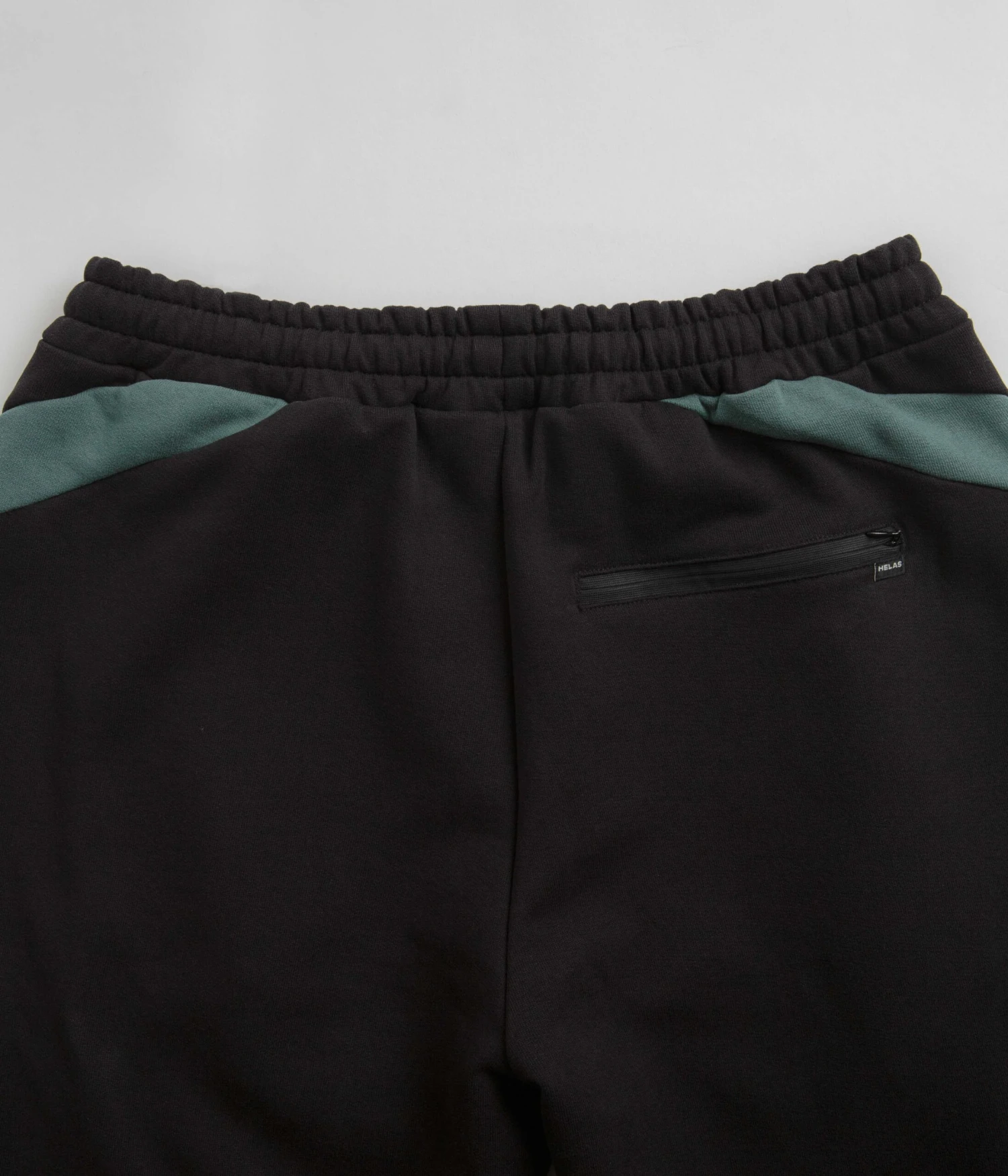 Hélas Raid Sweatpants in Black. Tailored to a regular fitting from a cotton poly blend, these tapered leg Hélas sweatpants are designed with an elasticated waist and panelled details. Featuring two zippered pockets and ribbed cuffs, these Hélas sweatpants are finished with embroidered logo branding and with teal green panels.
