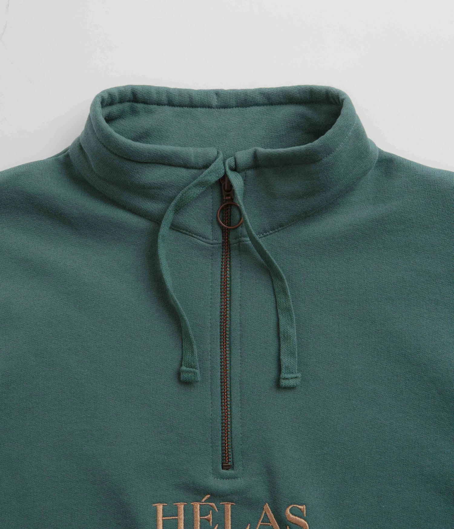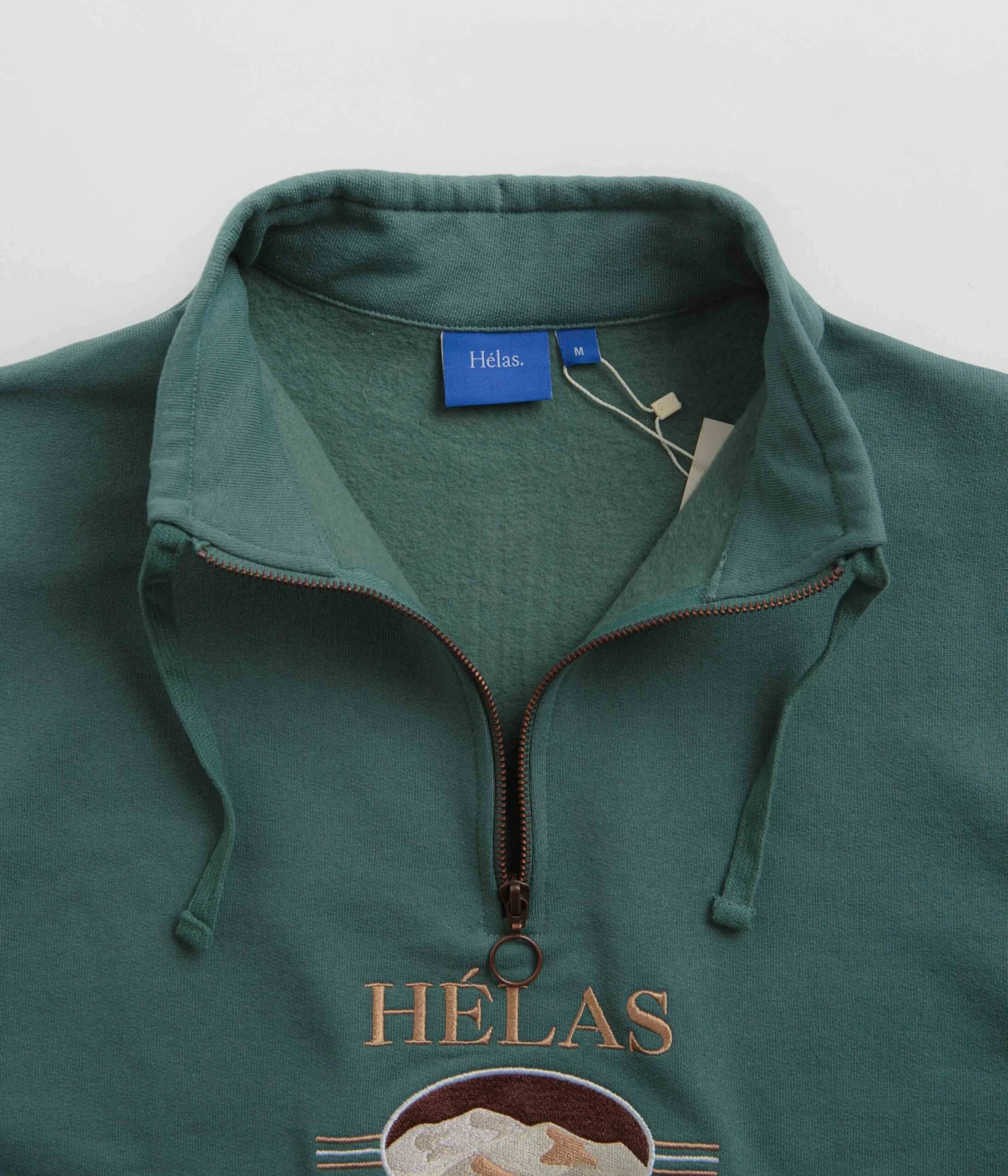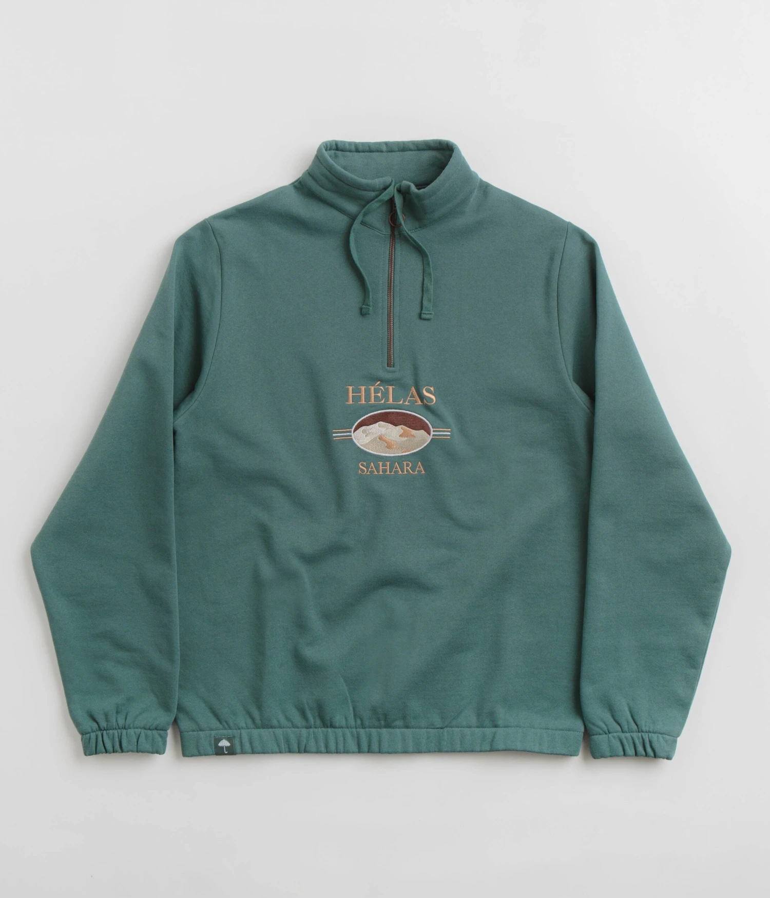 Hélas Sahara Quarter Zip Sweatshirt in Khaki Green. Regular fitting and made from a cotton/polyester blend, this new season Hélas sweatshirt is designed with a quarter-length zipper fastening. Featuring ribbed cuffs and a woven elastic hem, this green Hélas sweater is finished with a drawstring collar and with an embroidered Hélas Sahara chest graphic.