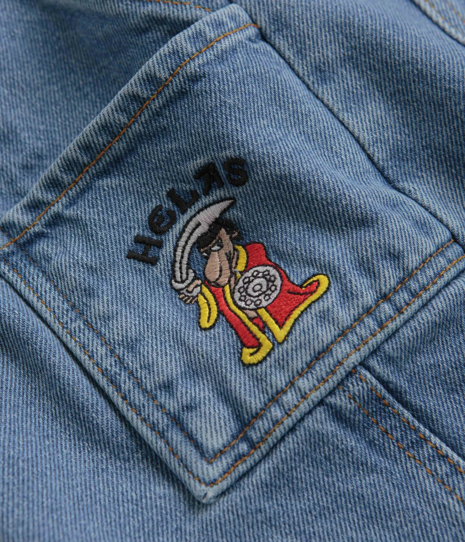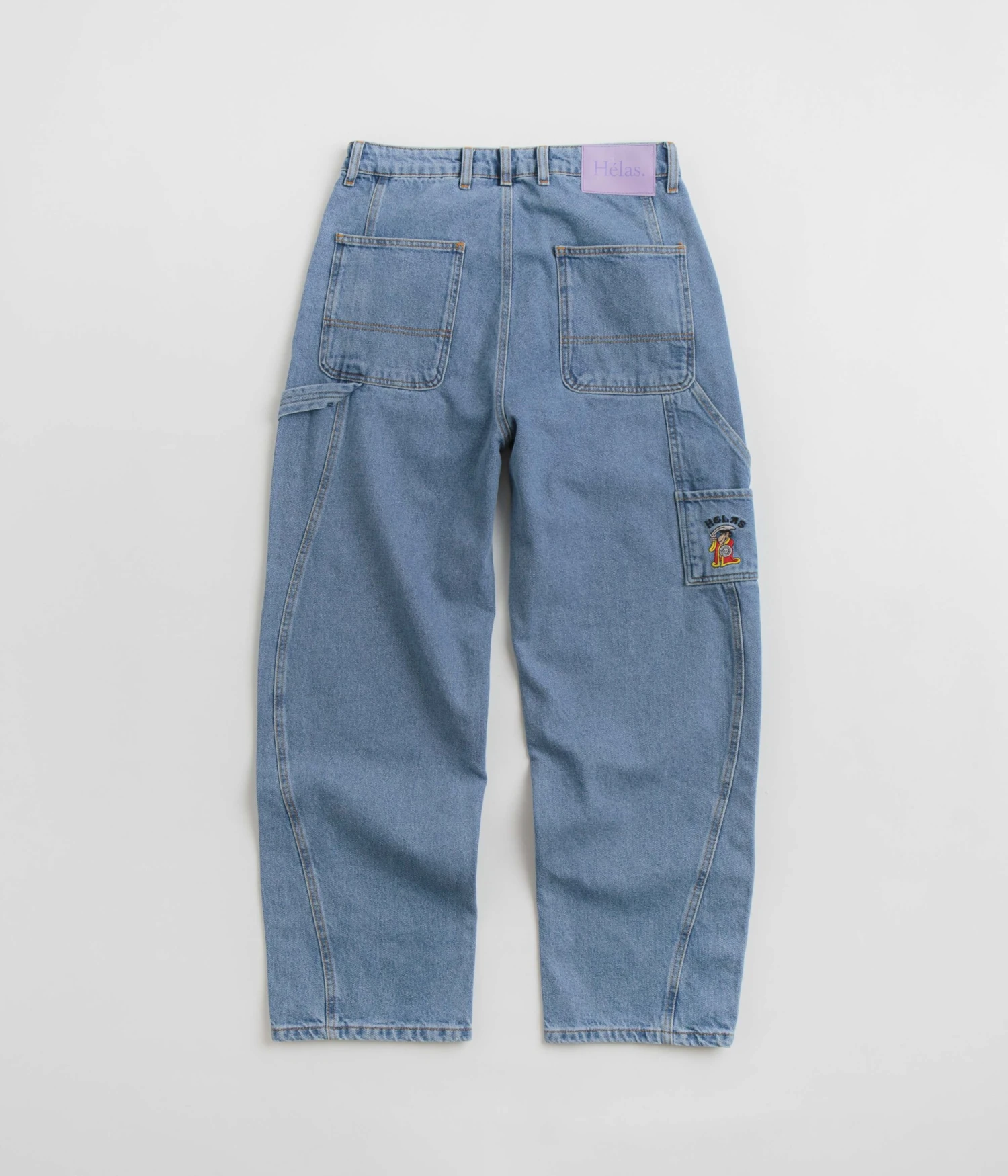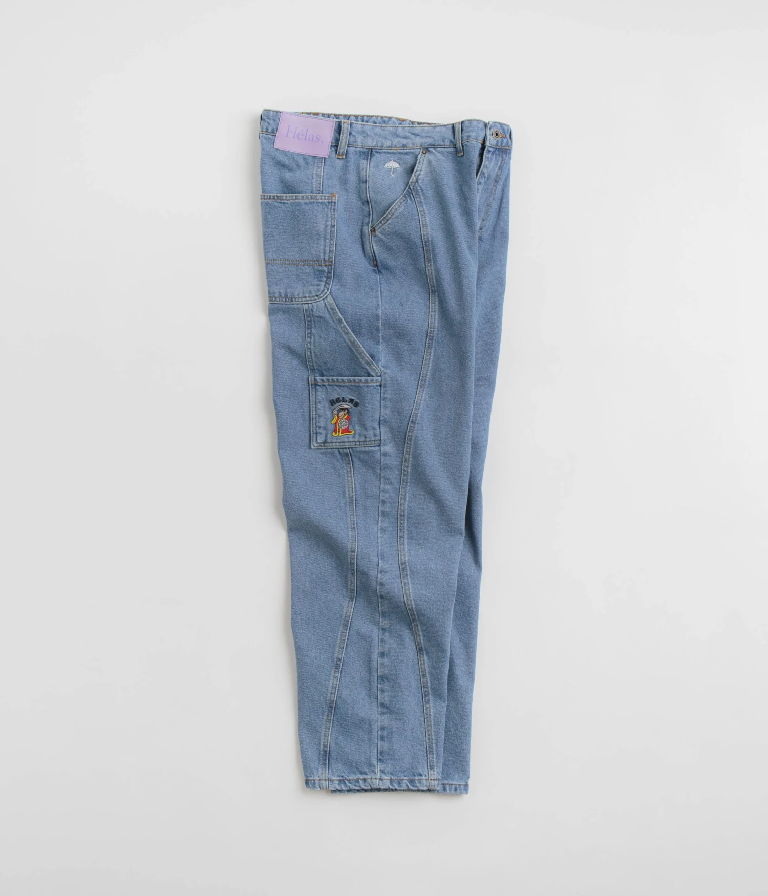 Hélas Zigzag Jeans in Light Blue. Made from 100% cotton denim with stitch panel details, these regular fitting Hélas jeans are designed with a straight leg cut. Featuring a belt loop waist and a single button secured zipper fly, these blue Hélas jeans are finished with two side pockets, two rear pockets, a woven tool pocket and with embroidered graphics.