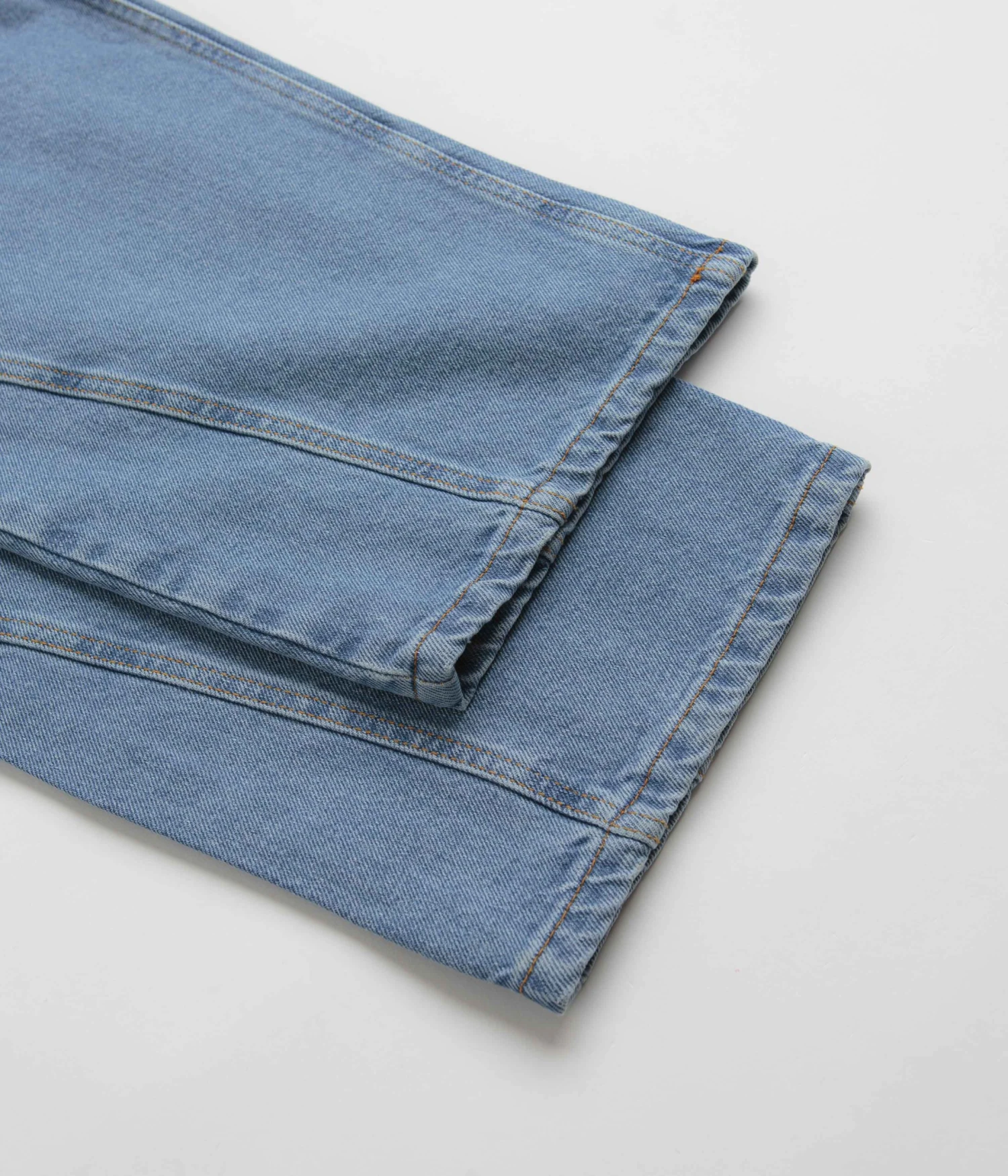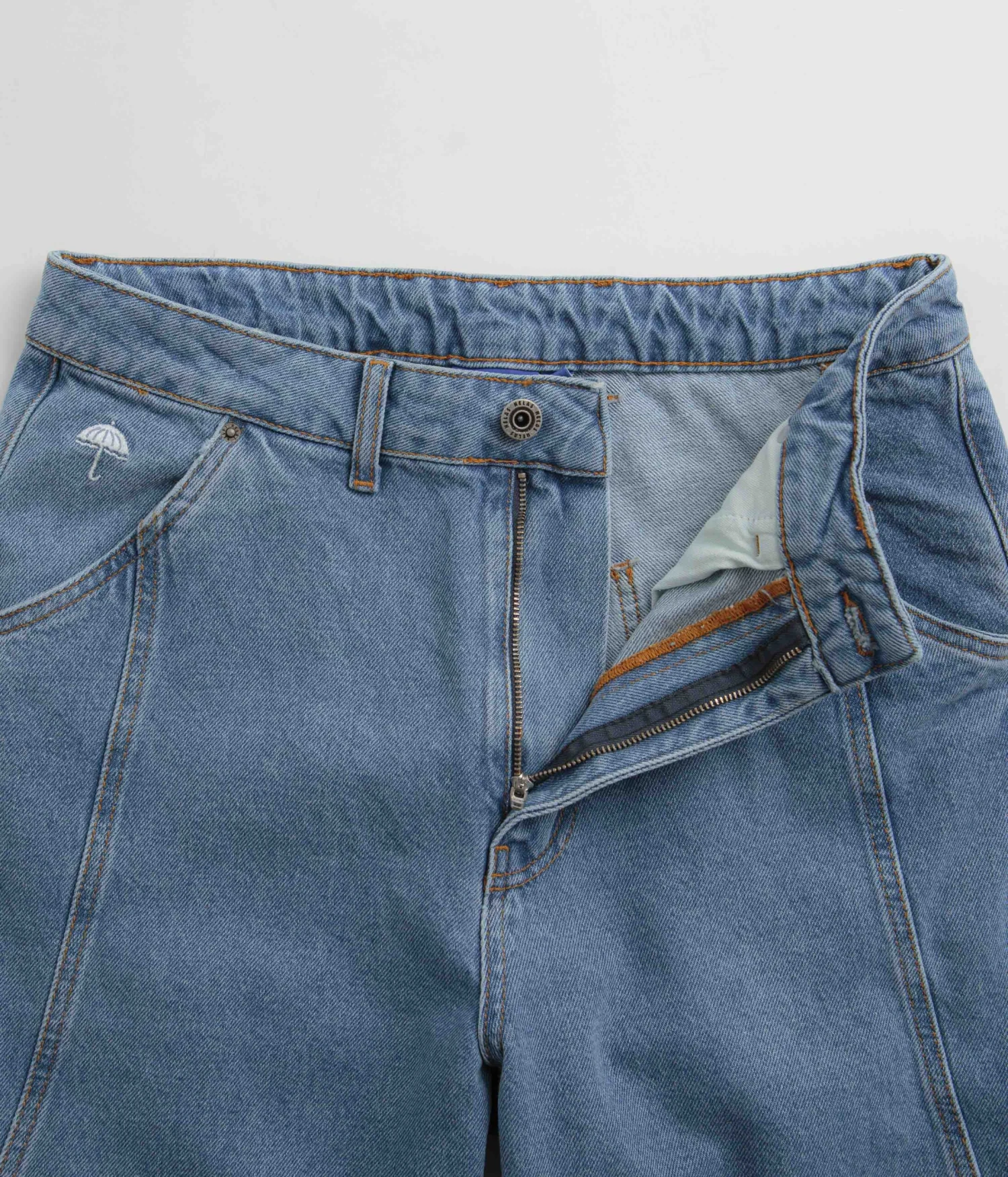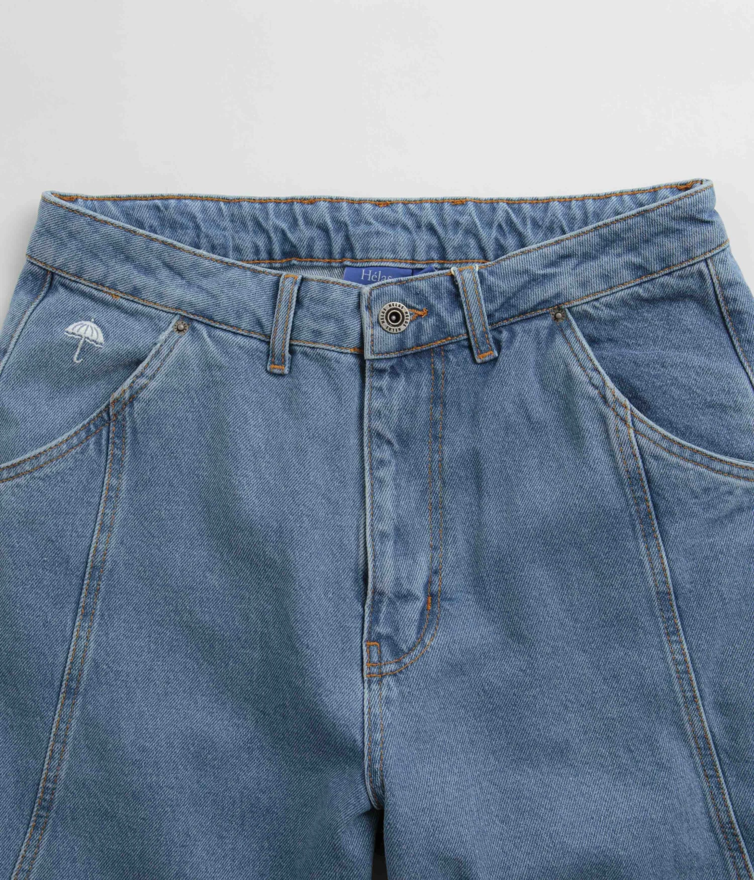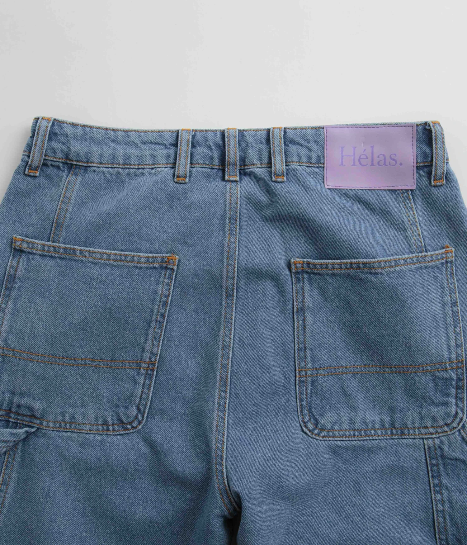 Hélas Zigzag Jeans in Light Blue. Made from 100% cotton denim with stitch panel details, these regular fitting Hélas jeans are designed with a straight leg cut. Featuring a belt loop waist and a single button secured zipper fly, these blue Hélas jeans are finished with two side pockets, two rear pockets, a woven tool pocket and with embroidered graphics.