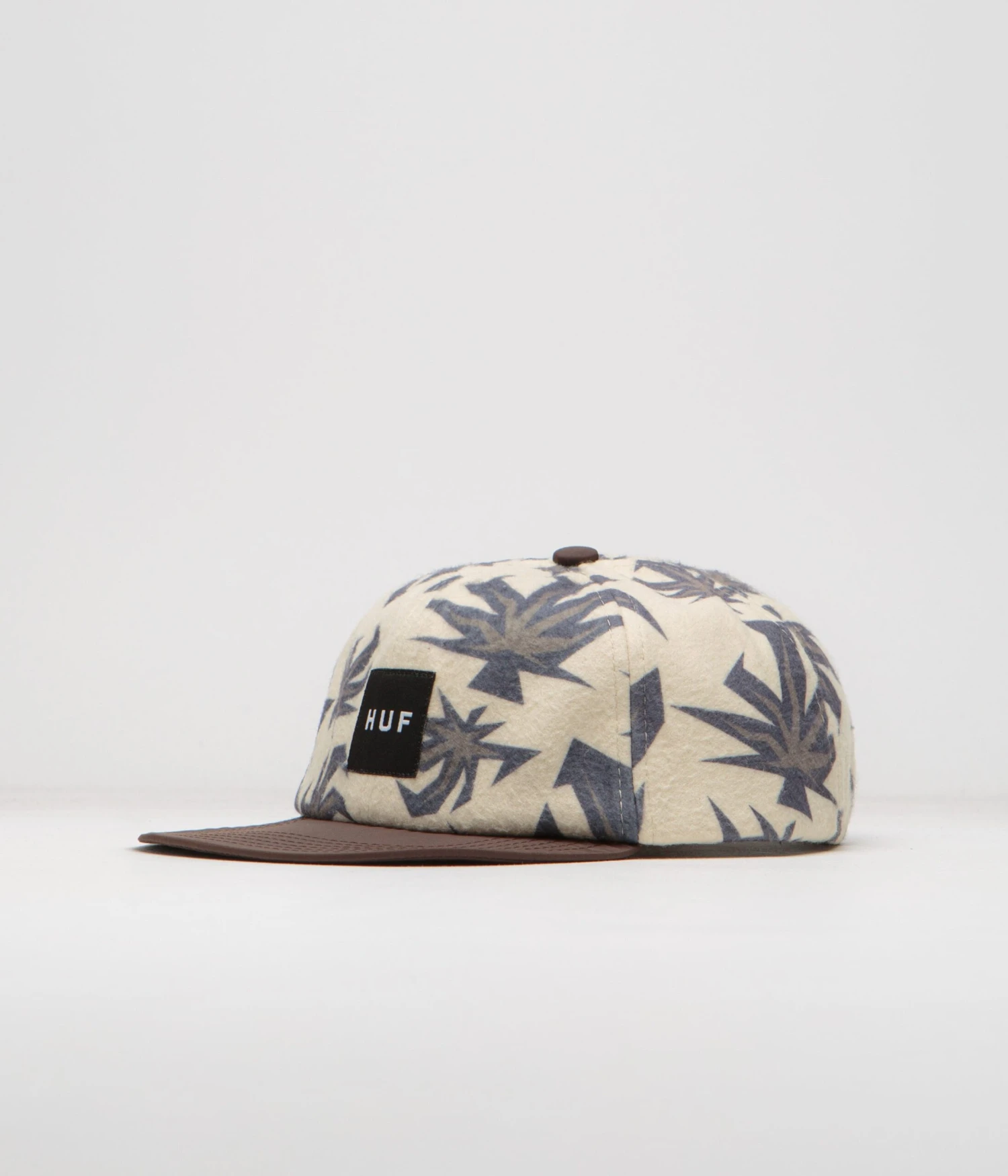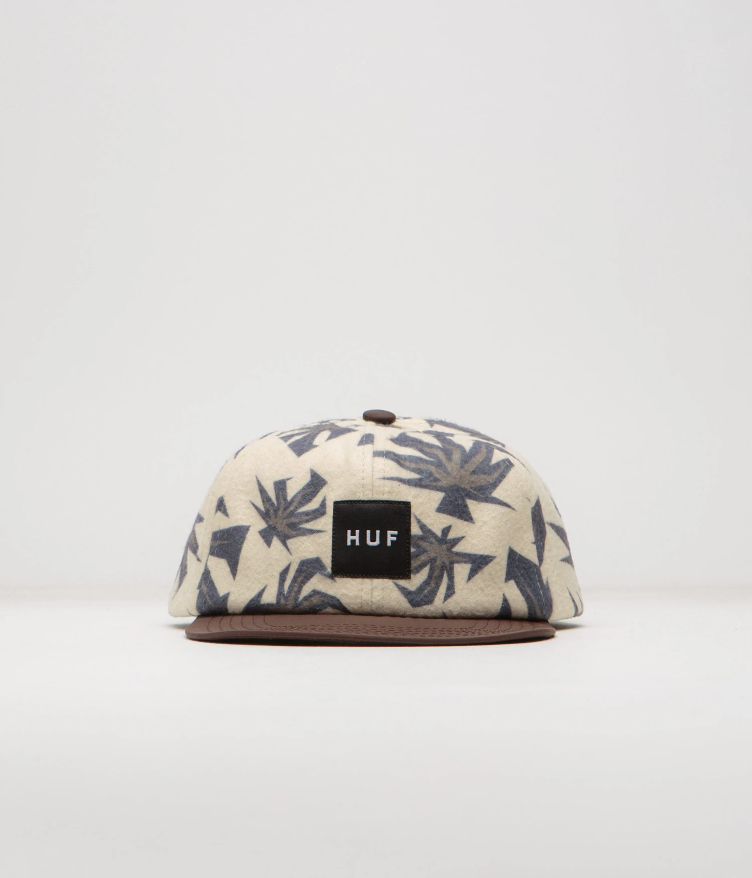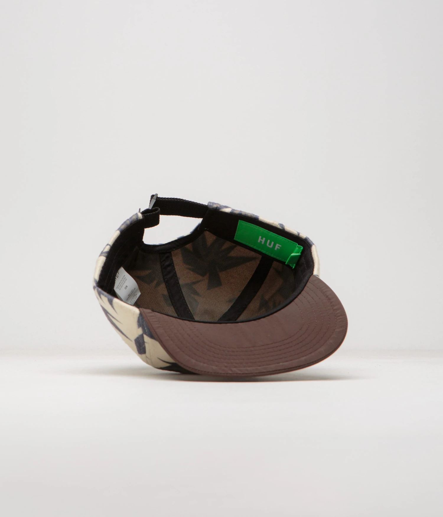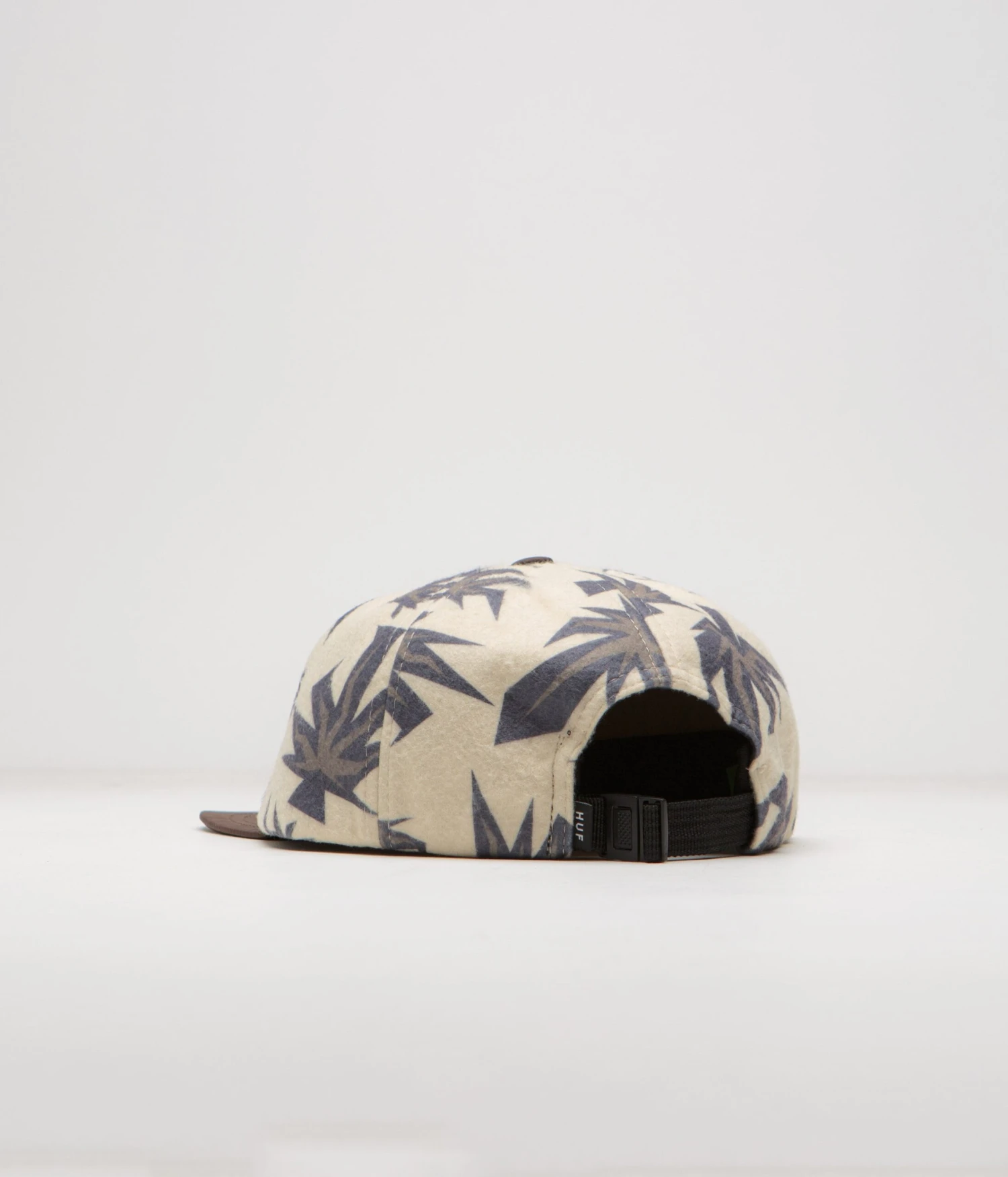 HUF Funny Feeling Cap in Natural. Made from a blend of 60% polyester and 40% cotton, this HUF cap is styled with an all-over print inspired by vintage outdoor graphics. Featuring a block colour nylon taslan peak with an adjustable strap and clip closure, this 6 panel cap is finished with an embroidered brand patch sewn across the crown.