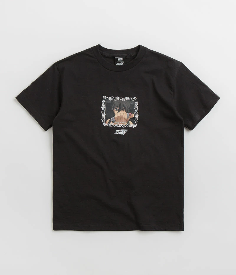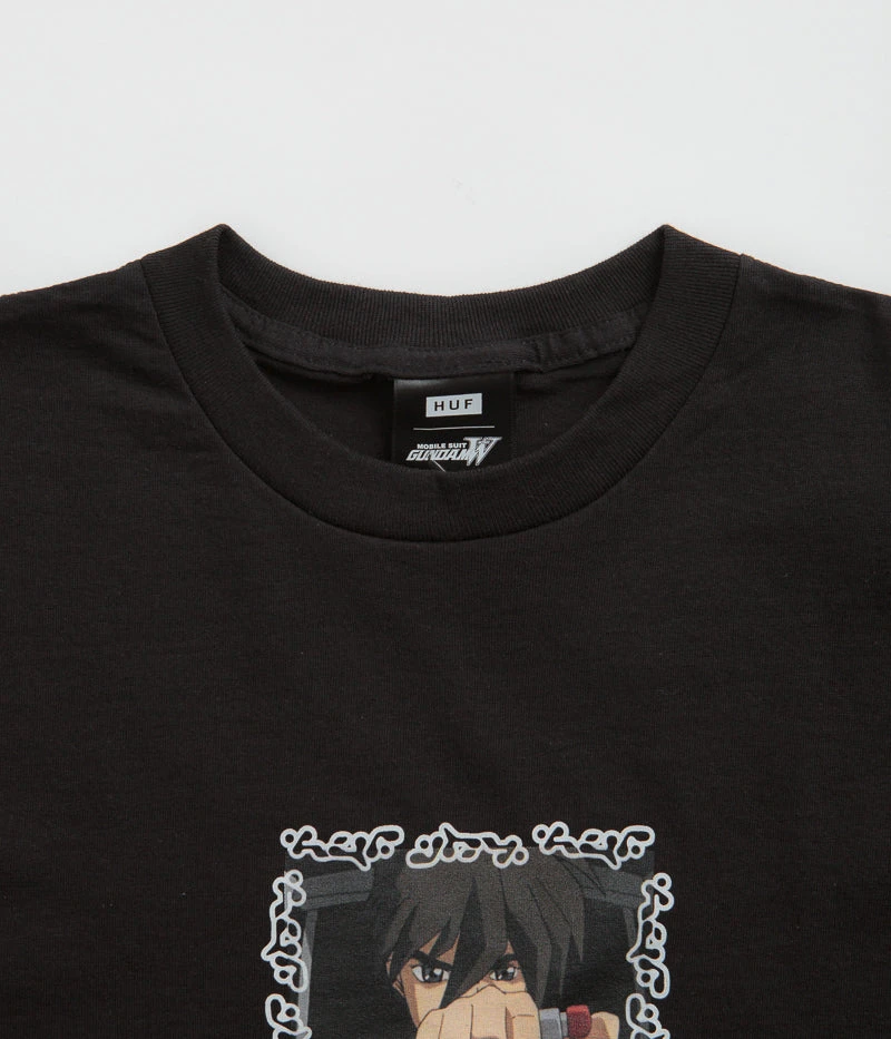 HUF Heero T-Shirt in Black. Tailored to a regular fitting from 100% cotton, this HUF t-shirt arrives as part of the brand’s latest collaboration with Mobile Suit Gundam Wing. Featuring a flexible rib knit collar and a straight cut hem, this black HUF t-shirt is finished with screen printed centre chest artwork.