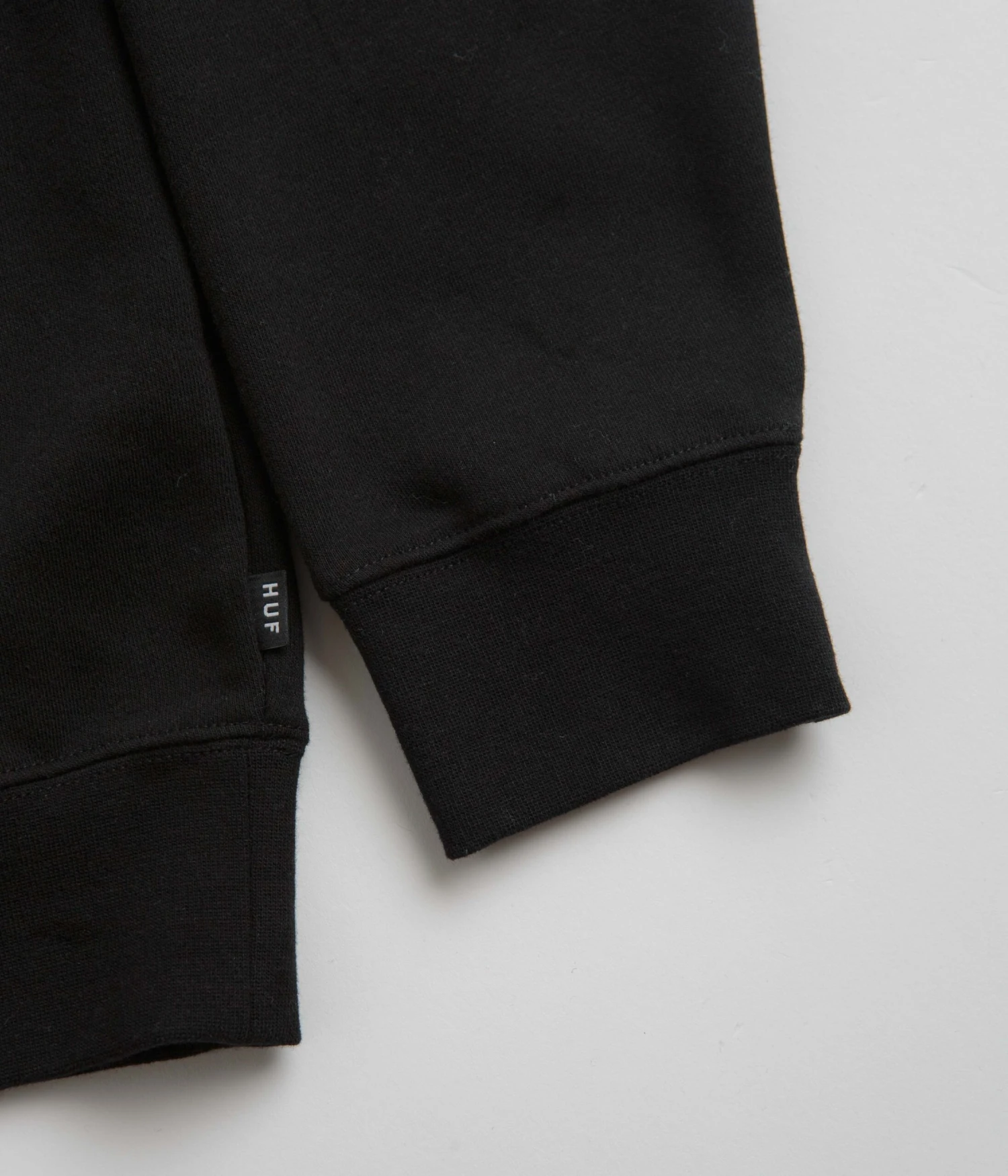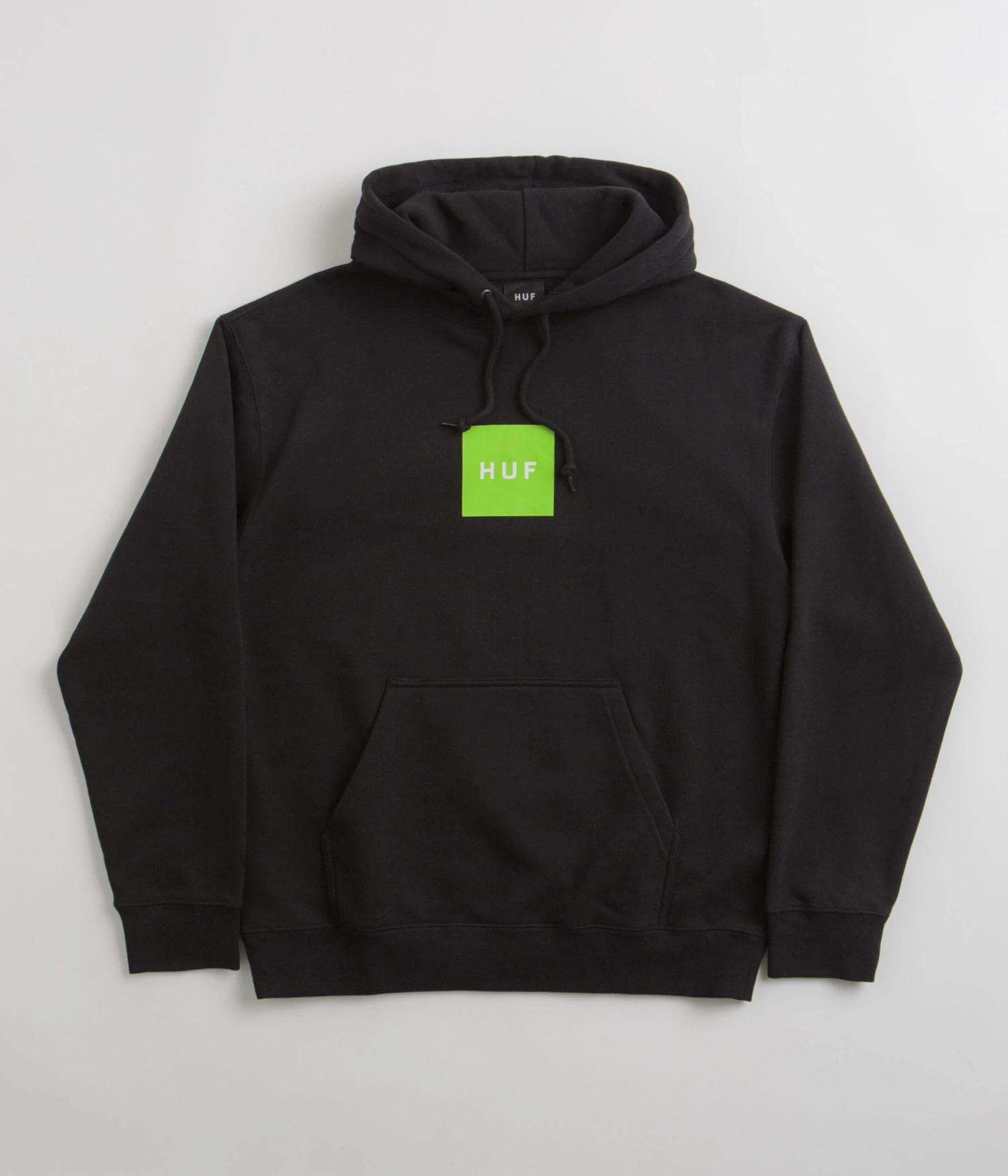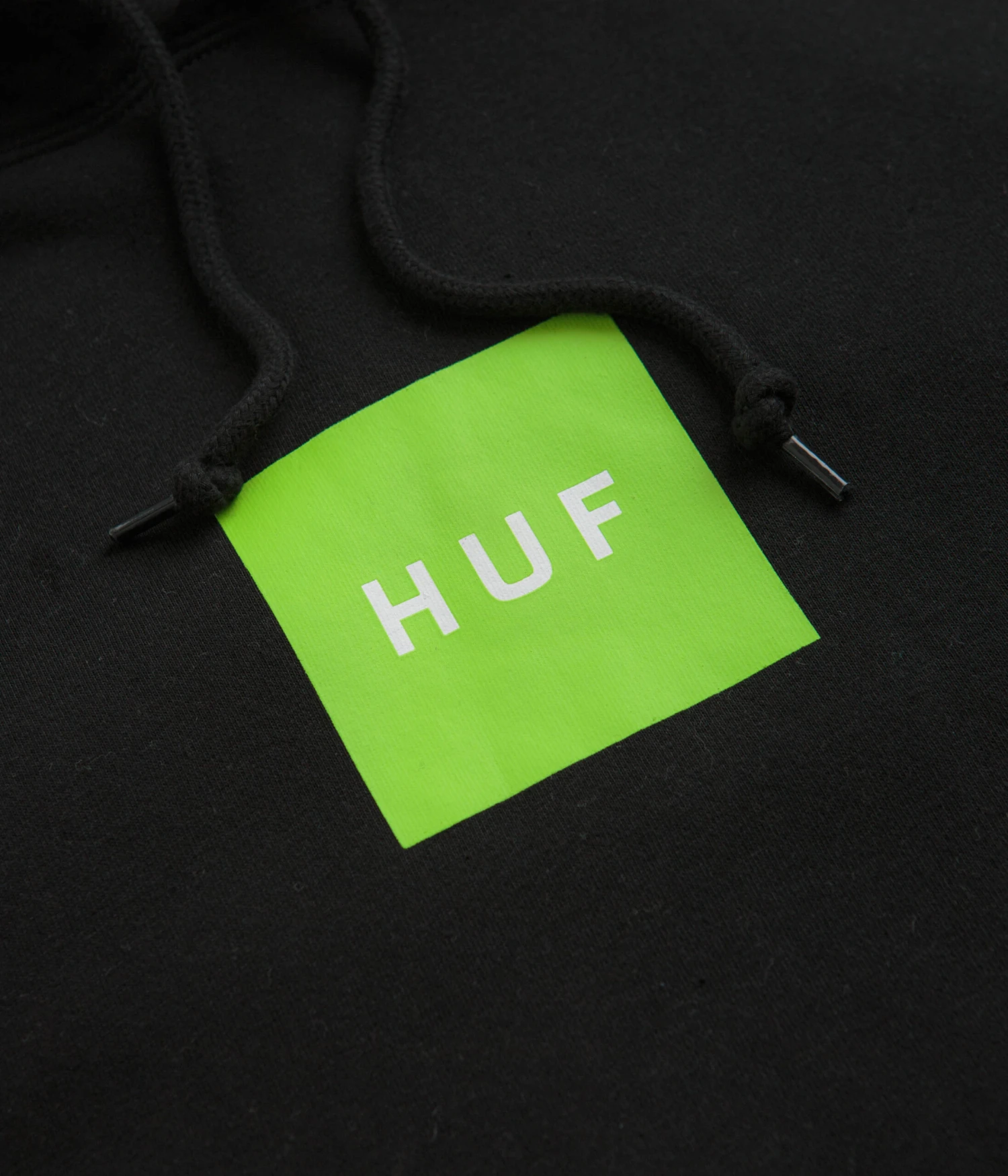 HUF Set Box Hoodie in Black. Regular fitting and made from a cotton-polyester fleece blend, this colour block HUF hoodie is designed with a drawstring hood and ribbed cuffs. Finished with a woven elastic hem, this black HUF hoodie also features a kangaroo front pocket and with a printed HUF box logo displayed across the centre chest.