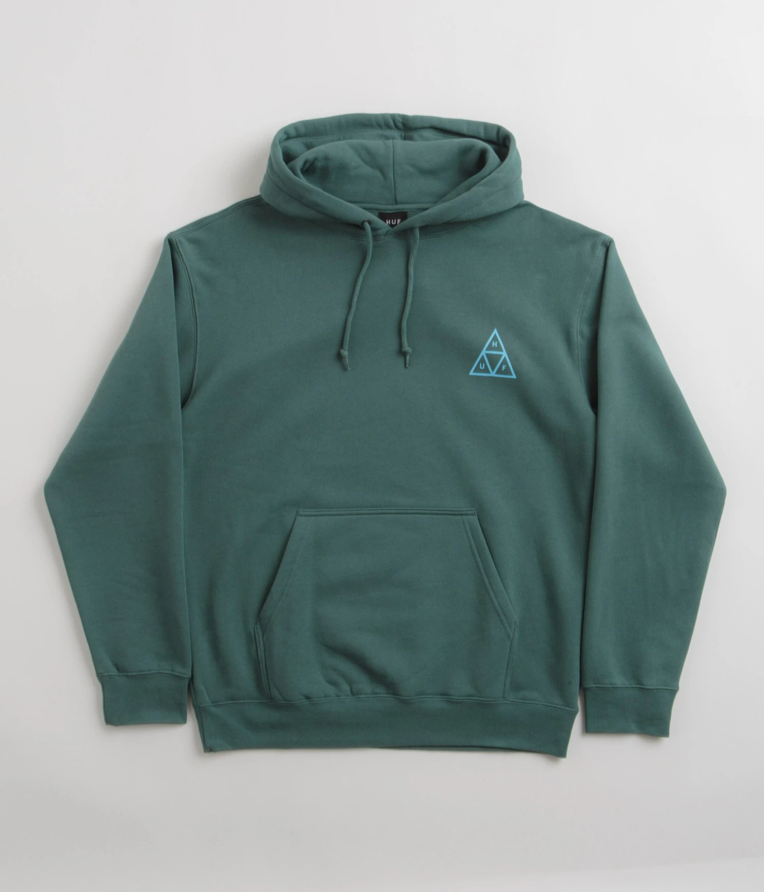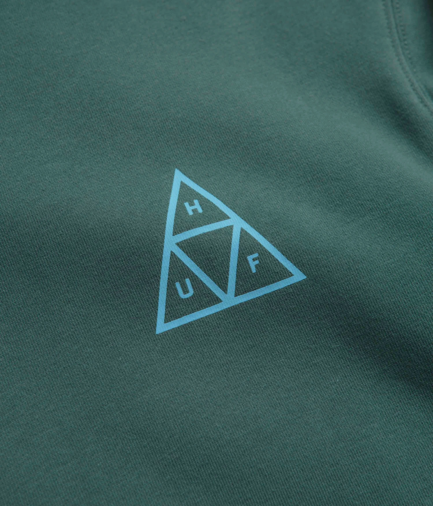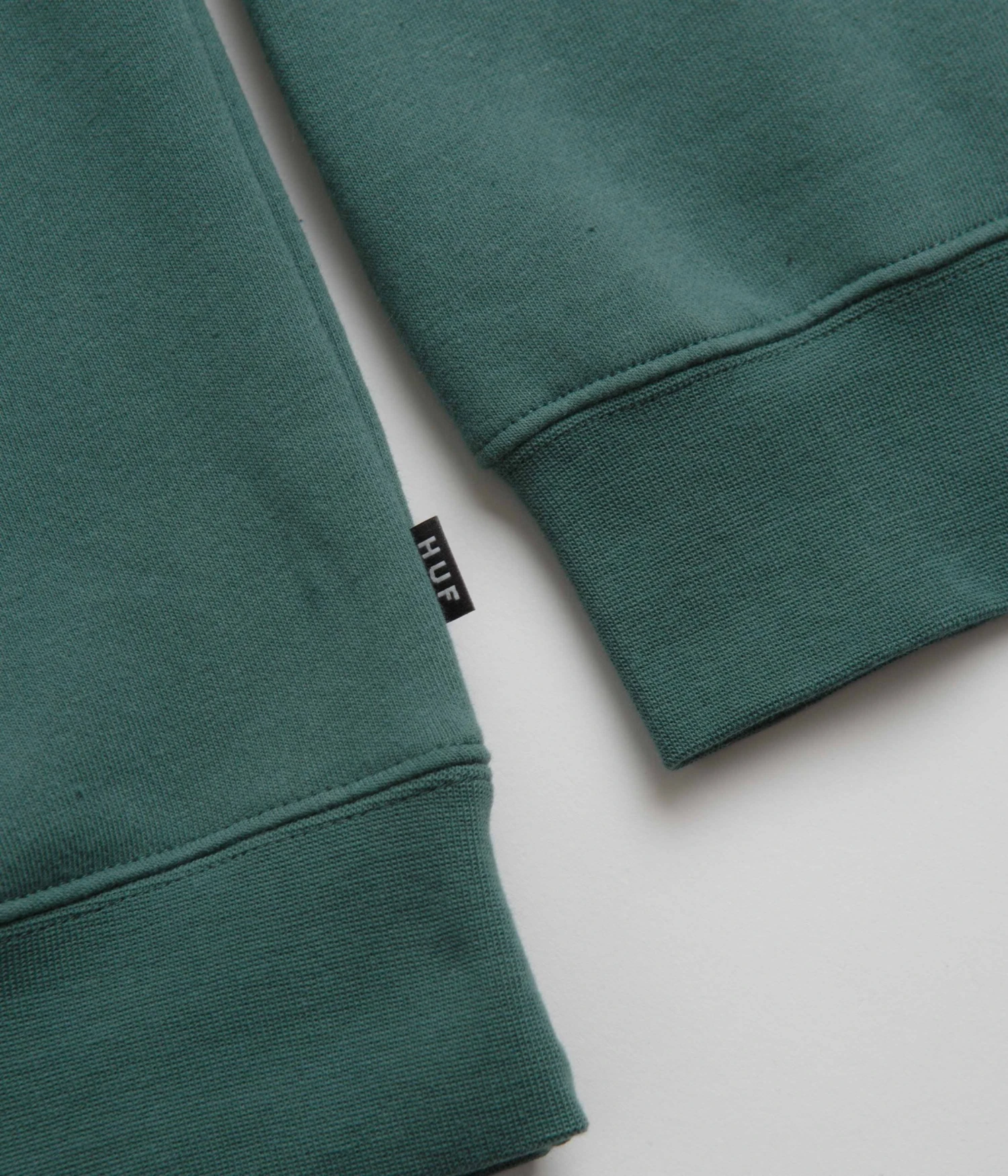 HUF Set Hoodie in Pine. Part of the brand’s latest release, this regular fitting HUF hoodie is made from a cotton-polyester fleece blend. Featuring a drawstring adjustable hood, ribbed cuffs and a woven elastic hem, this pine green HUF hoodie is finished with a kangaroo front pocket and screen printed HUF graphics displayed across both the left chest and rear.