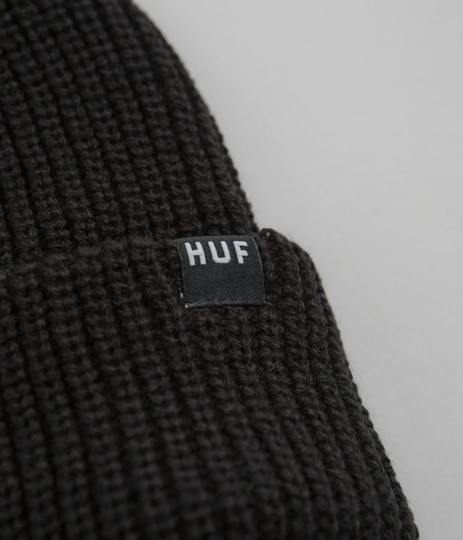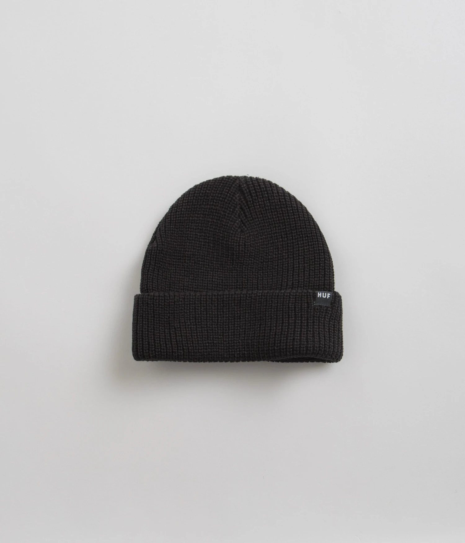 HUF Set Usual Beanie in Black. Made from 100% acrylic, this single sized HUF beanie is designed with a stretchy rib knit face and an adjustable turn-over cuff. Finished with tonal stitched seams, this black HUF beanie is detailed with a woven flag label.