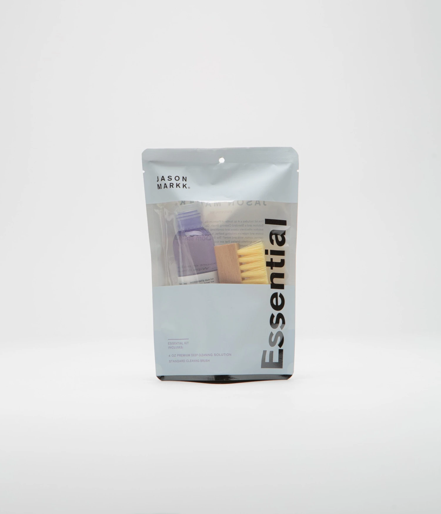 Jason Markk 4oz Essential Kit. Safe for use on all materials including leather, suede and rubber, the Jason Markk essential kit includes 4oz of premium deep cleaning solution and a firm bristled cleaning brush. Designed to effectively clean and condition footwear thanks to the naturally derived formula, whilst the firm bristle brush is suitable for all-round general cleaning and for use when cleaning midsoles.
