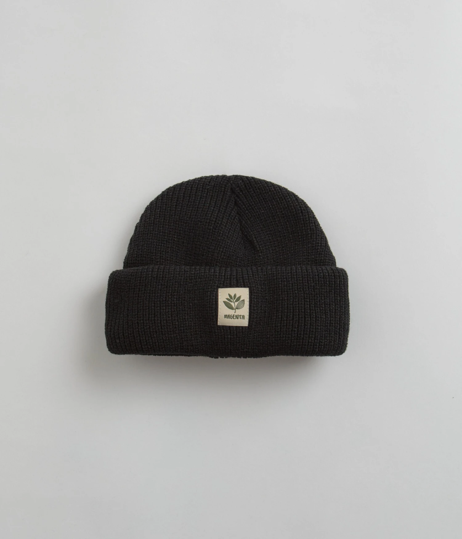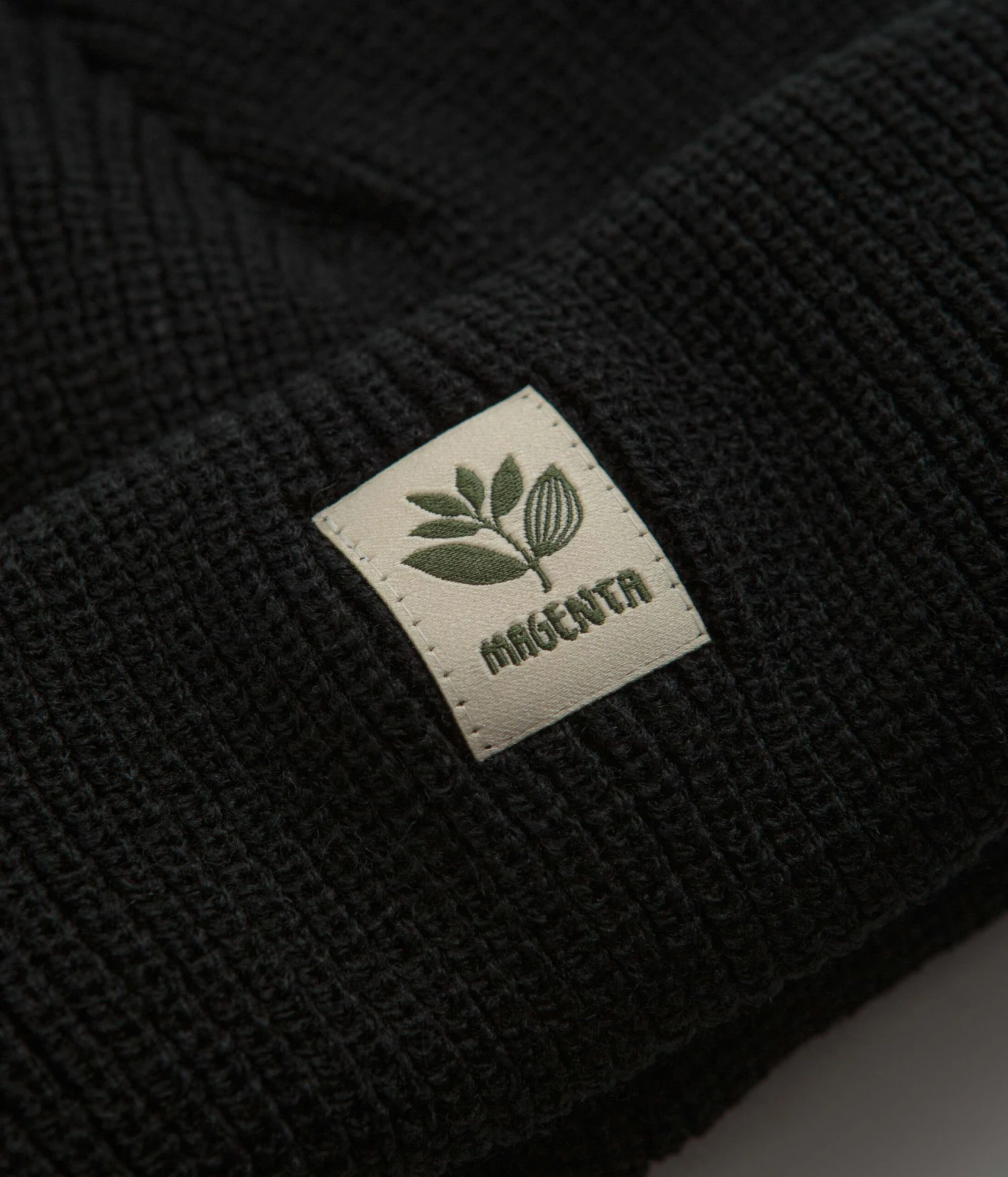 Magenta Fam Beanie in Black. Single sized and made from 100% acrylic, this rib knit Magenta beanie is designed with a stretchy rib knit face. Featuring tonal stitched seams and an adjustable turn-up cuff, this black Magenta beanie is finished with an embroidered plant logo crown patch.