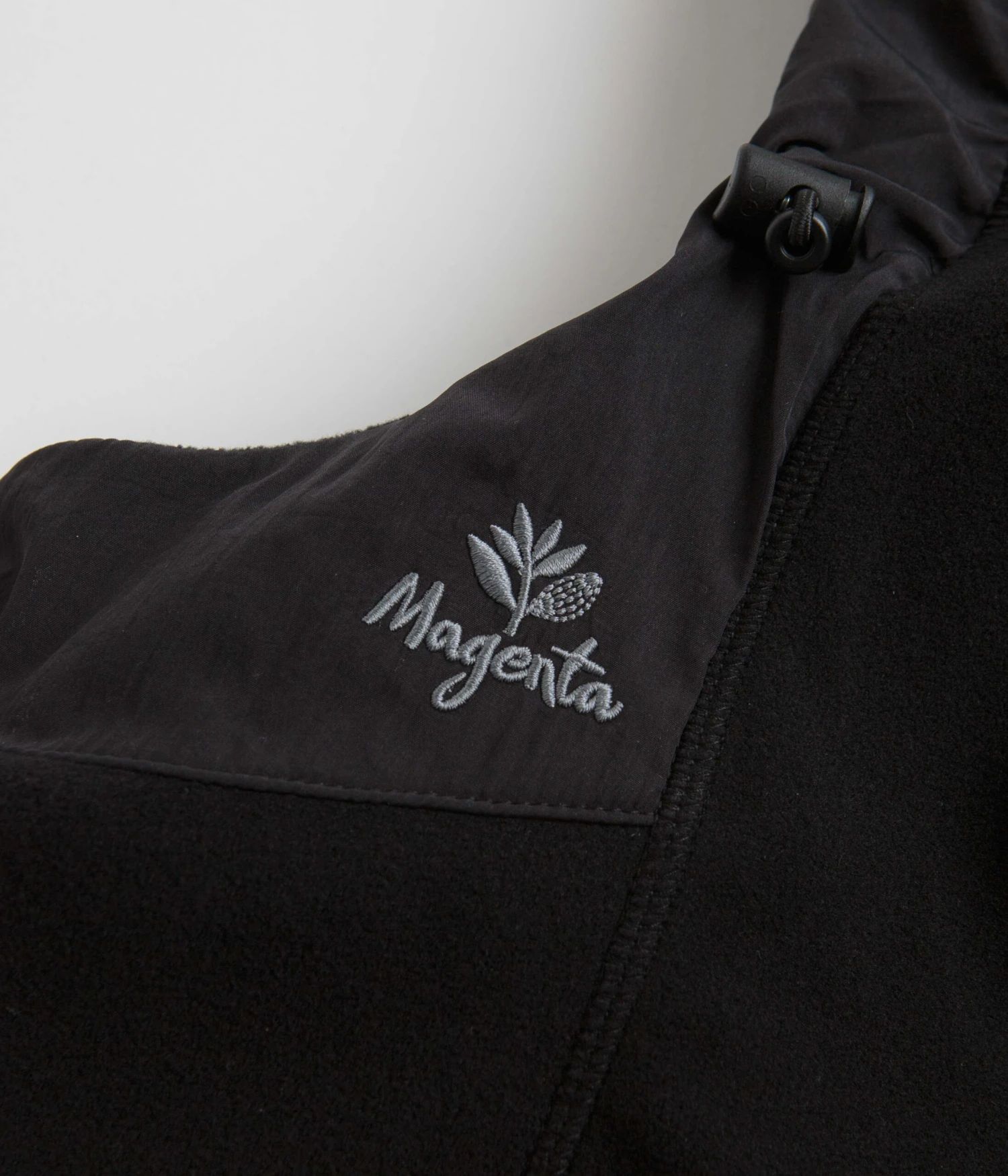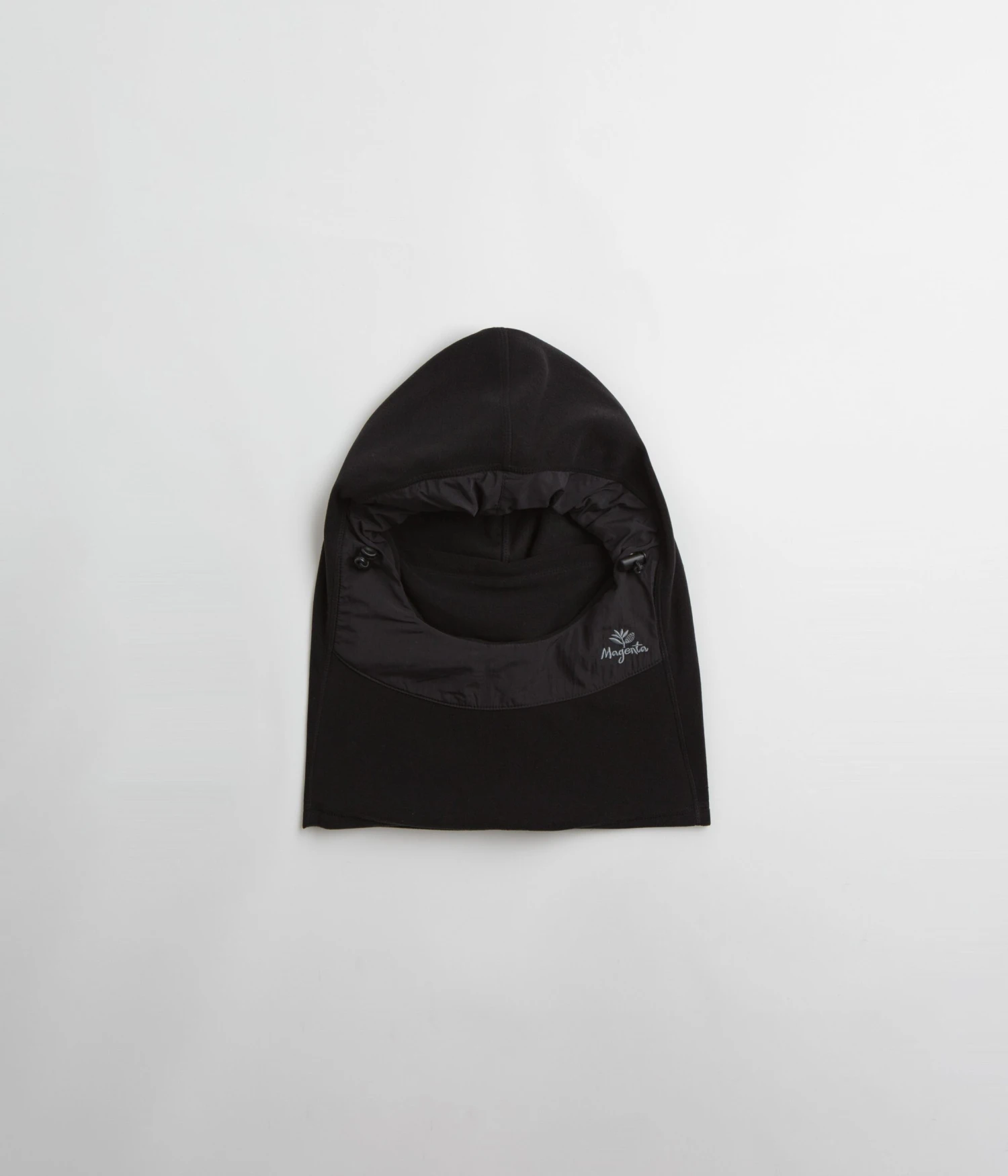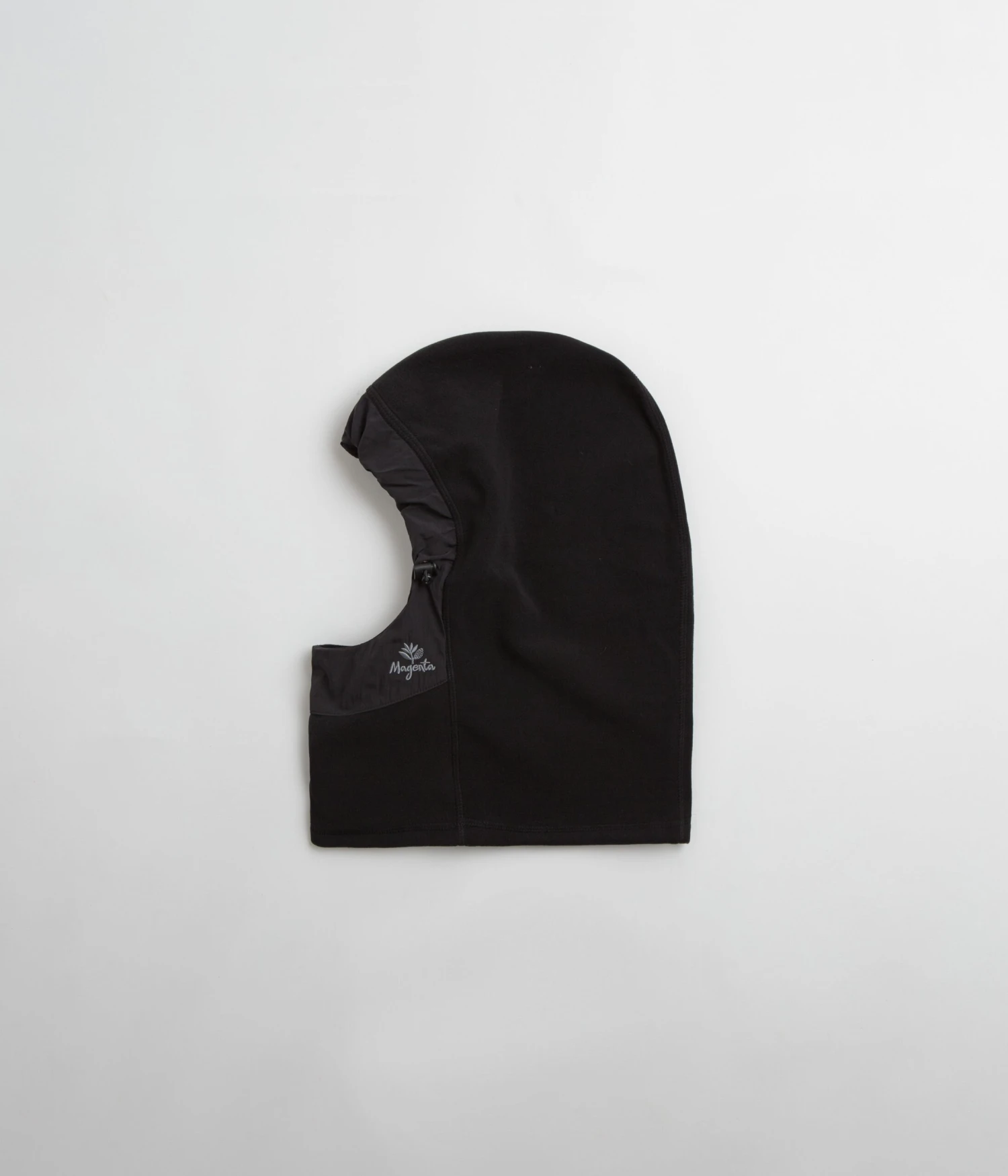 Magenta Hold Up Fleece Mask in Black. Designed with an integrated gaiter, this single sized Magenta mask is made from 100% Polar fleece. Featuring nylon panelling and a toggle-lock eye panel fastener, this black Magenta fleece mask is finished with embroidered logo branding.