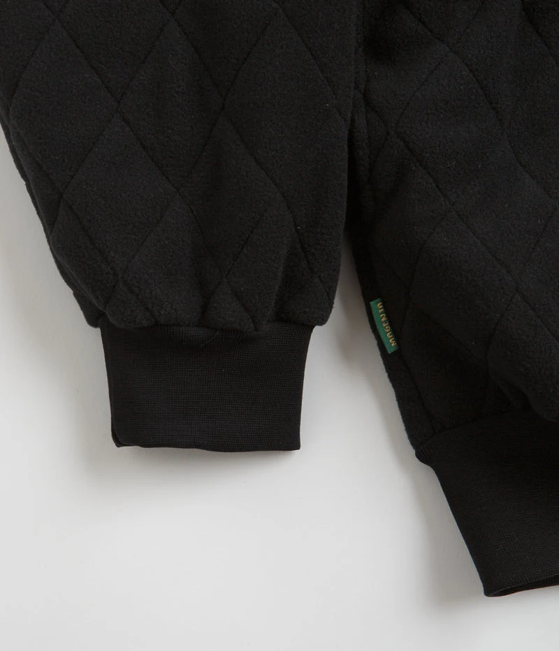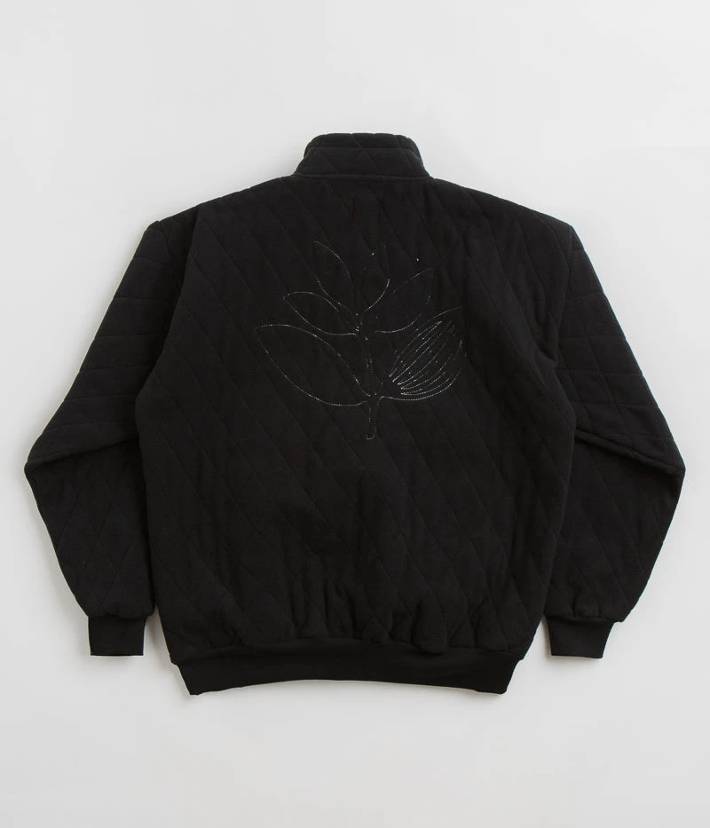 Magenta Lunar Quilted High Neck Sweatshirt in Black. A technical silhouette made from 100% Polar fleece, this regular fitting Magenta sweatshirt is designed with quilted stitching and a quarter length YKK Vislon zipper. Featuring a high-rise collar, ribbed cuffs and woven elastic hem, this black Magenta sweater is finished with two side pockets, a zippered kangaroo pocket, embroidered front branding and with a woven plant logo sewn across the rear.