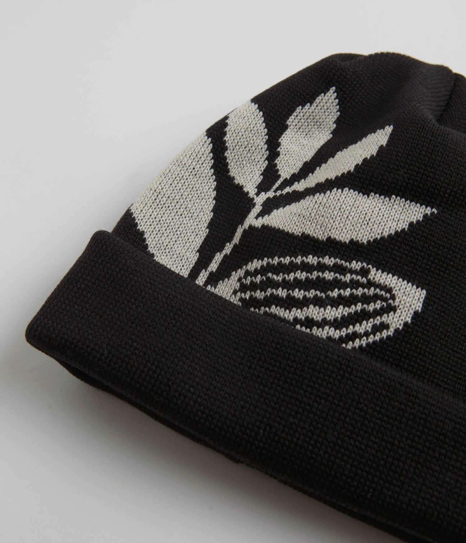 Magenta Plantasia Knit Beanie in Black. Single sized and made from a wool and acrylic blend, this Magenta beanie is designed with a stretchy rib knit face. Featuring an adjustable turn-up cuff, this black Magenta beanie is finished with tonal stitched seams and a jacquard plant logo.