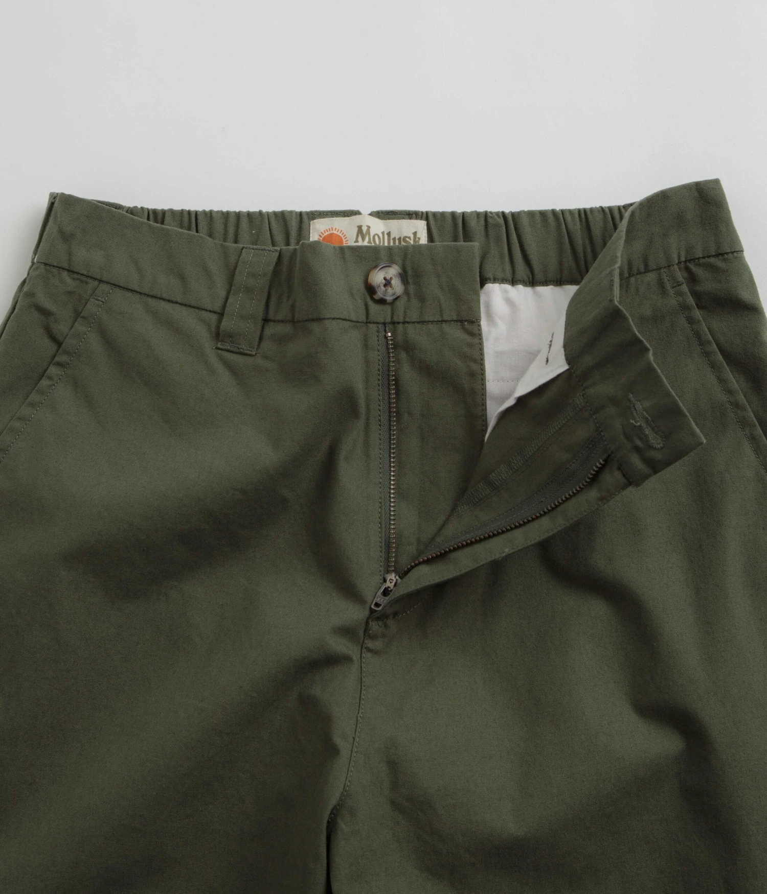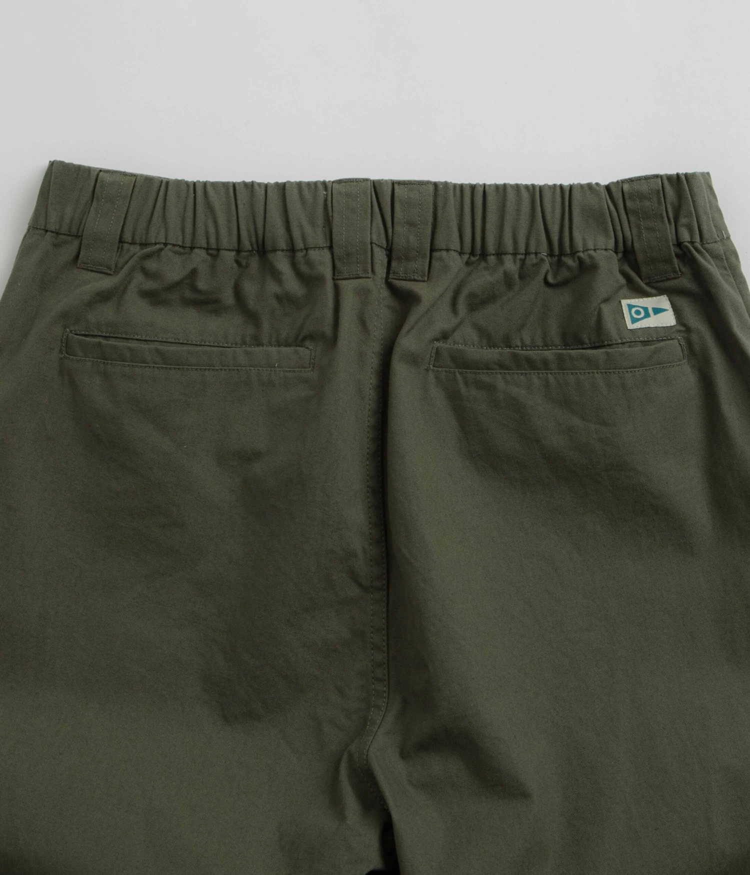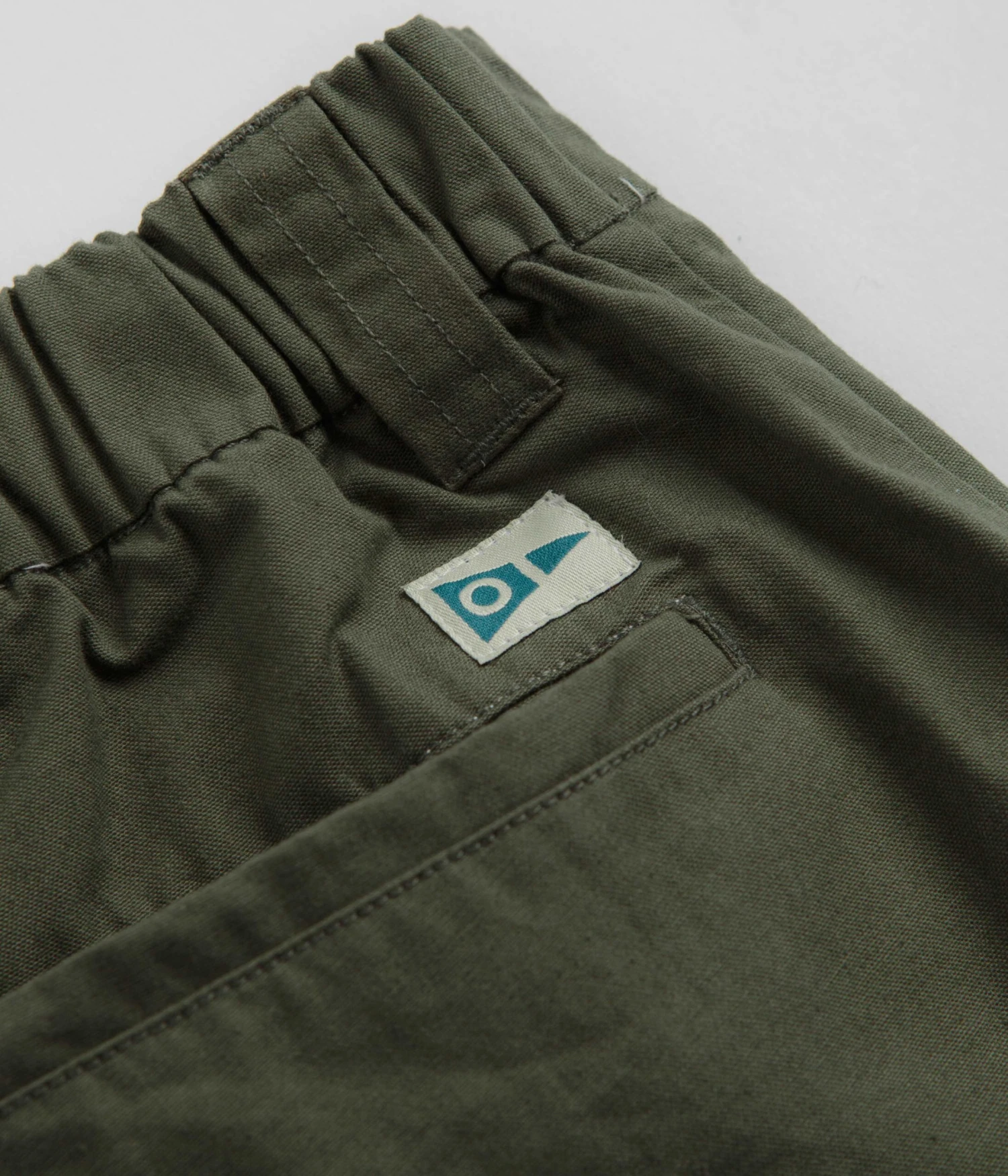 Mollusk Boat Pants in Dark Moss. Chino inspired with a relaxed fitting, these Mollusk pants are made from 100% cotton. Featuring a semi-elasticated waistband, a single button secured zipper fly and a straight leg, these moss green Mollusk boat pants are finished with two front pockets, rear pockets and with woven flag label branding.