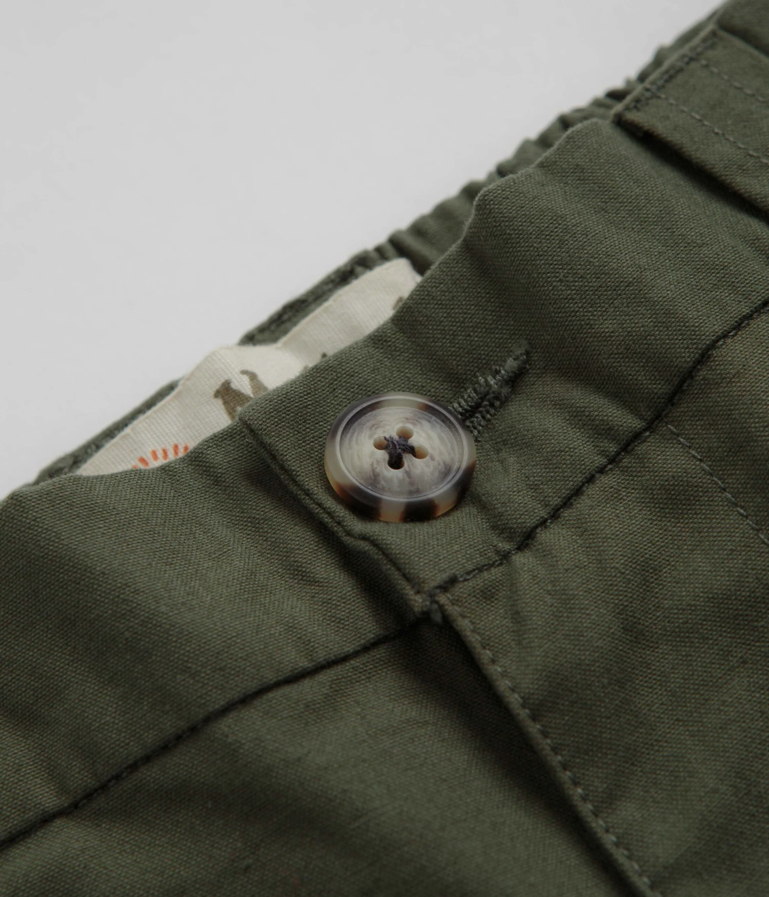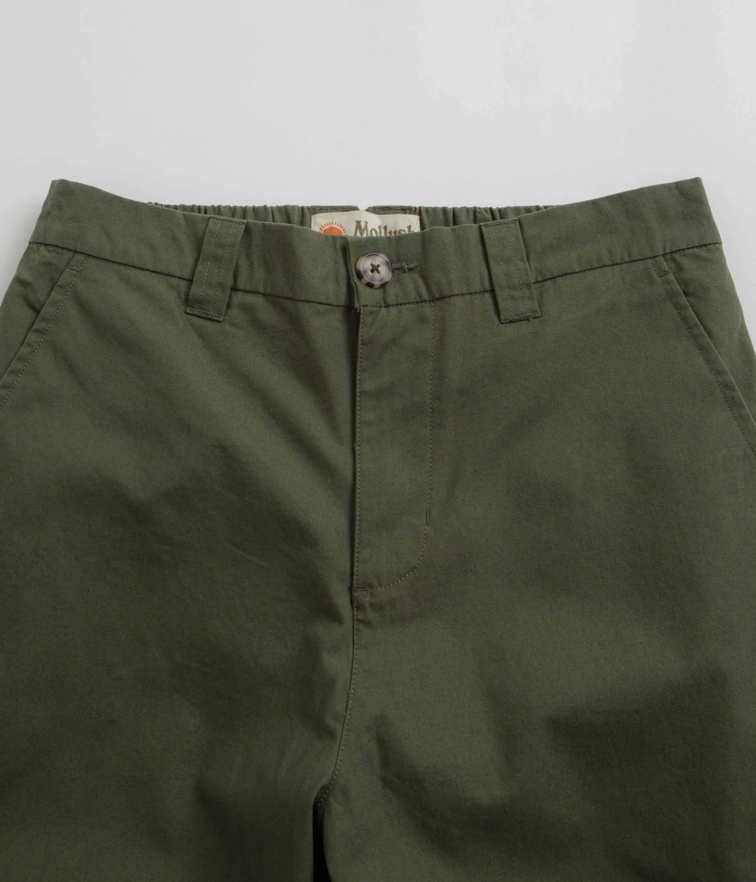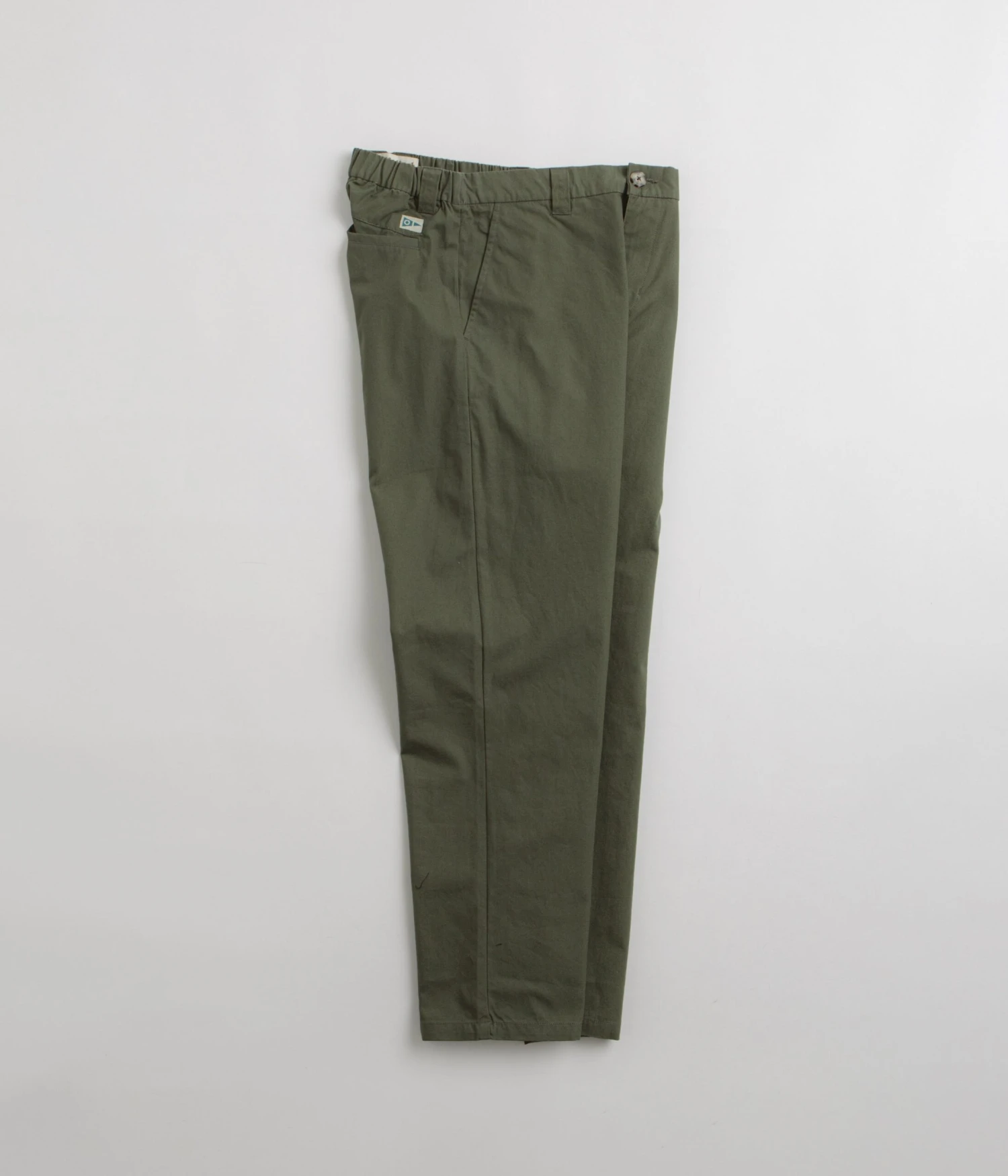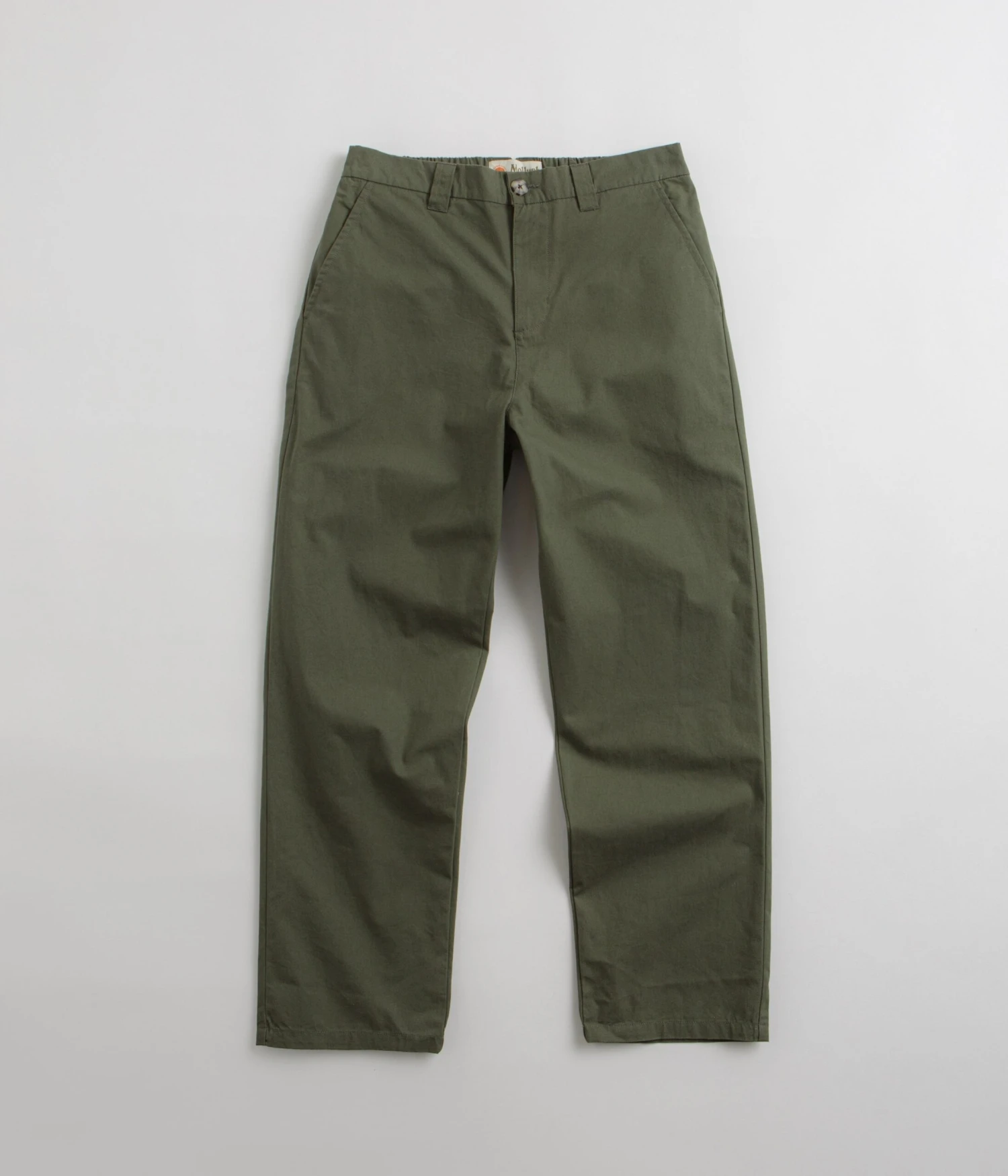 Mollusk Boat Pants in Dark Moss. Chino inspired with a relaxed fitting, these Mollusk pants are made from 100% cotton. Featuring a semi-elasticated waistband, a single button secured zipper fly and a straight leg, these moss green Mollusk boat pants are finished with two front pockets, rear pockets and with woven flag label branding.