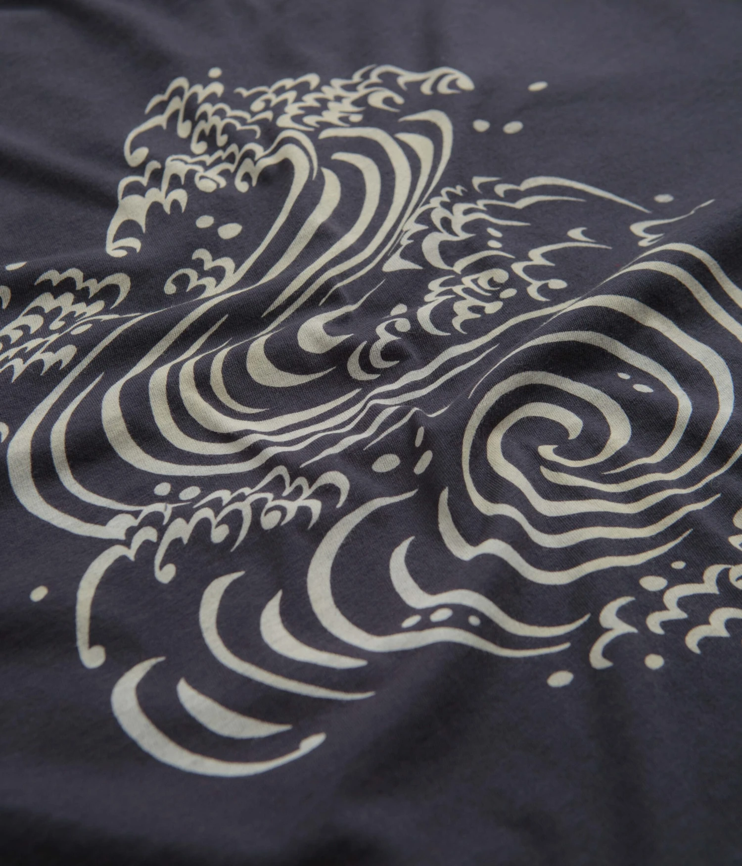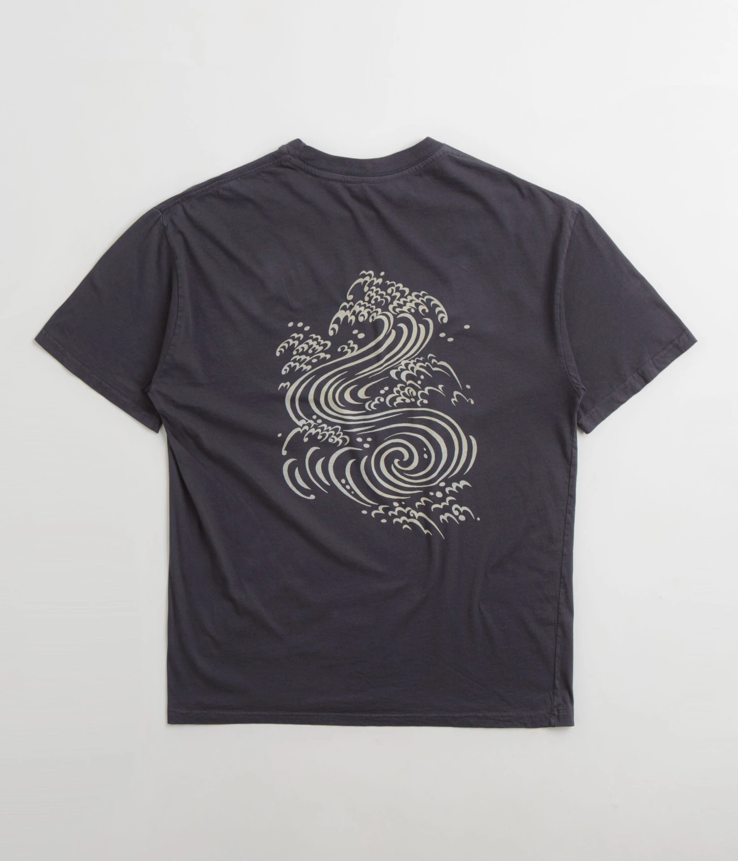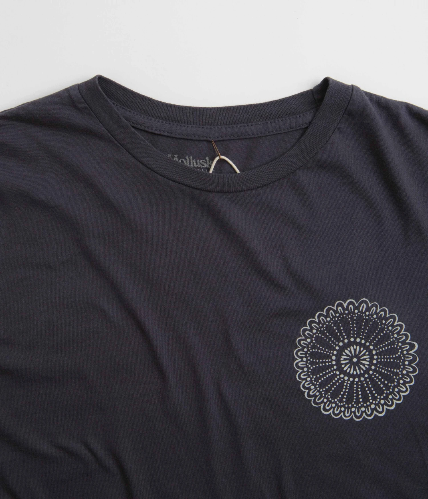 Mollusk Chrysanthemum T-Shirt in Black Indigo. Arriving as part of the brand’s latest release, this Mollusk t-shirt is made from 100% organic cotton. Featuring a flexible rib knit collar and a straight cut hem, this black Mollusk t-shirt is finished with screen printed front and rear graphics.