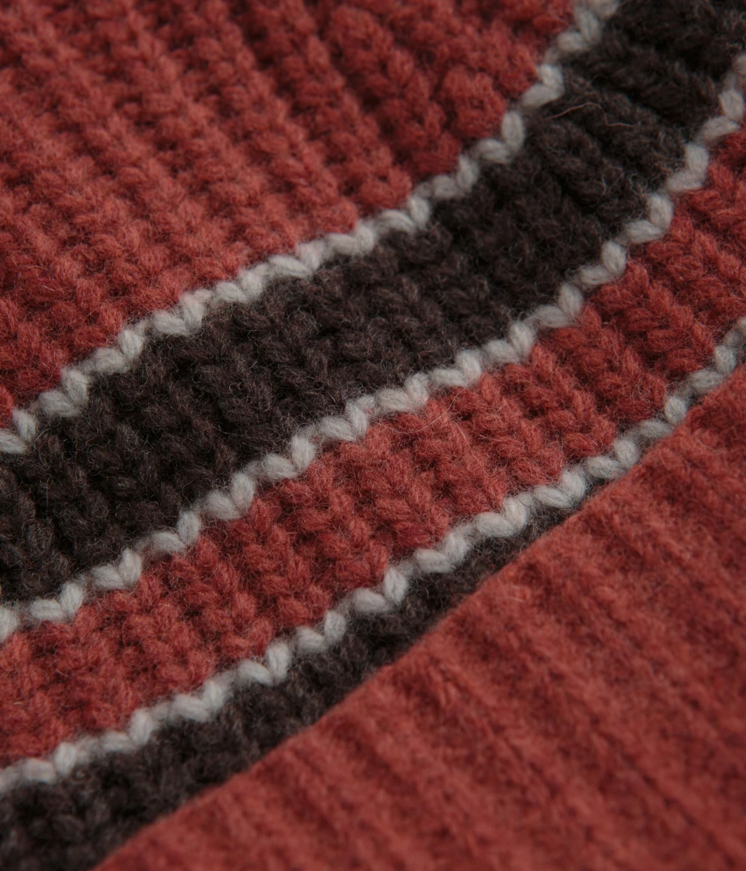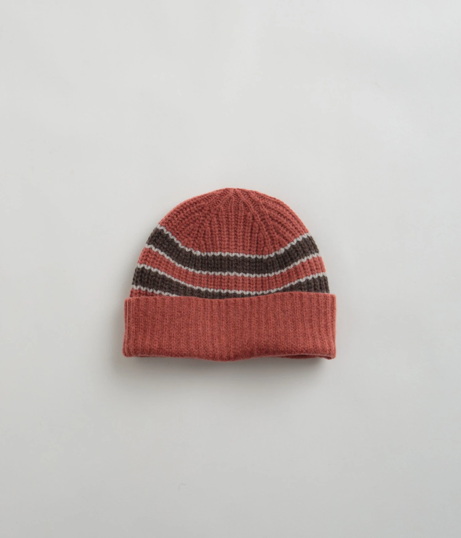 Mollusk County Cork Beanie in Faded Brick. Made from a merino wool and recycled nylon blend, this single sized Mollusk beanie is designed with a stretchy rib knit face. Finished in a shade of burnt red with a fold-over cuff and jacquard stripe detailing.