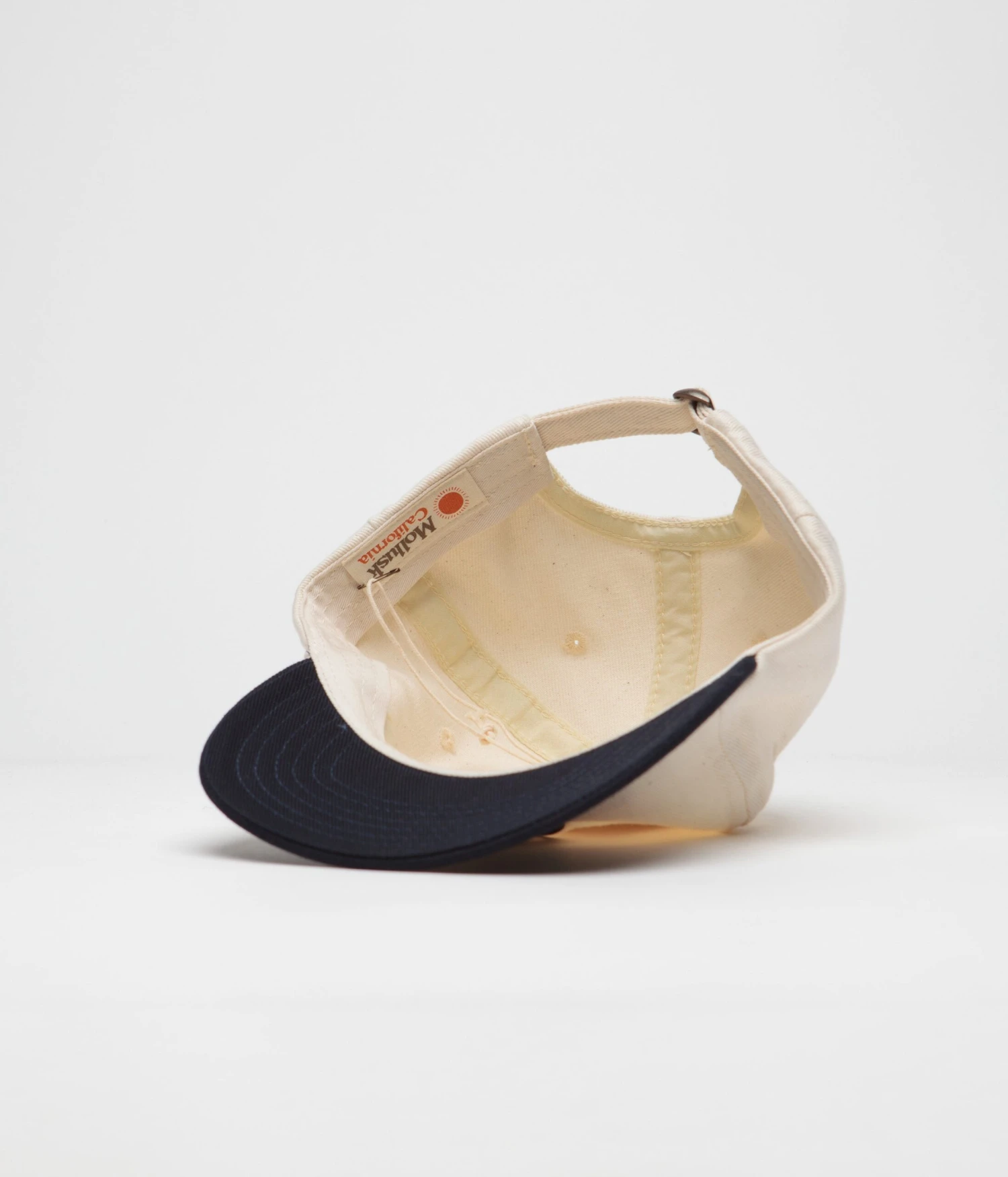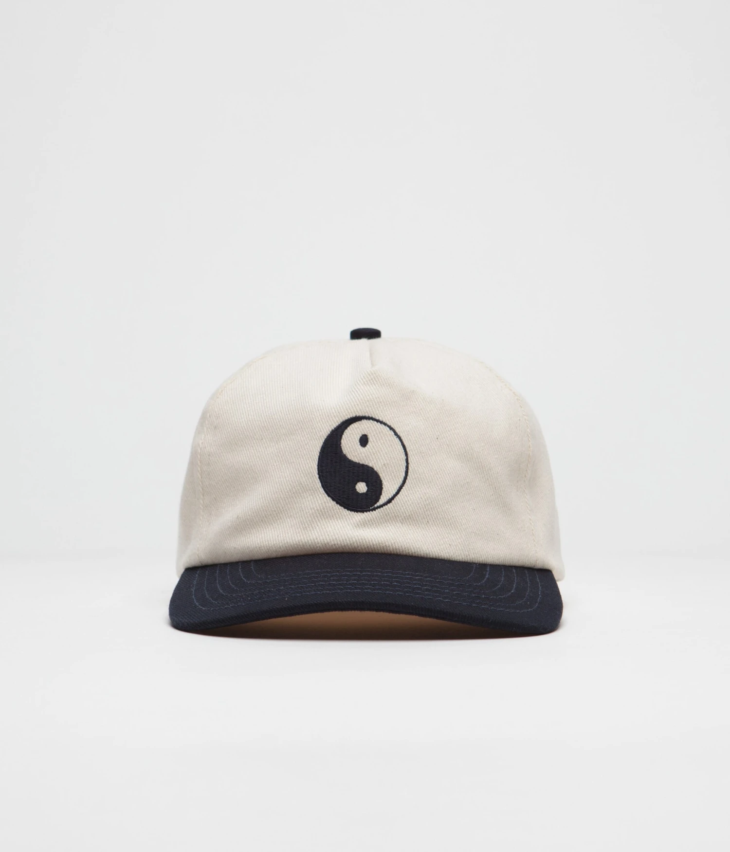 Mollusk Duality Cap in Super Natural. Styled in a two tone monochrome colourway, this single sized Mollusk cap is made from 100% cotton. Featuring a colour block black peak with embroidered ventilation eyelets and an adjustable strap fastening, this 5 panel cap is finished with an embroidered yin-yang logo sewn across the crown.