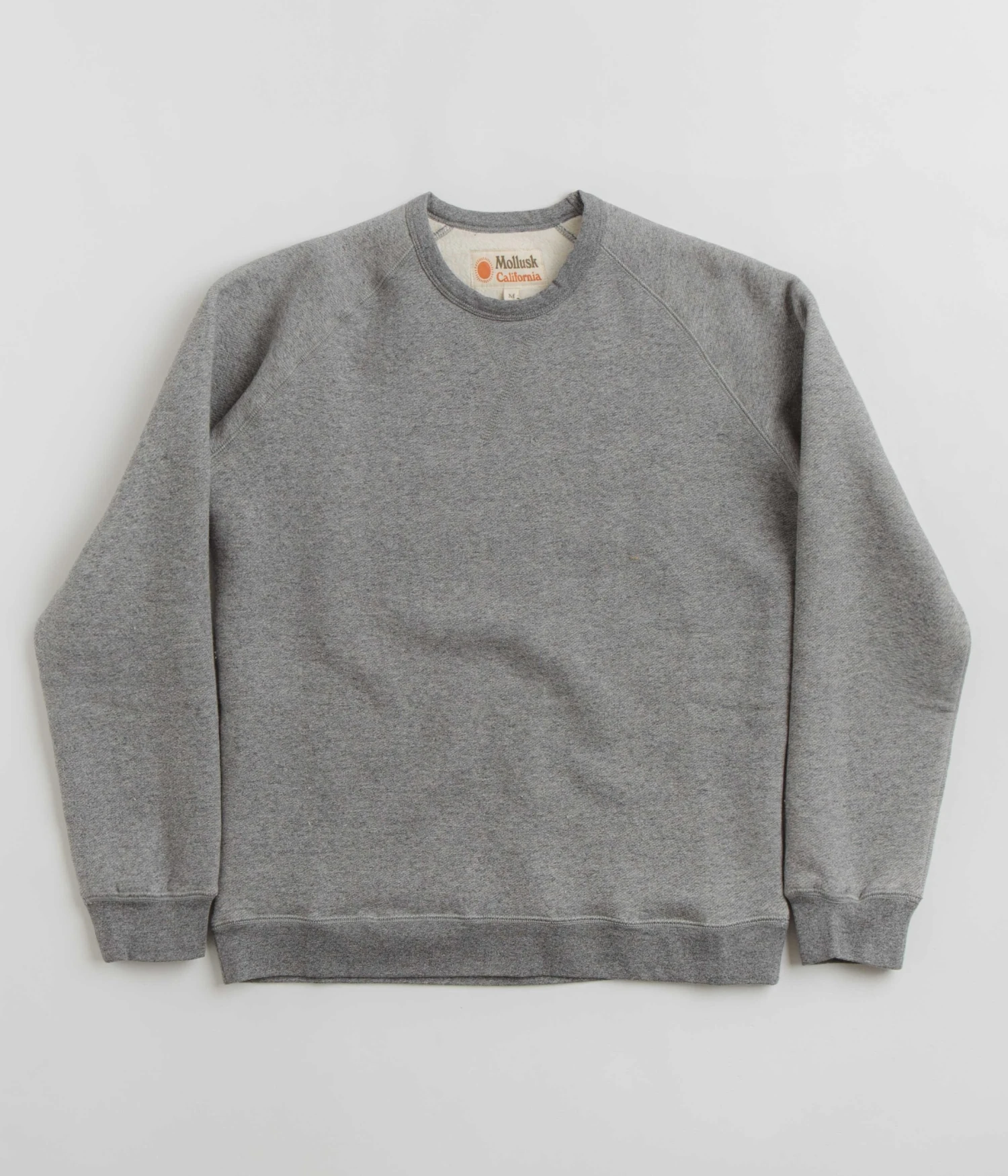 Mollusk Heavy Terry Crewneck Sweatshirt in Heather Grey. Made from a cotton-polyester blend, this regular fitting Mollusk sweatshirt is designed with a yarn dyed fabrication and with a classic rib knit collar. Featuring raglan sleeves, ribbed cuffs and a woven elastic hem, this grey Mollusk sweater is finished with tonal stitched seams.