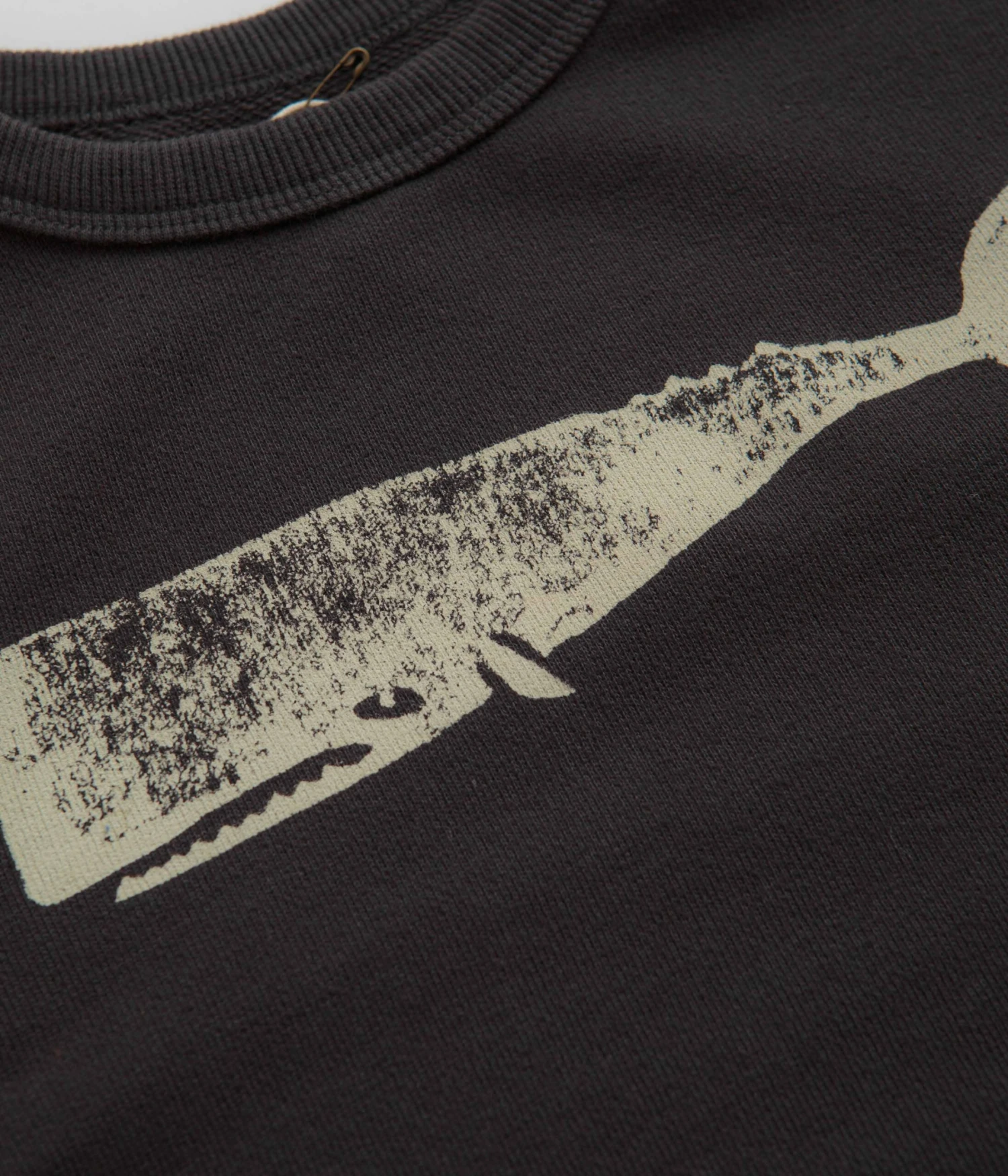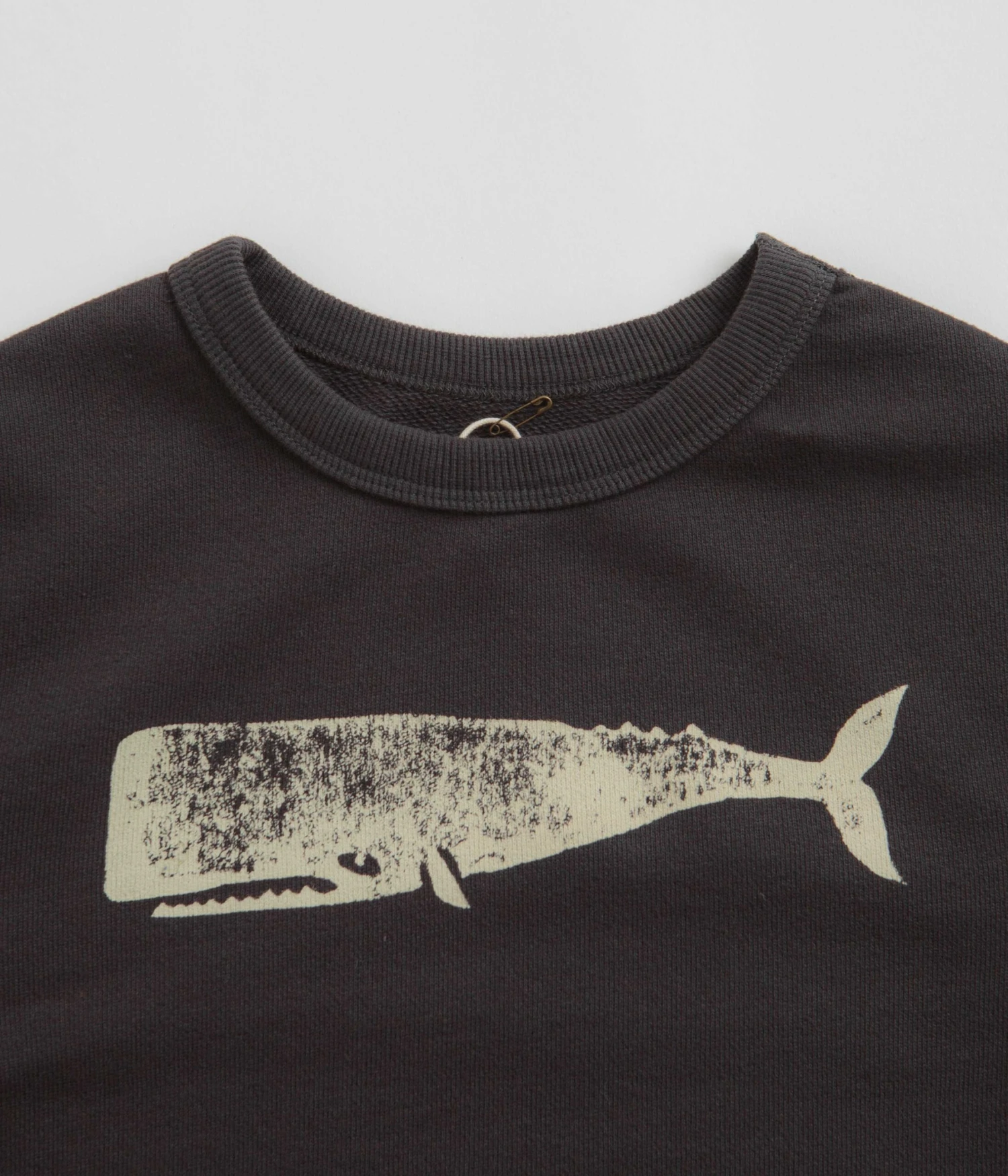 Mollusk Kids Whale Crewneck Sweatshirt in Faded Navy. Tailored to a regular fitting from 100% cotton, this peached French terry Mollusk sweatshirt is designed with a classic crew collar and ribbed cuffs. Finished in a shade of navy with a woven elastic hem and with a printed whale chest graphic.