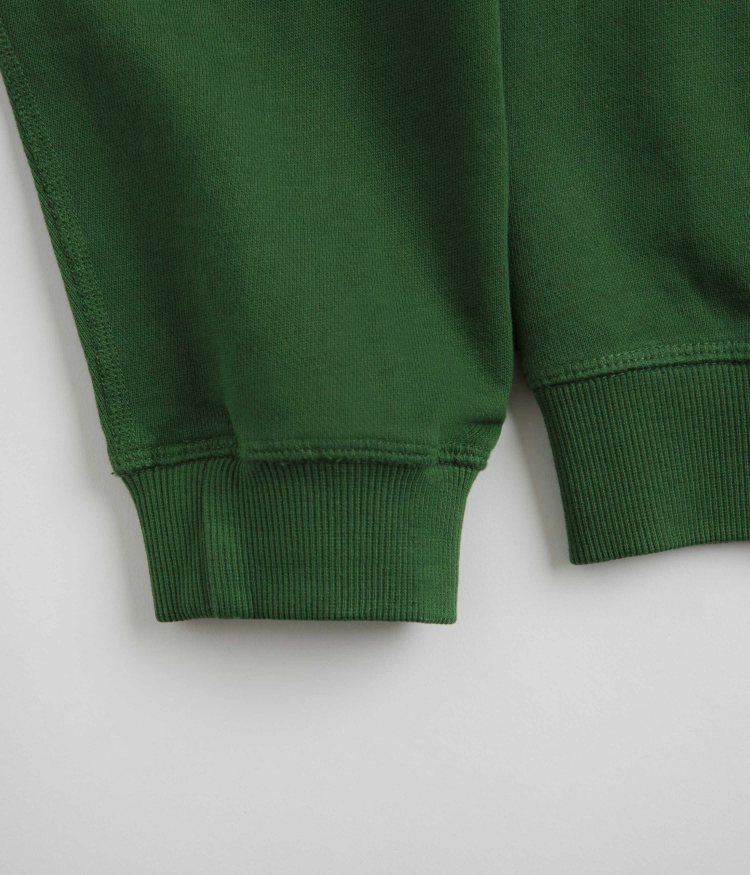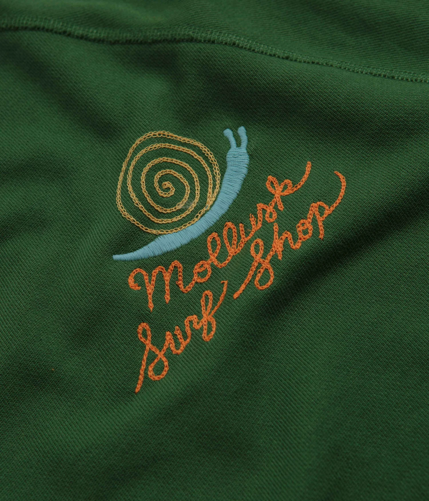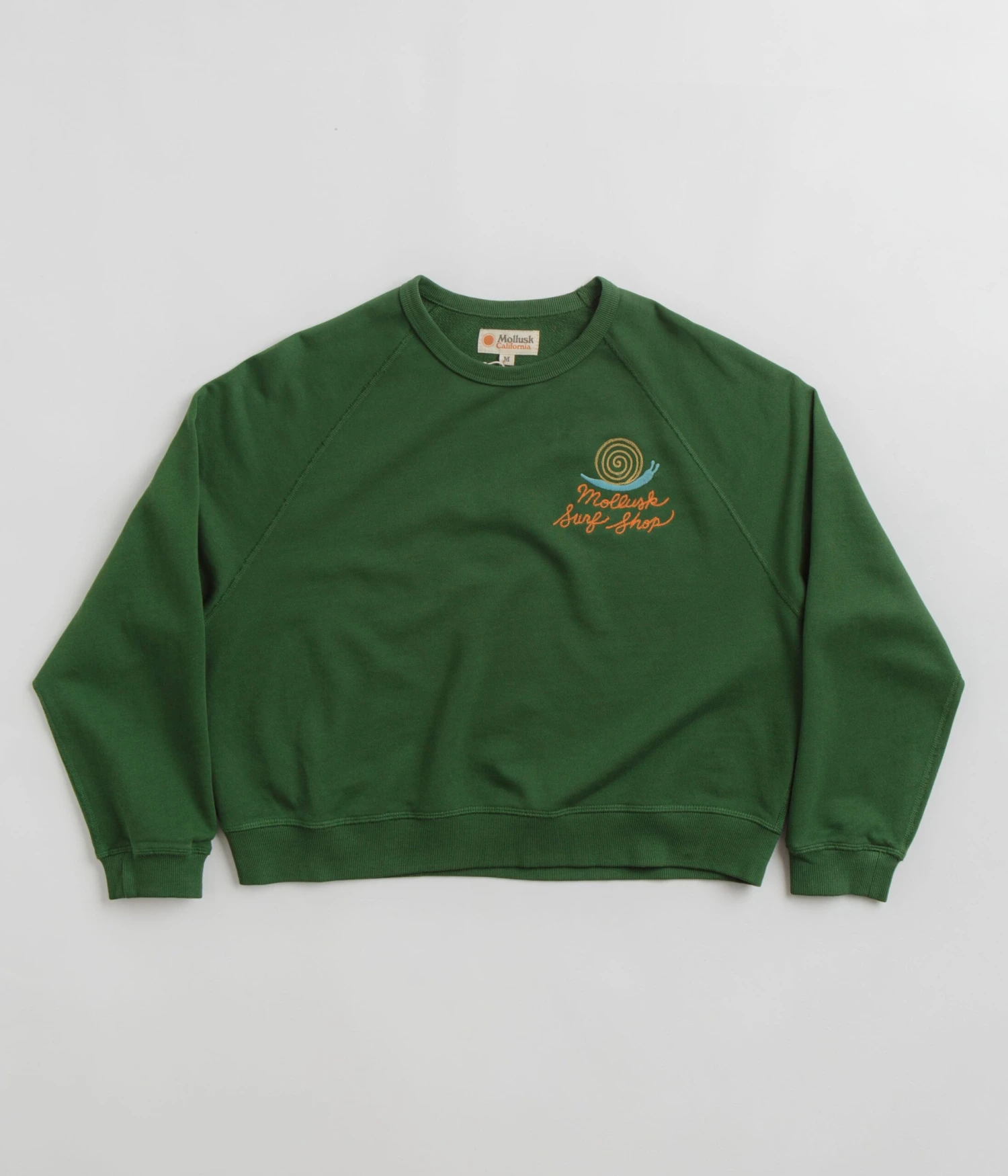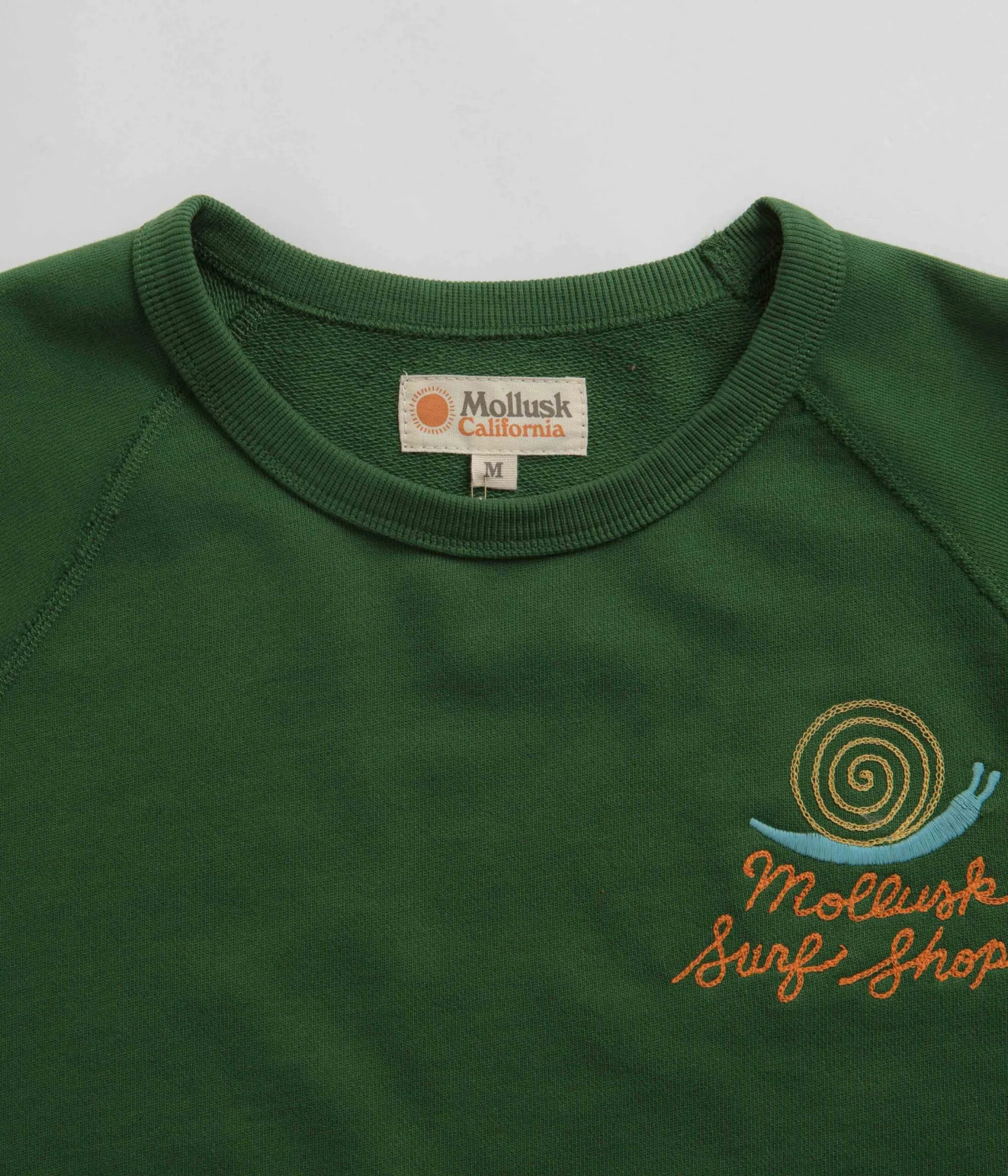Mollusk Womens Snail Crewneck Sweatshirt in True Green. Tailored to a relaxed fitting from 100% cotton, this cropped Mollusk sweatshirt is designed with embroidered artwork. Featuring a broad crew collar, raglan sleeves and ribbed cuffs, this green Mollusk sweater is finished with a woven elastic rib knit hem.