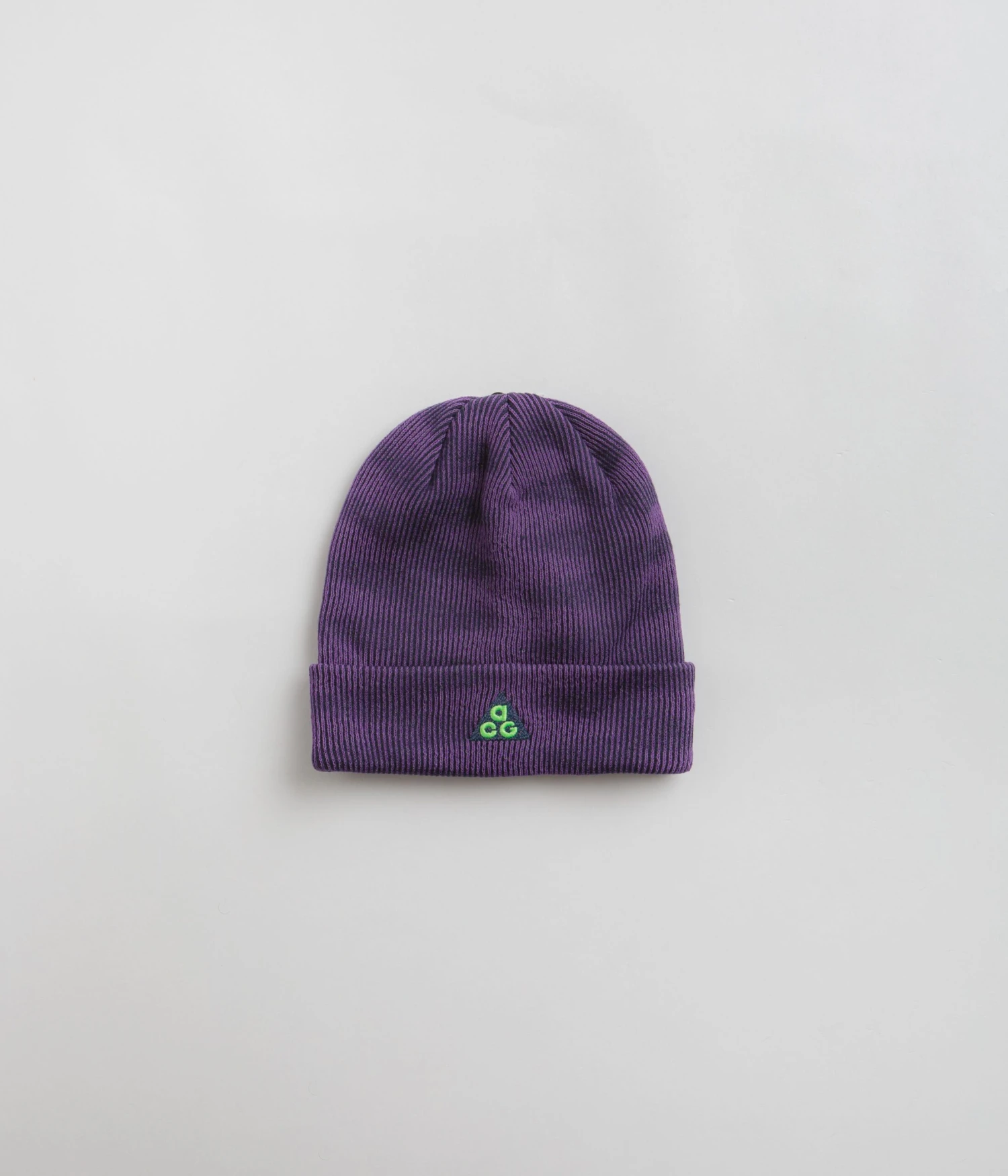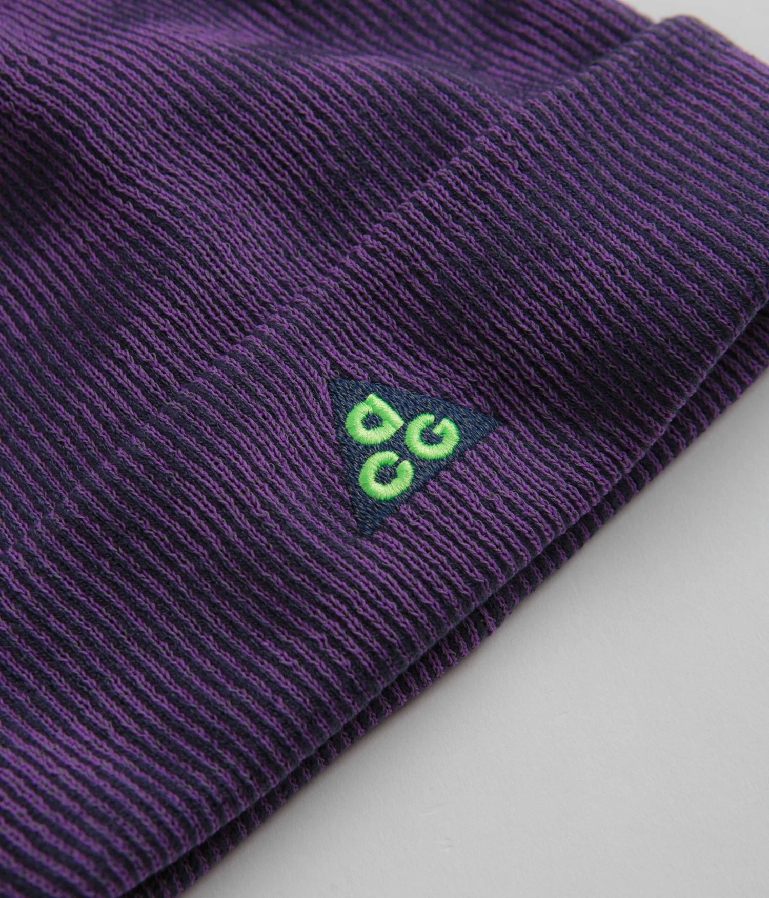 Nike ACG Peak Beanie in Purple Ink and Purple Cosmos. Single sized and made from 100% polyester, this rib knit Nike ACG beanie is designed with a stretchy fabric face. Finished in a shade of purple with an embroidered ACG crown logo.