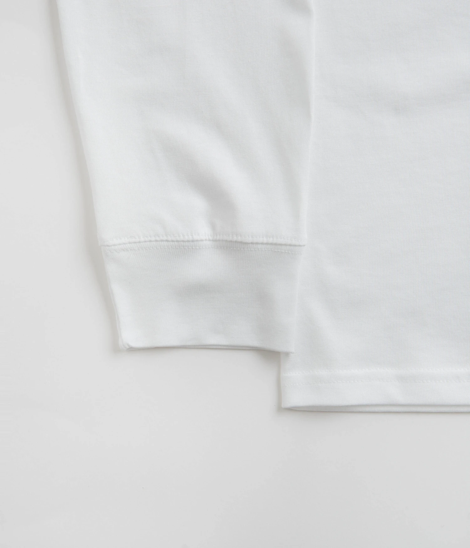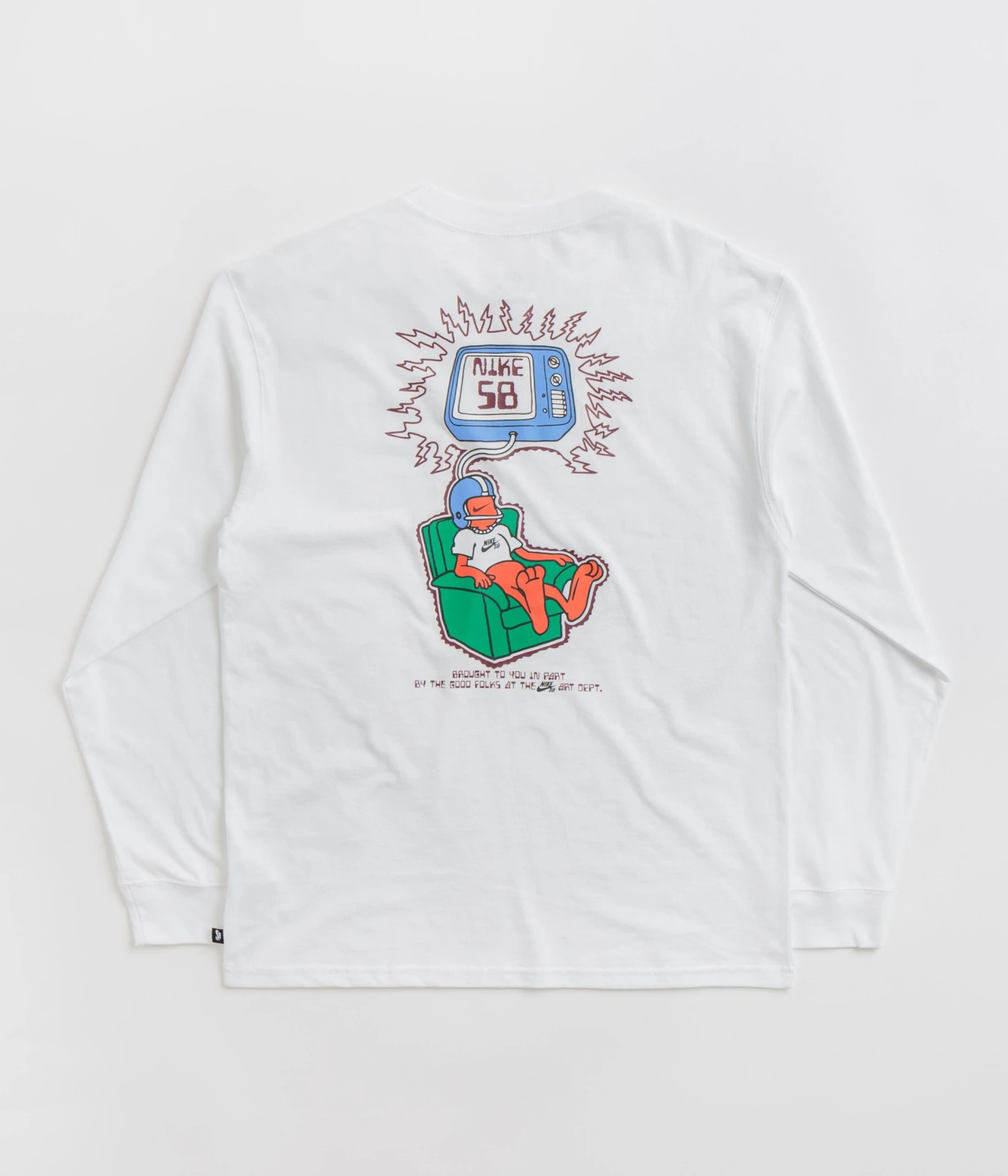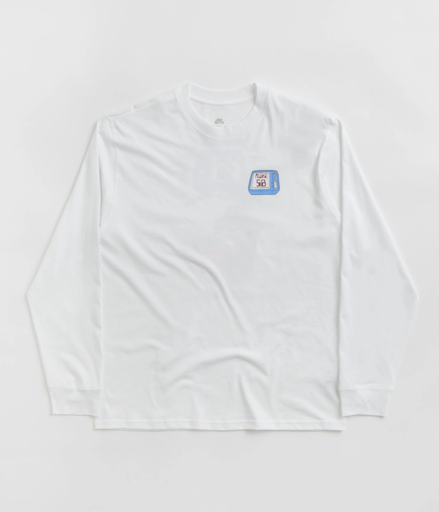 Nike SB Brainwash Long Sleeve T-Shirt in White. Part of the brand’s latest release, this loose fitting Nike SB t-shirt is made from 100% midweight cotton. Featuring dropped shoulders, a rib knit collar and ribbed cuffs, this white Nike SB t-shirt is finished with flag label detailing and with printed front and rear artwork.