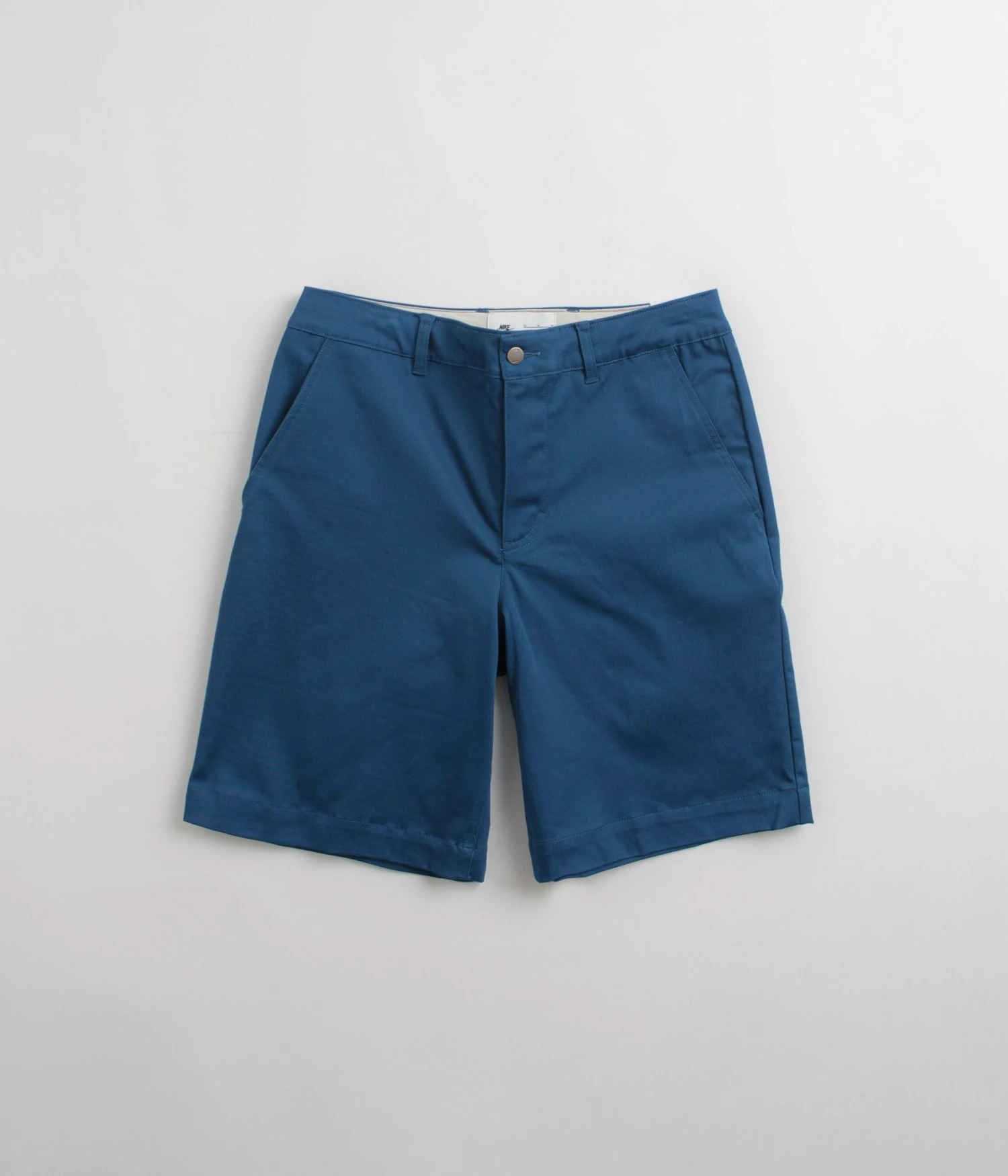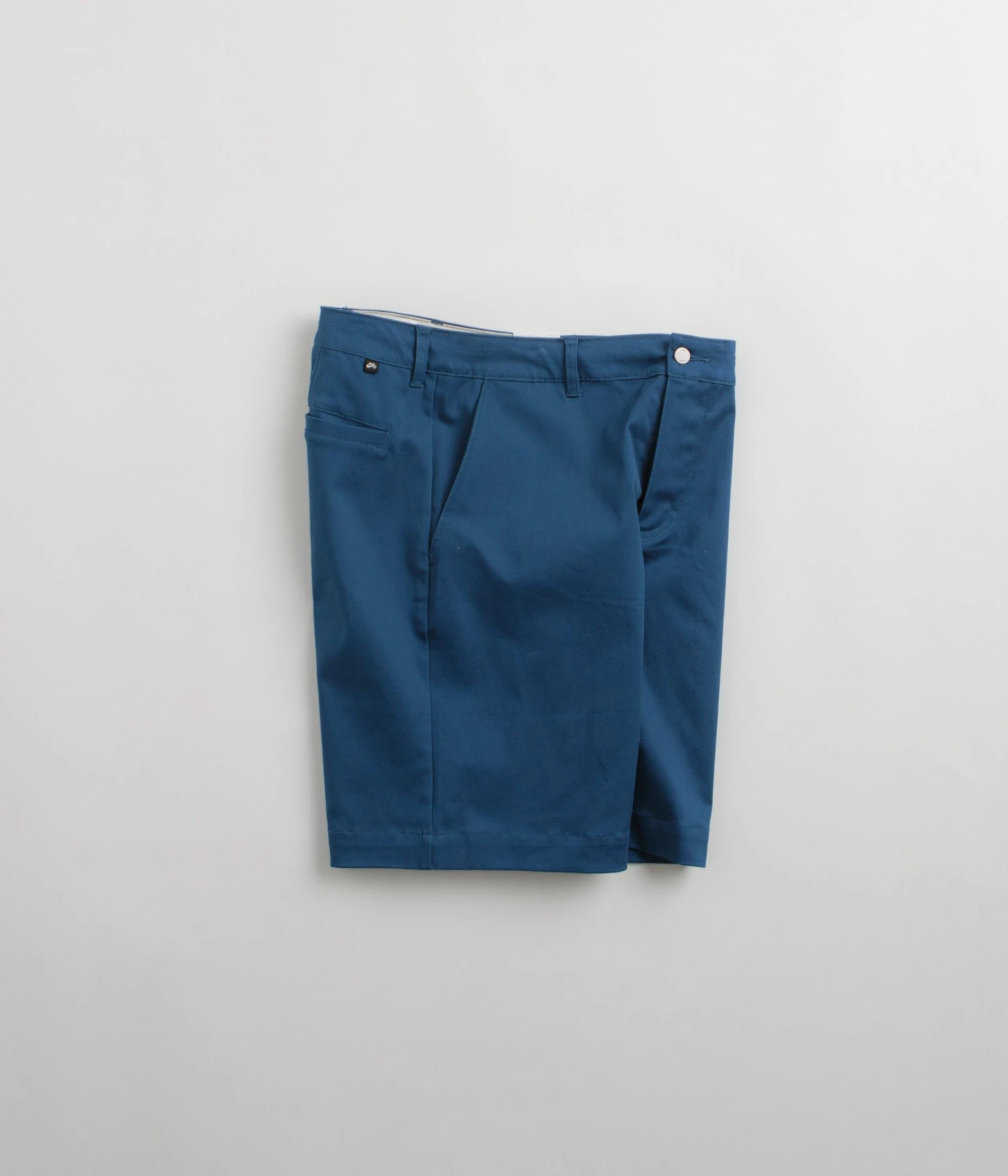 Nike SB El Chino Shorts in Court Blue. Styled with a relaxed fit through the seat, these Nike SB shorts are made from a cotton-elastane blend. Featuring a belt loop waist, a single button secured zipper fly and with two side pockets, these blue Nike SB shorts are finished with two rear pockets and with embroidered logo branding.