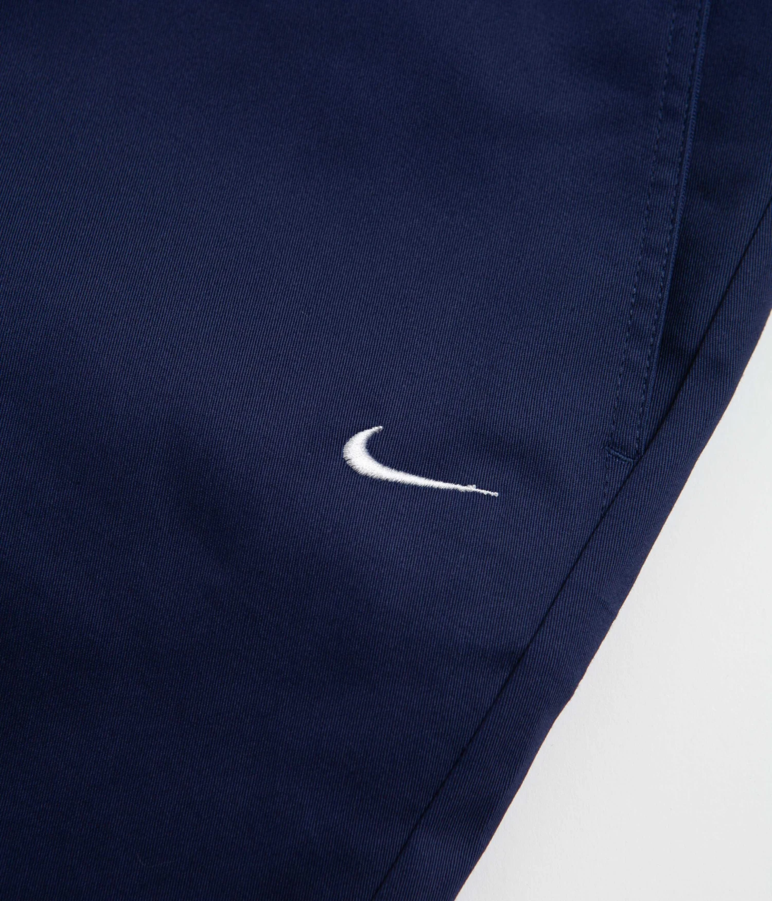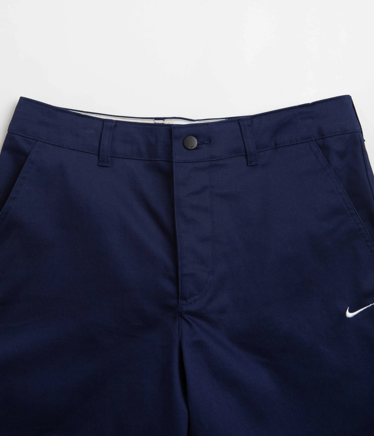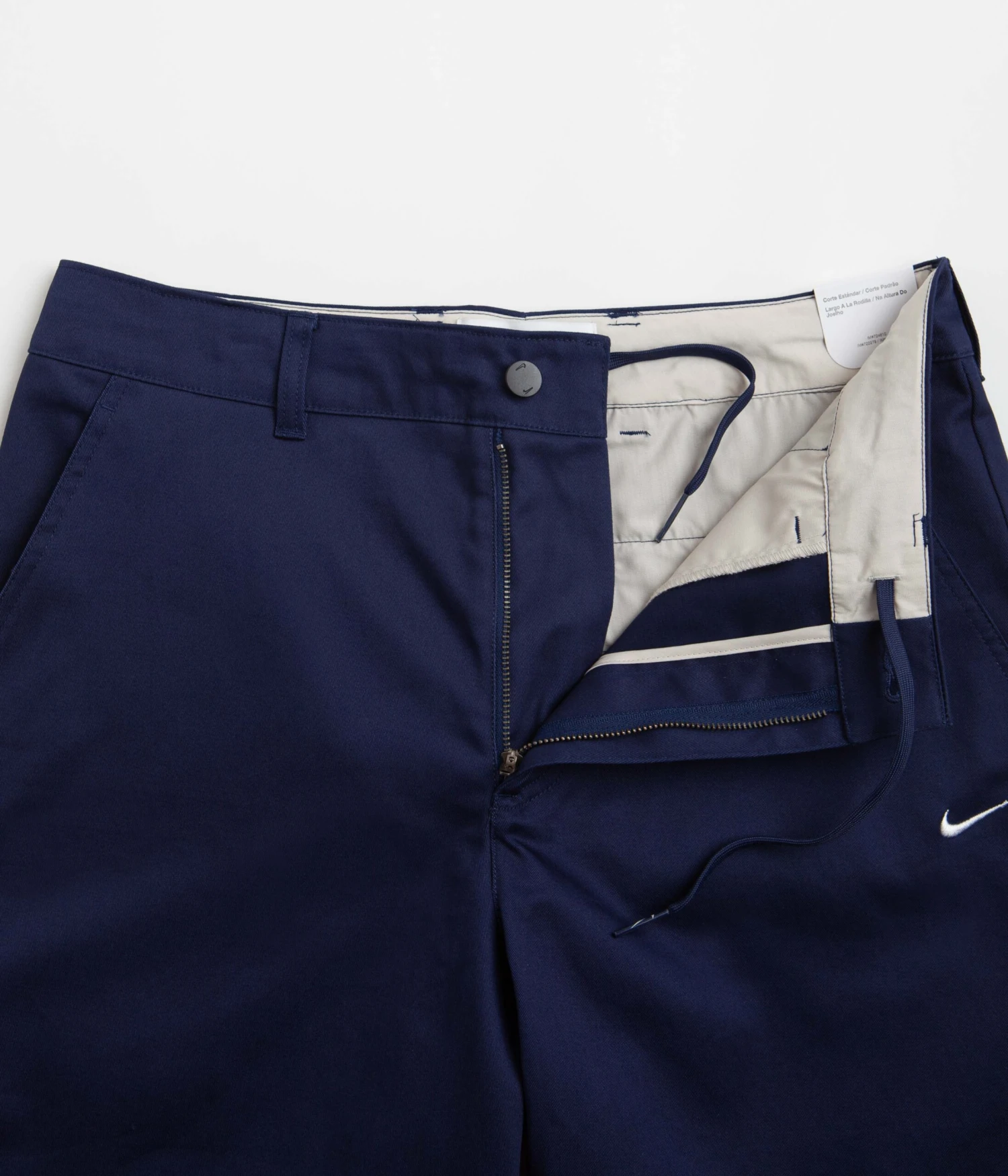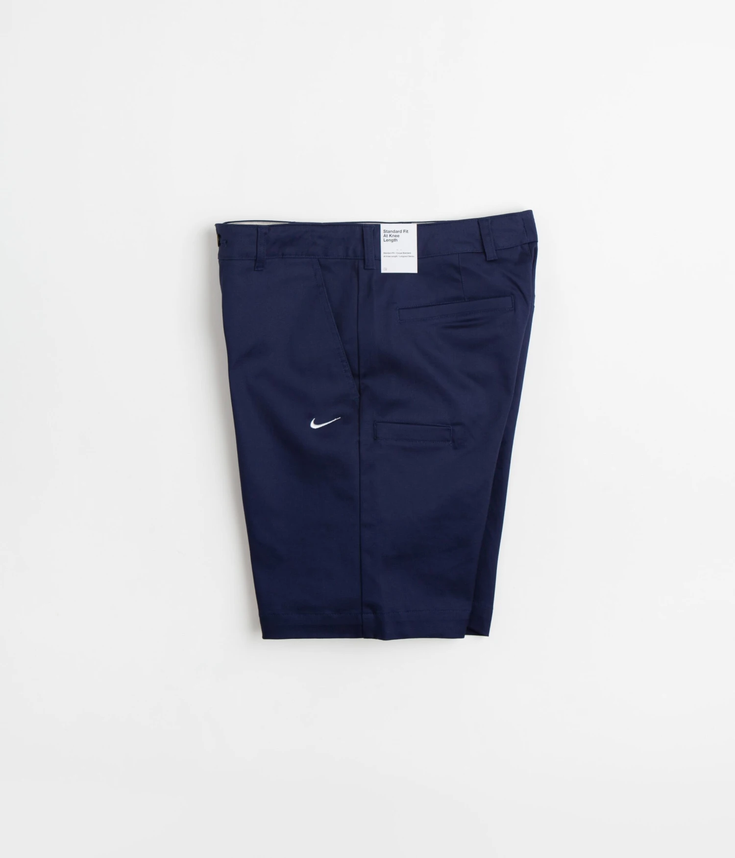 Nike SB El Chino Shorts in Midnight Navy and White. Utility inspired and cut to a knee length, these regular fitting Nike SB shorts are made from a cotton-spandex blend. Featuring a classic belt loop waistband, a single button secured fly and tonal stitched seams, these navy Nike SB shorts are finished with two side pockets, two rear pockets and with an embroidered Swoosh sewn across the left leg.Â