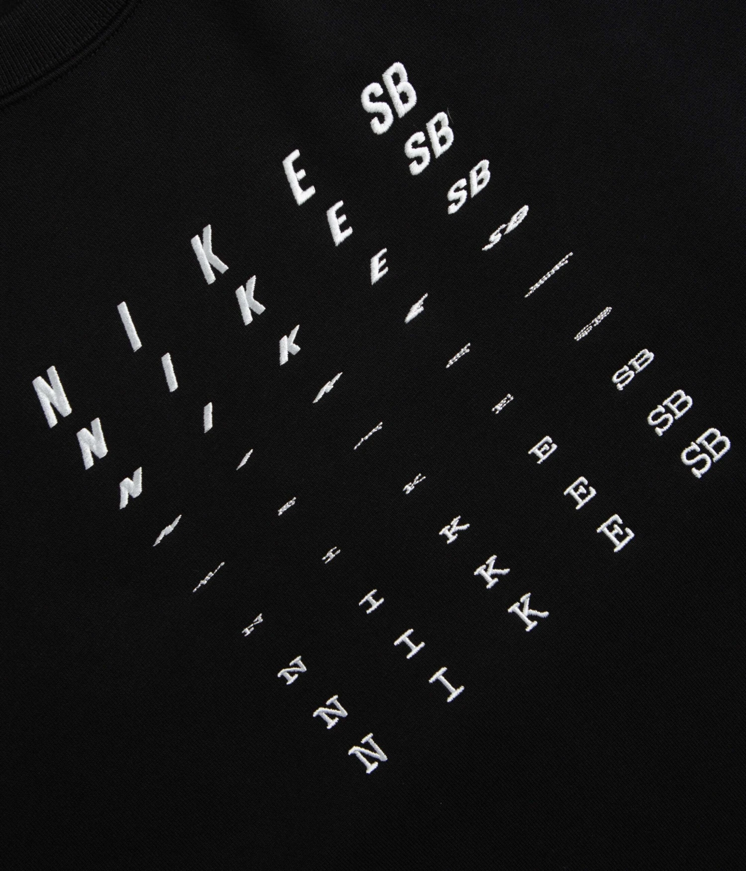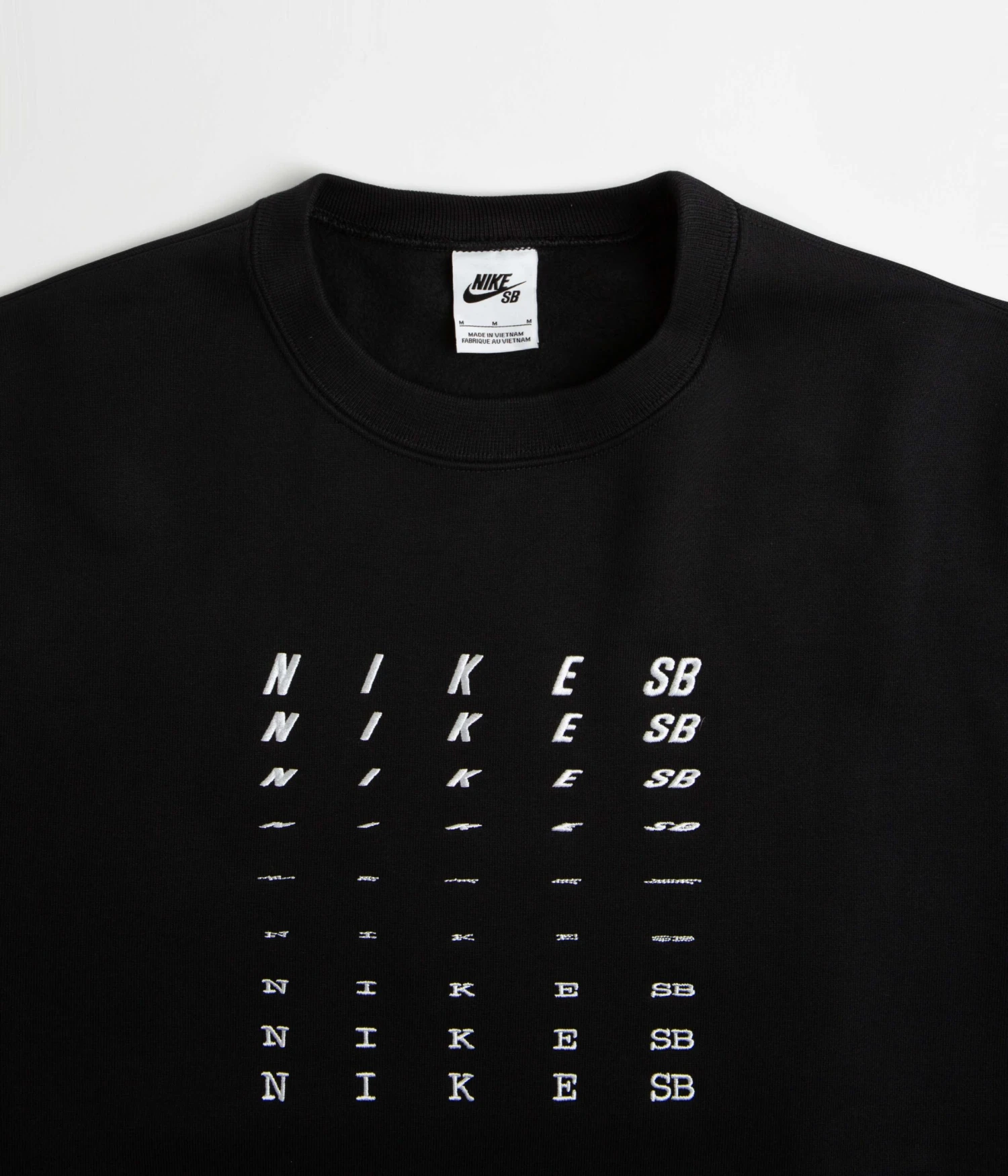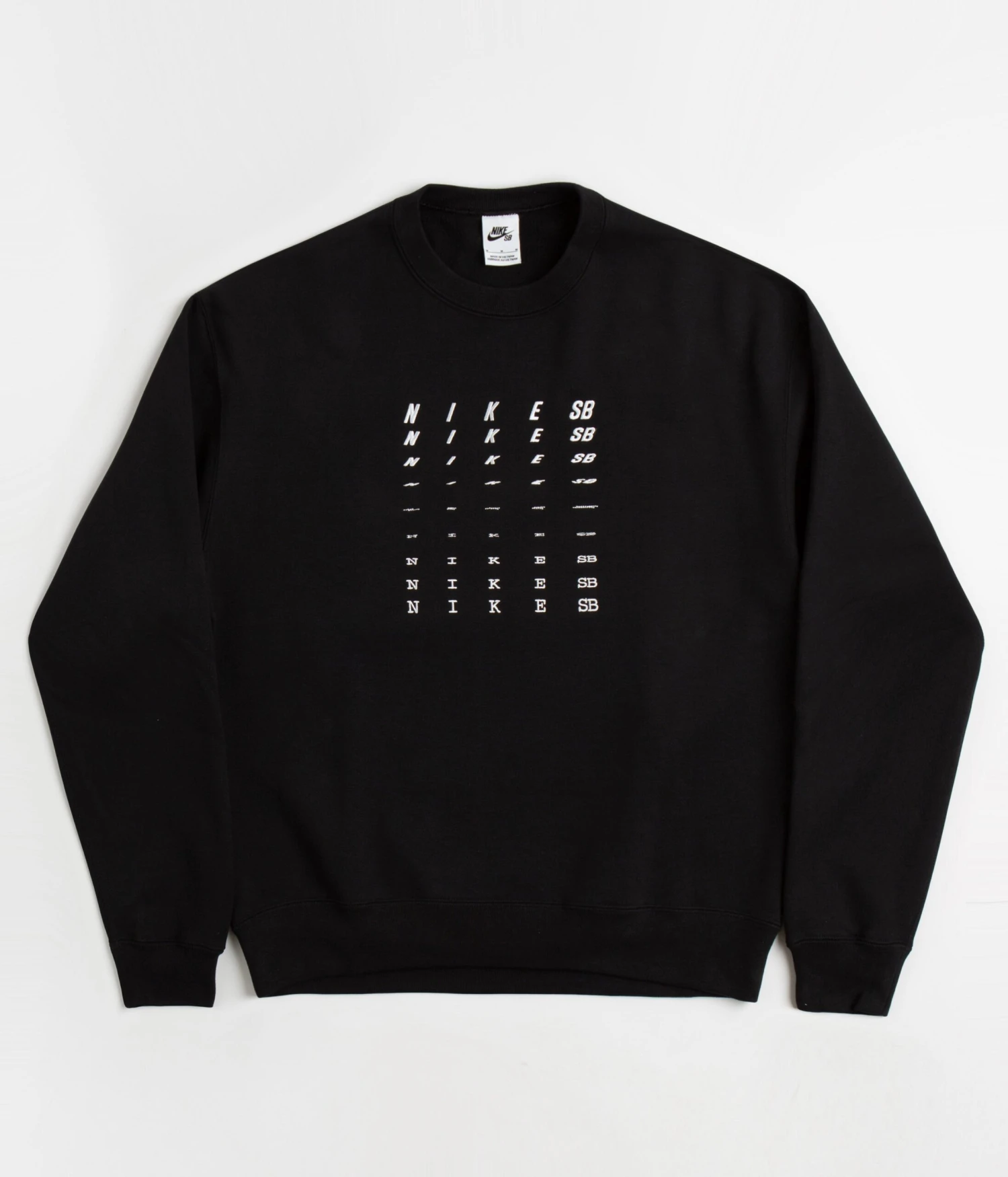 Nike SB Fade Crewneck Sweatshirt in Black. Tailored to a loose fitting from a cotton-polyester blend, this Nike SB sweater is designed with a heavyweight fleece fabrication. Featuring a flexible rib knit collar, dropped shoulders and ribbed cuffs, this black Nike SB sweater is finished with embroidered Y2K inspired graphics.Â