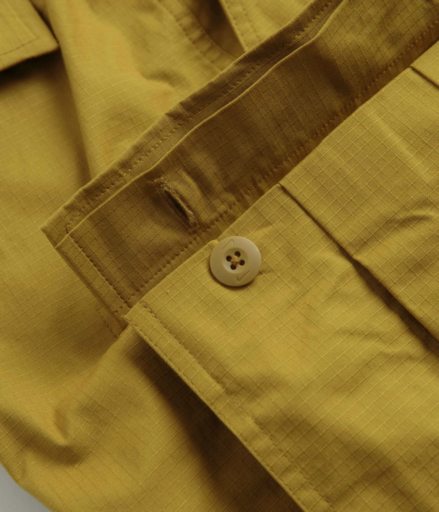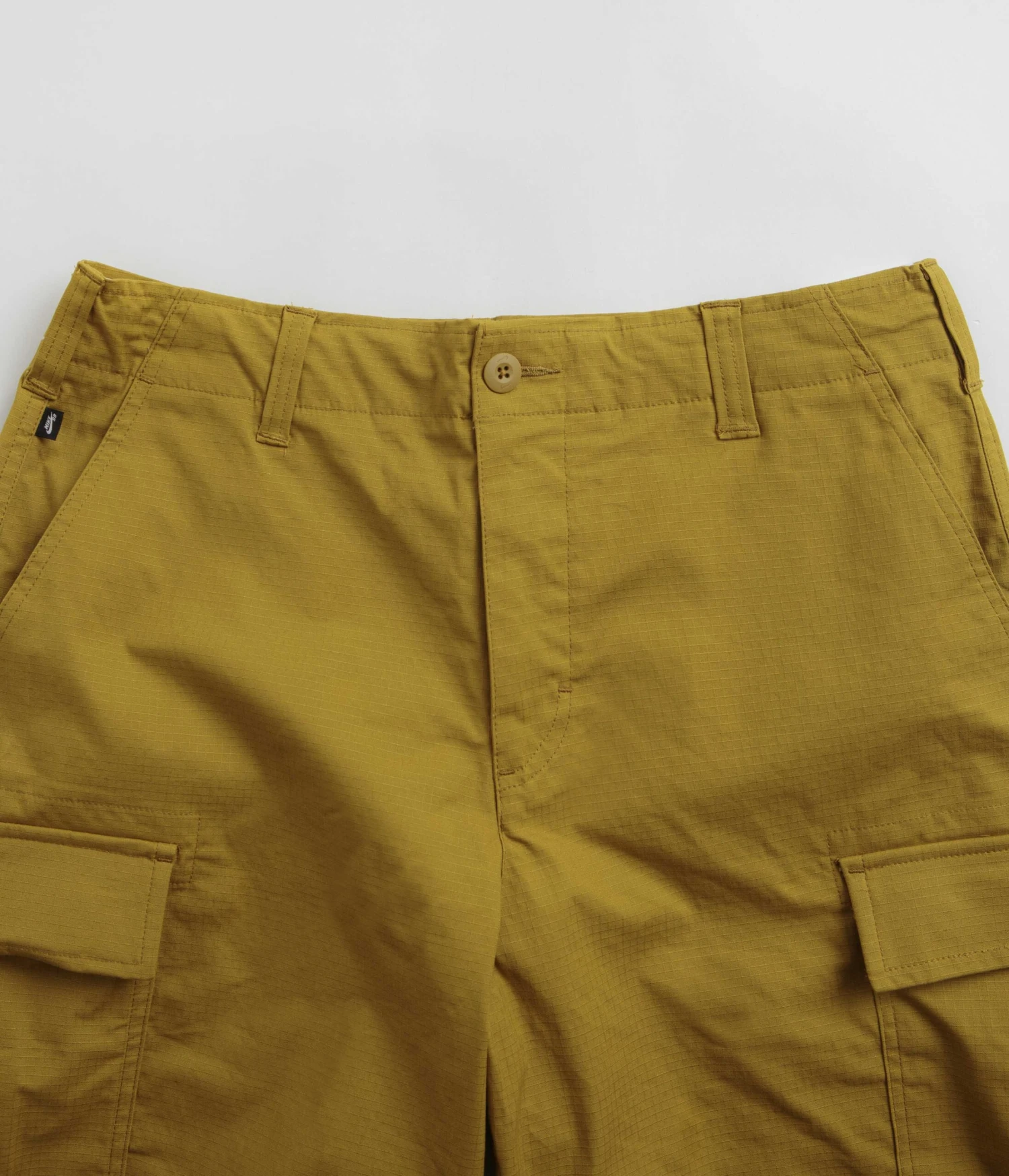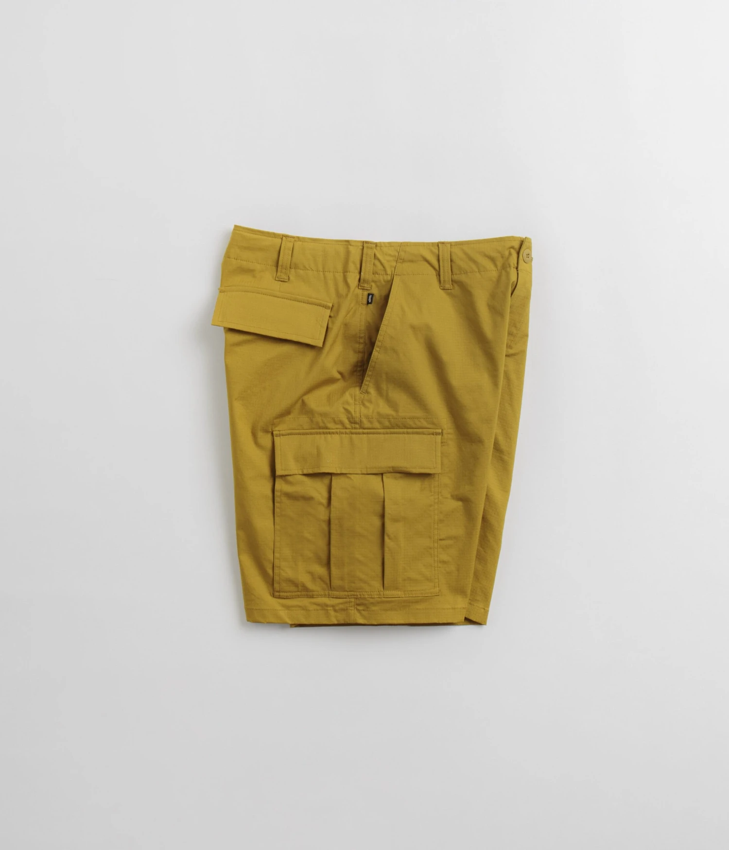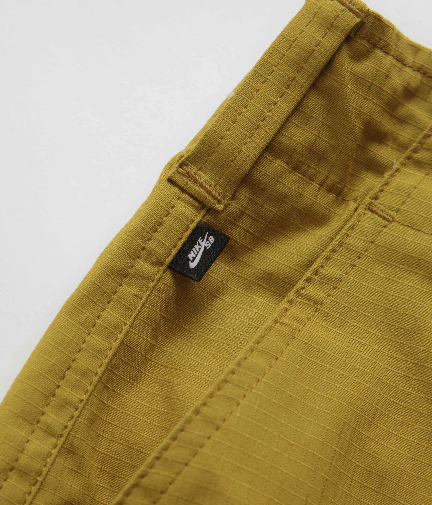 Nike SB Kearny Cargo Shorts in Bronzine. Utility inspired and tailored to a regular fitting, these Nike SB shorts are made from a cotton-elastane blend. Featuring a drawstring adjustable waist, a single button secured zipper fly and a reinforced seat, these knee-length bronze Nike SB shorts are finished with four classic pockets, two cargo pockets and with woven flag label branding.