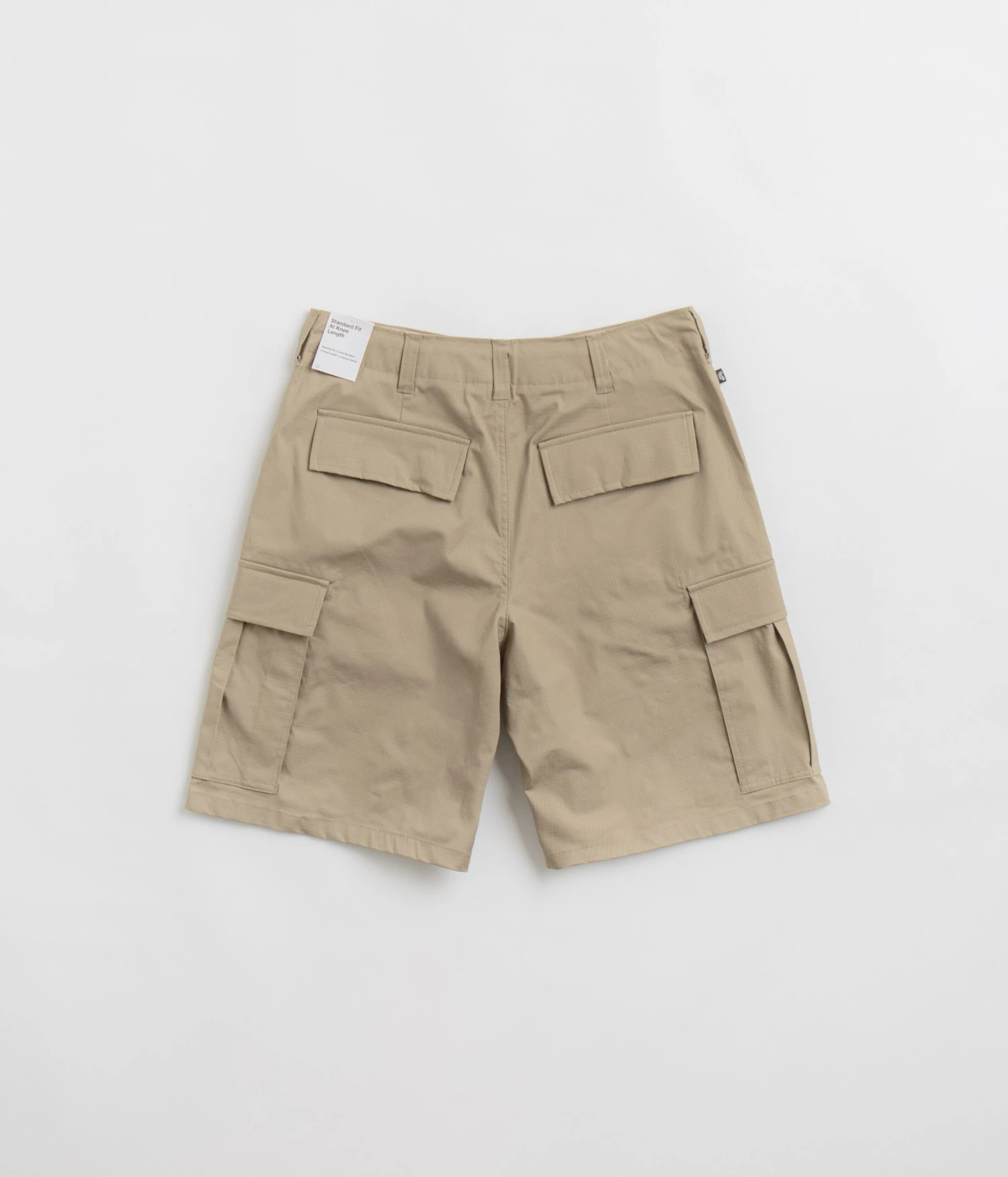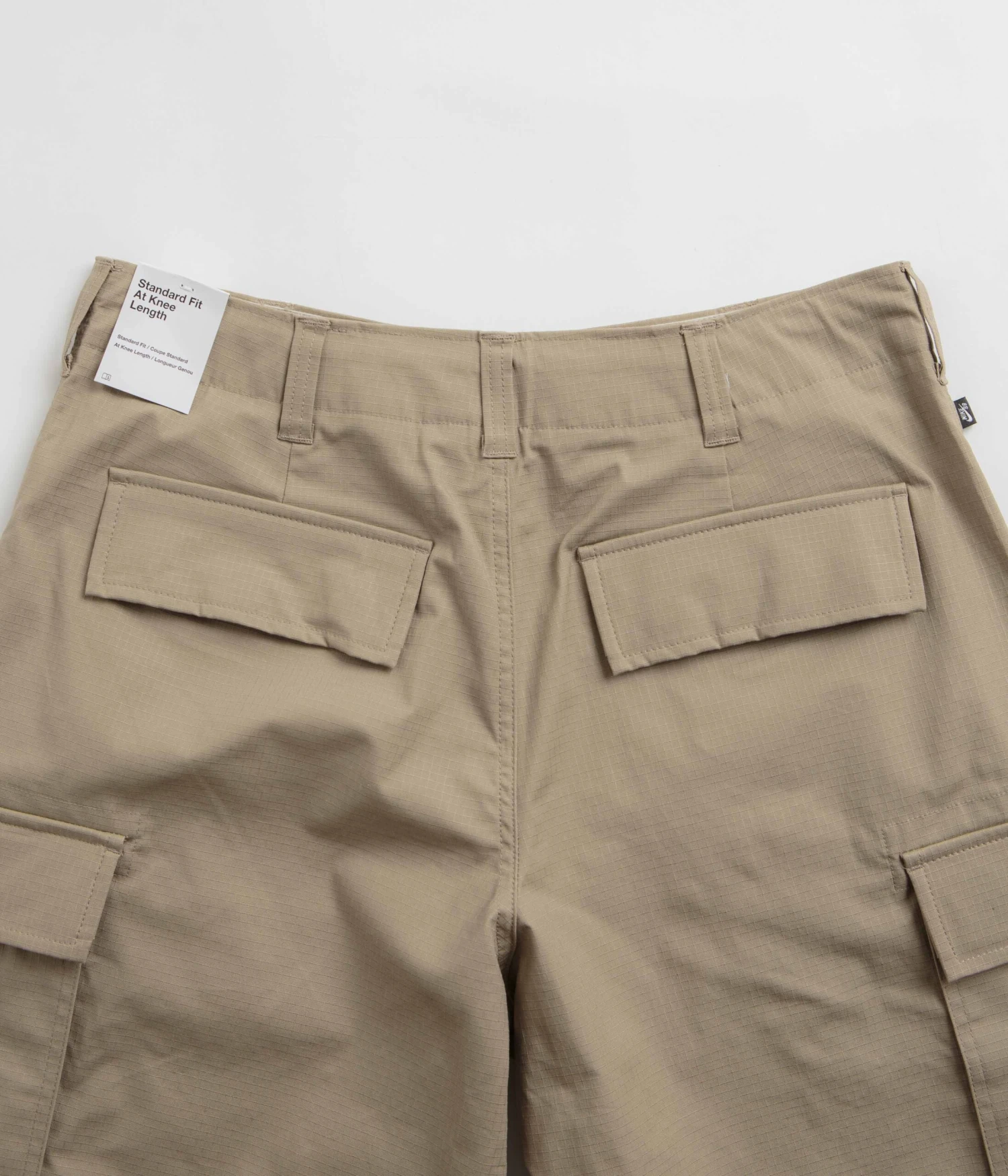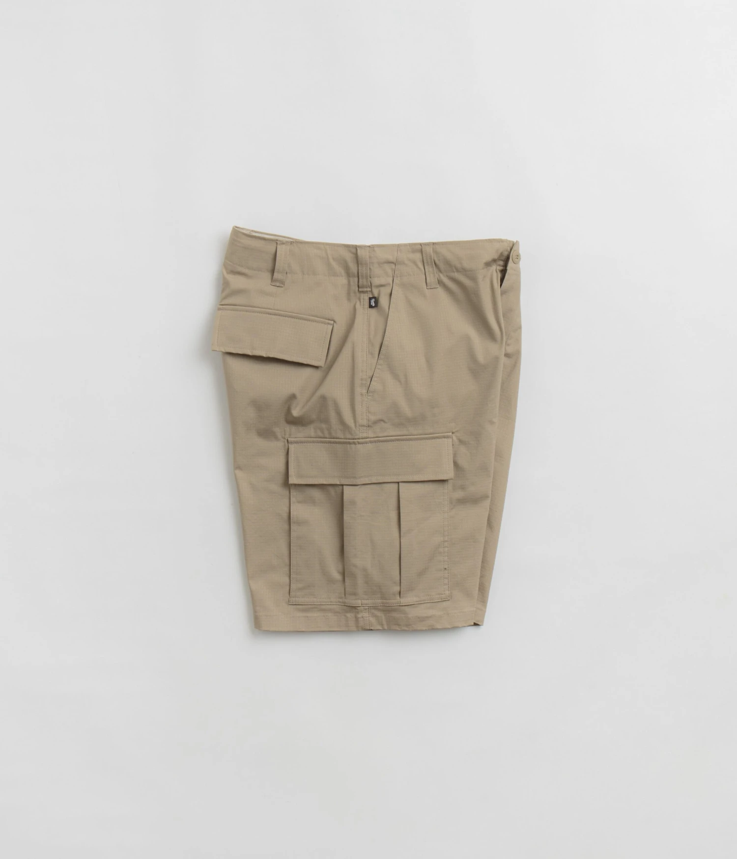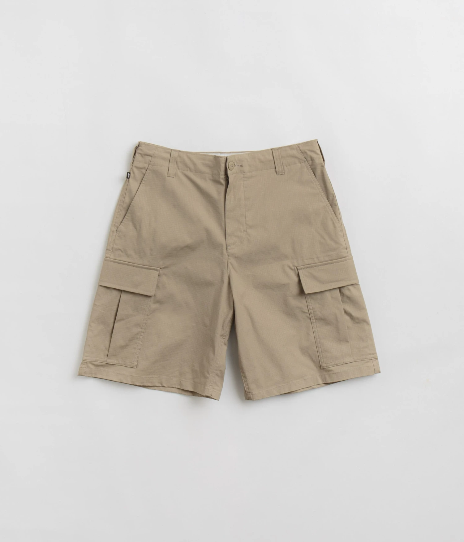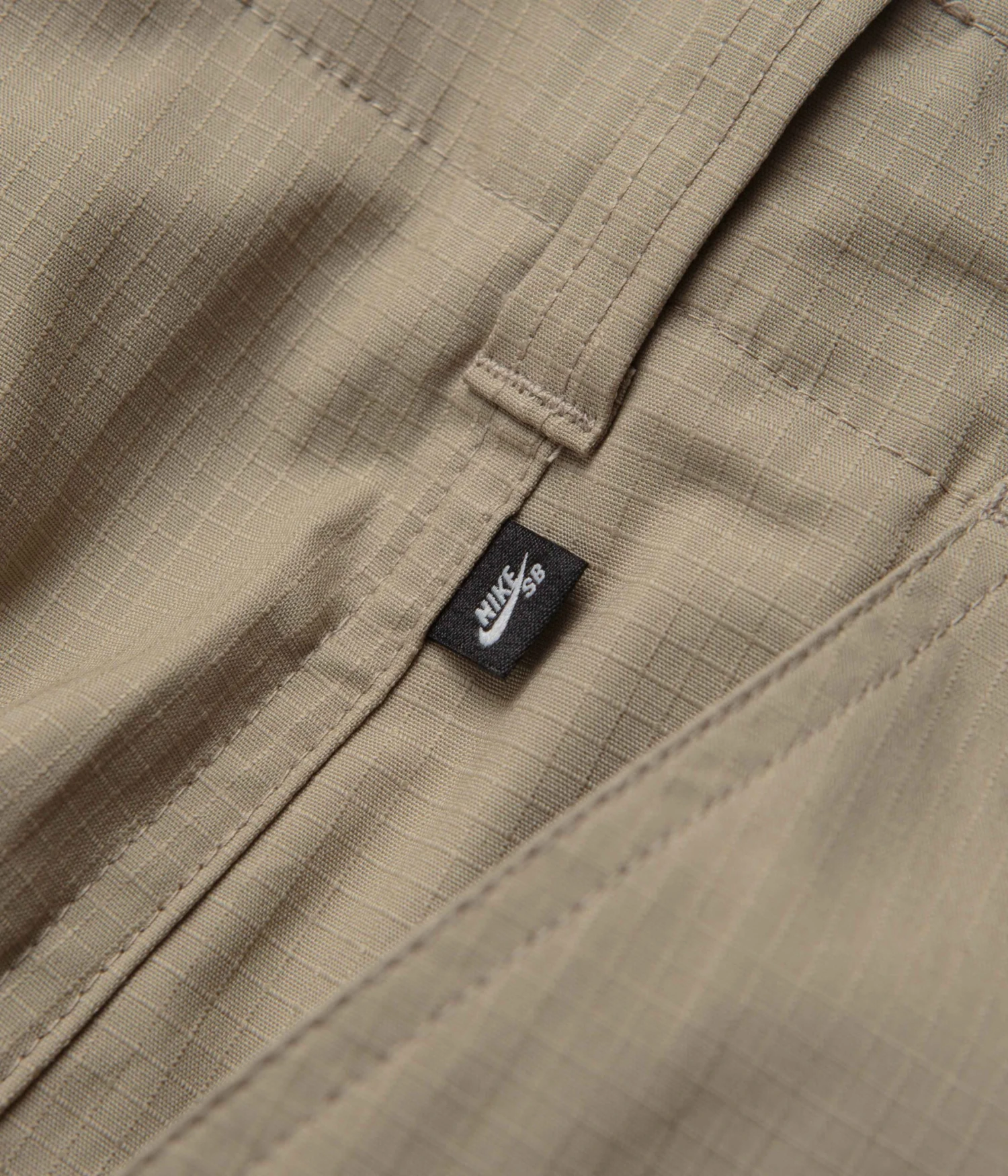 Nike SB Kearny Cargo Shorts in Khaki. Utility inspired and tailored to a regular fitting, these Nike SB shorts are made from a cotton-spandex blend. Featuring a reinforced seat, a single button secured zipper fly and a drawstring adjustable waist, these khaki Nike SB shorts are finished with two front pockets, two rear pockets, additional cargo pockets and with woven flag label branding.Â