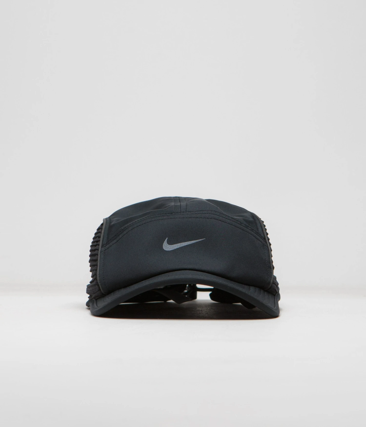 Nike AeroBill Cap in Black and Anthracite. Single sized and unstructured, this Nike cap is made from 100% polyester with AeroBill and AeroAdapt sweat-wicking technology. Featuring a five panel profile, four-way stretch panels, an adjustable toggle-cord fastening and with Dri-FIT ADV enhancements, this black Nike cap is finished with reflective logo detailing.