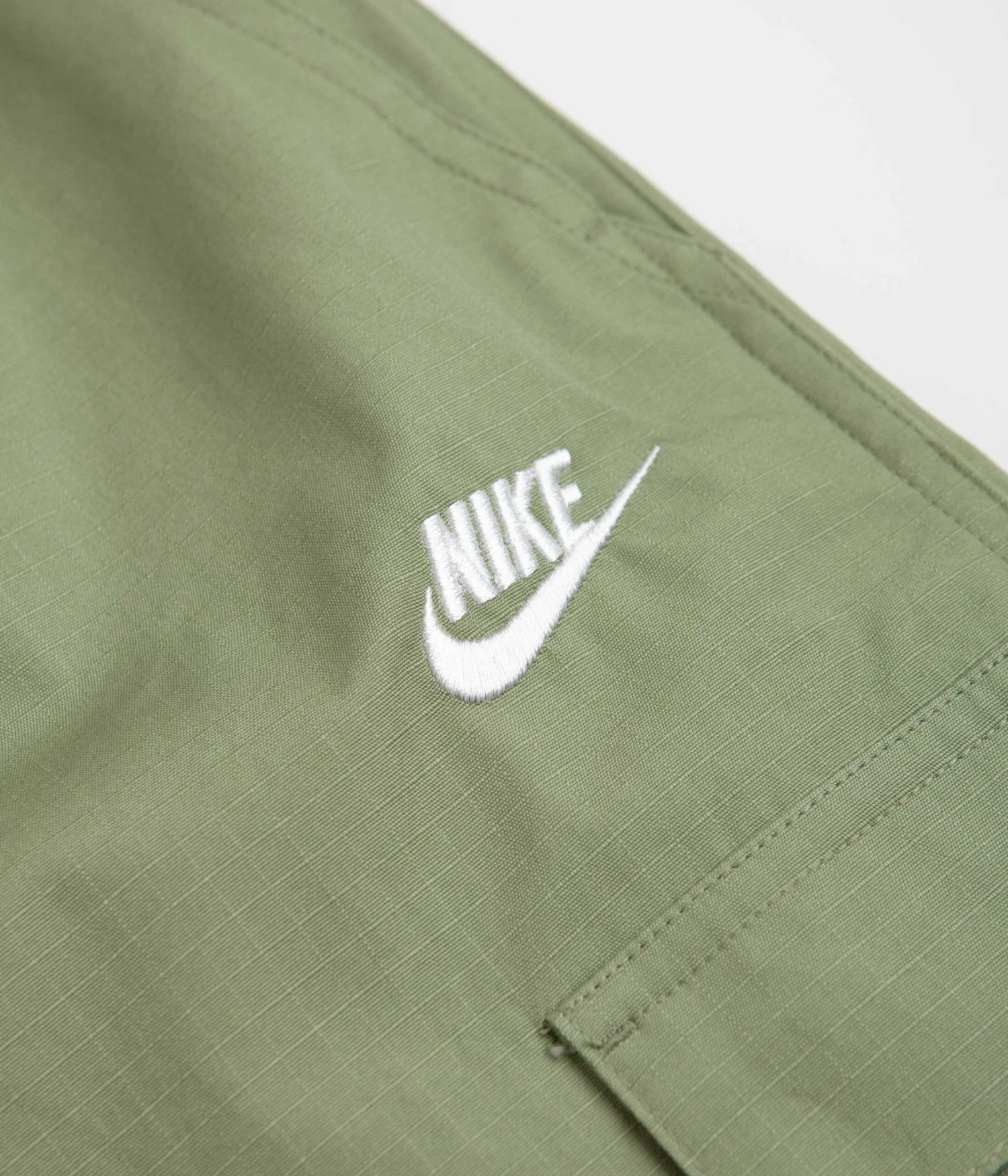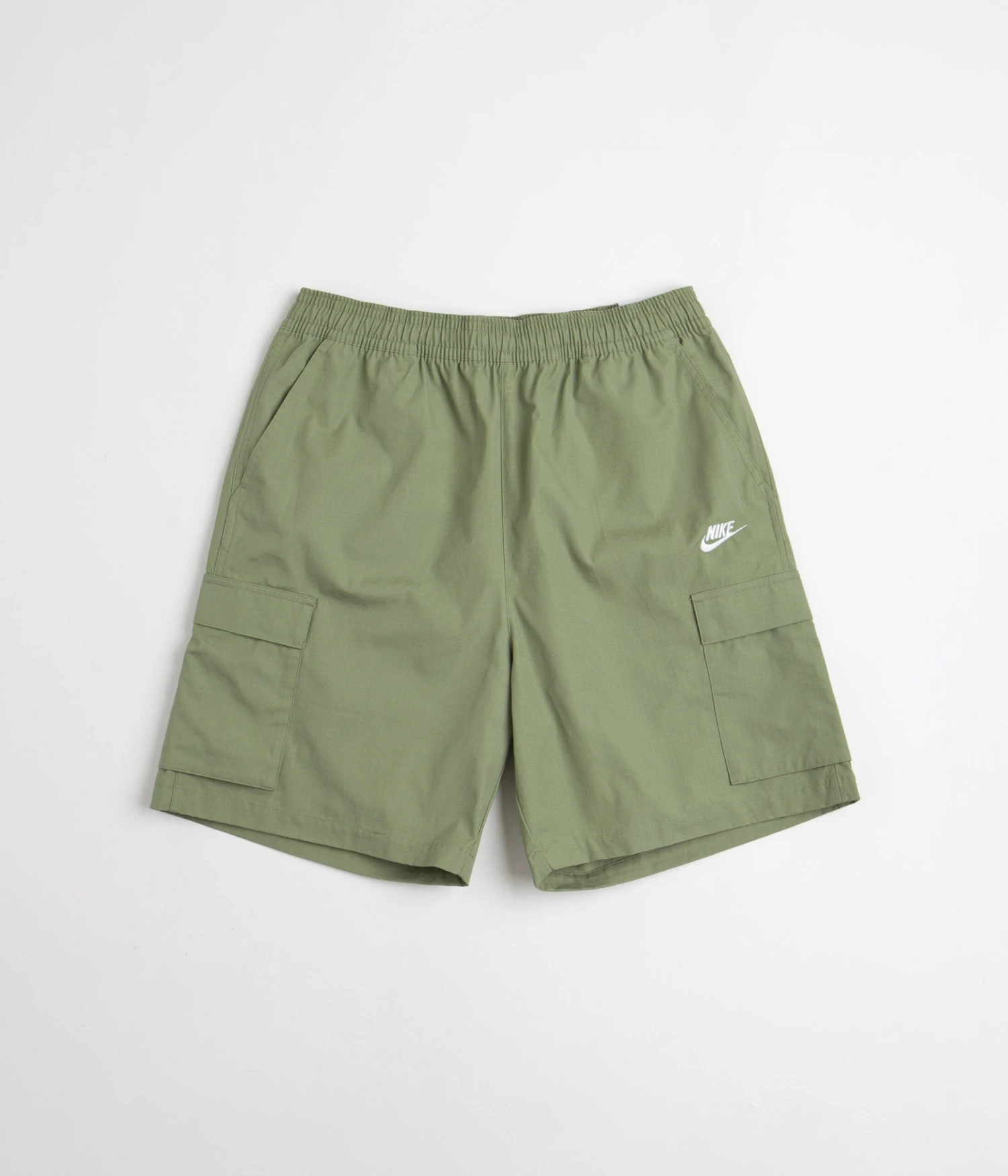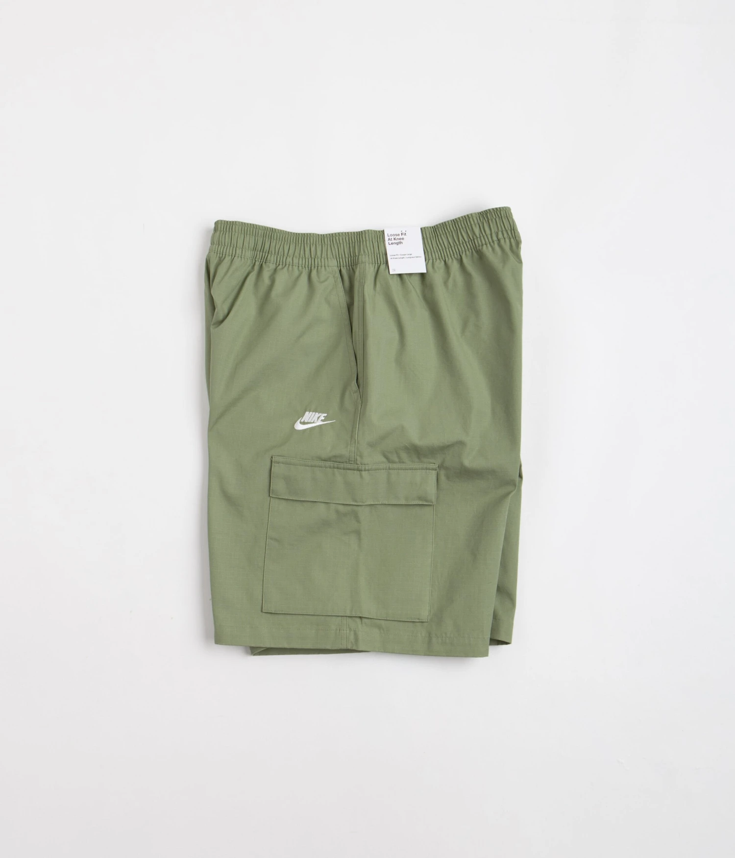 Nike Club Cargo Shorts in Oil Green and White. Regular fitting and made from 100% cotton ripstop, these above-knee Nike shorts are styled with an elasticated waistband and additional cargo pockets. Utility inspired and finished in a shade of oil green with two side pockets, a single rear pocket and with an embroidered Futura Swoosh logo.