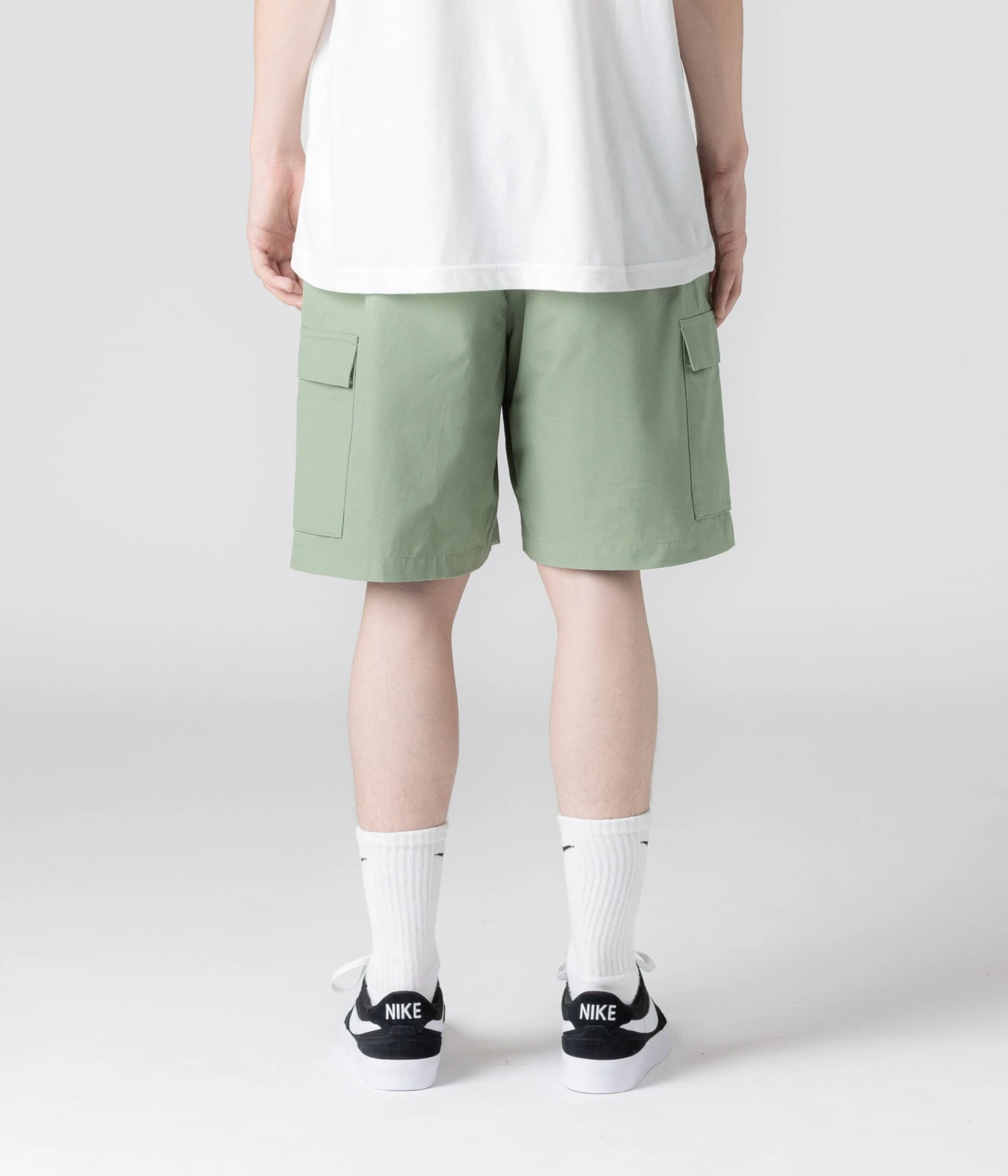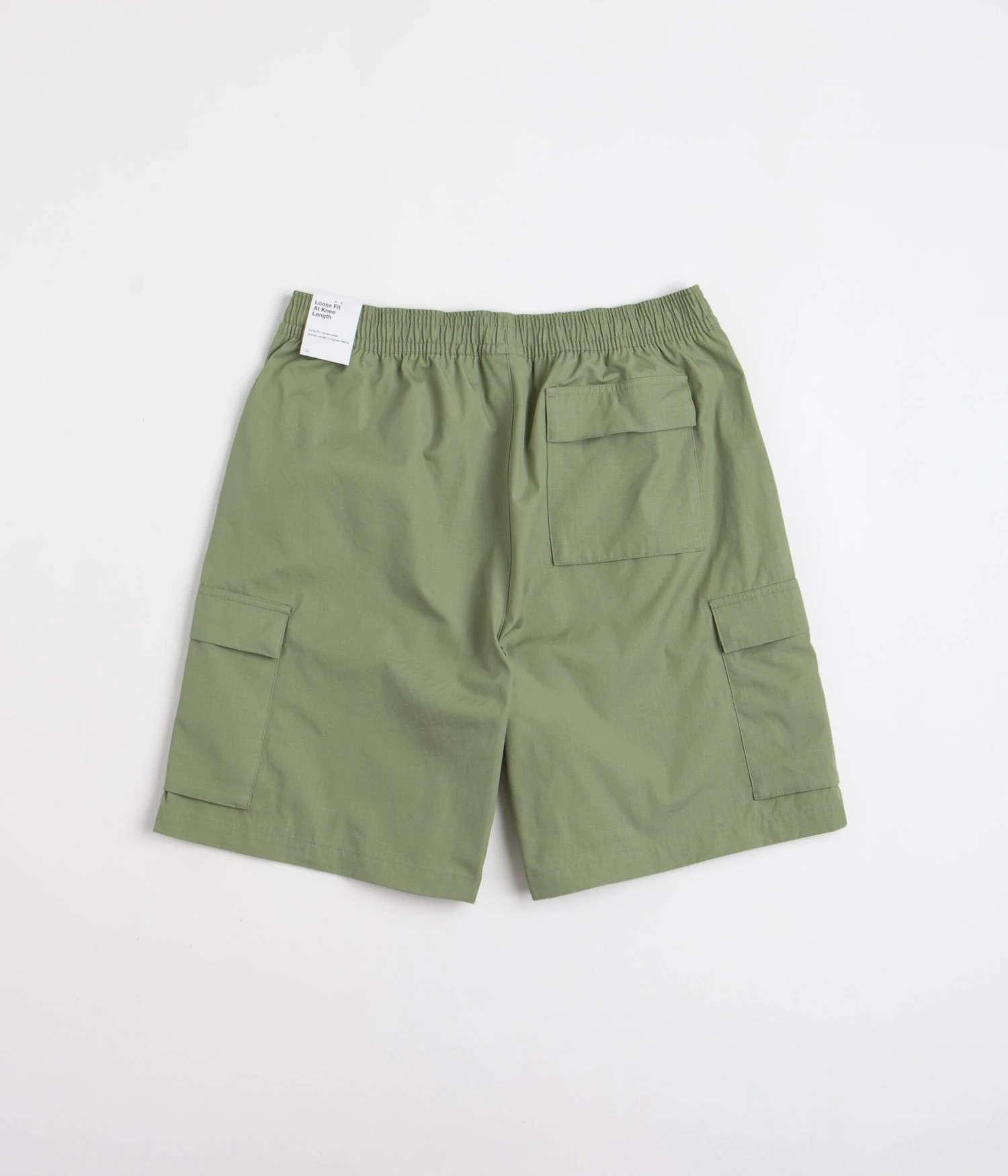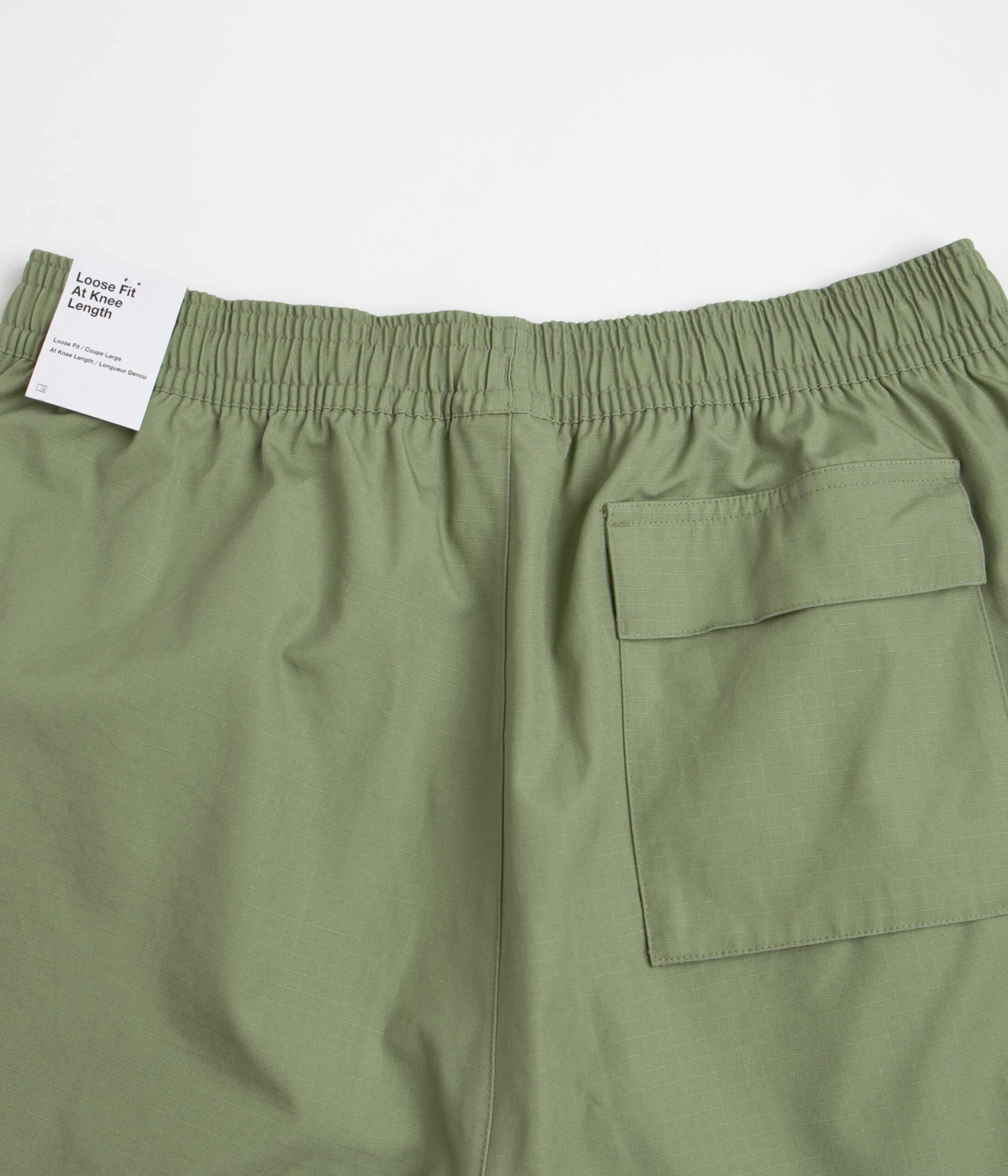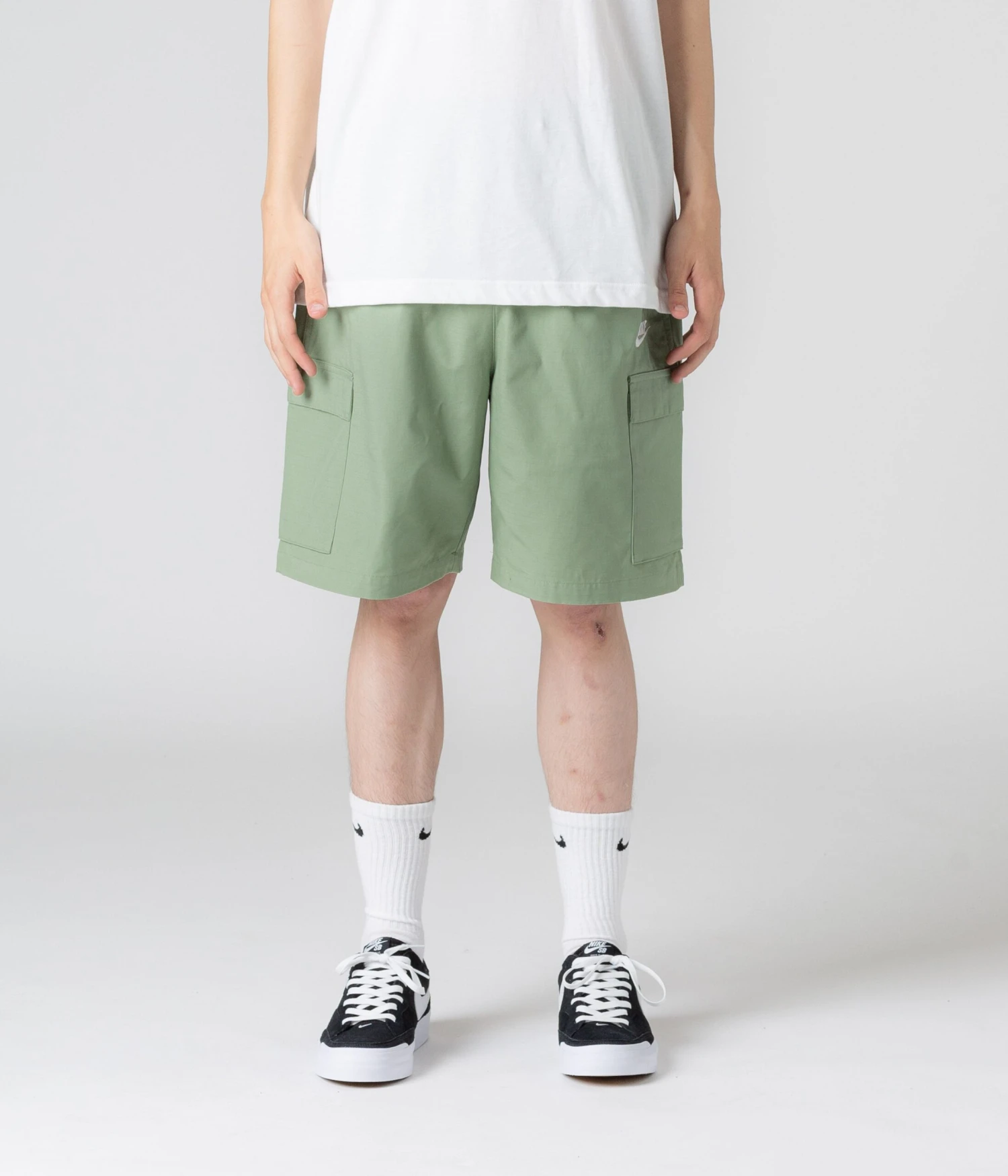 Nike Club Cargo Shorts in Oil Green and White. Regular fitting and made from 100% cotton ripstop, these above-knee Nike shorts are styled with an elasticated waistband and additional cargo pockets. Utility inspired and finished in a shade of oil green with two side pockets, a single rear pocket and with an embroidered Futura Swoosh logo.