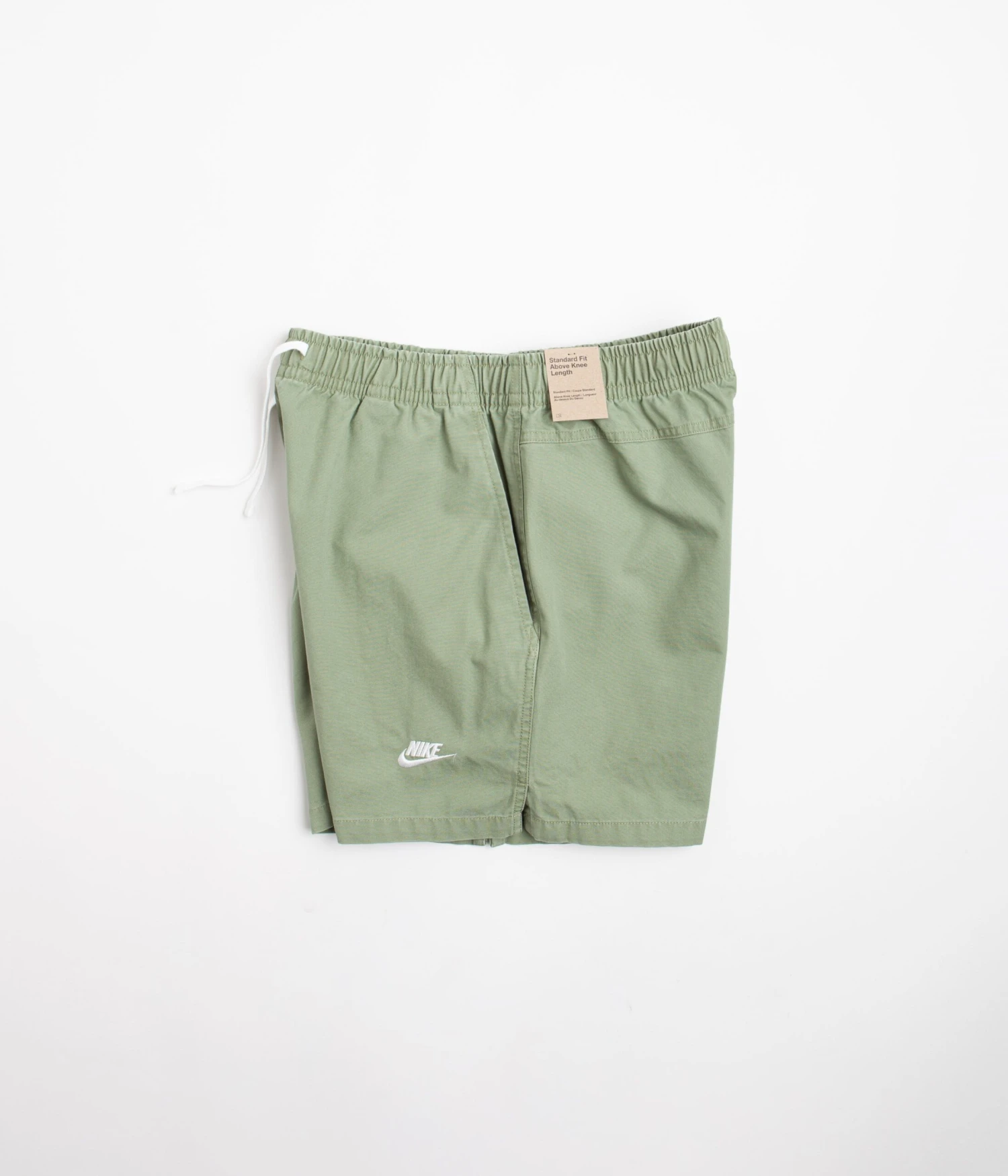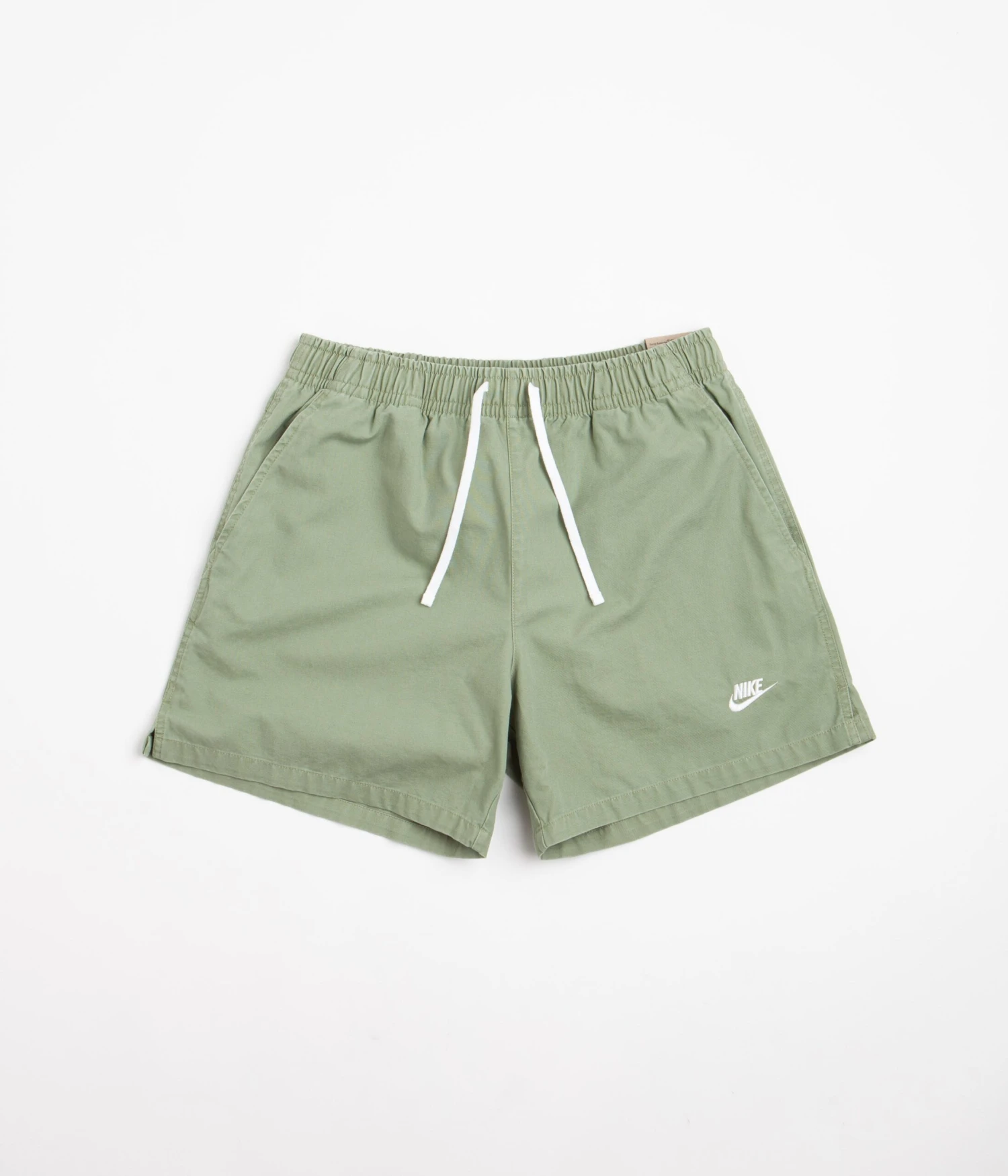 Nike Club Flow Shorts in Oil Green and White. Regular fitting and styled with tonal stitched seams, these Nike shorts are cut to an above-knee length from 100% cotton canvas. Featuring an elasticated drawstring waistband, these oil green Nike Club shorts are finished with two side pockets, a single rear pocket and with an embroidered Futura Swoosh logo.Â