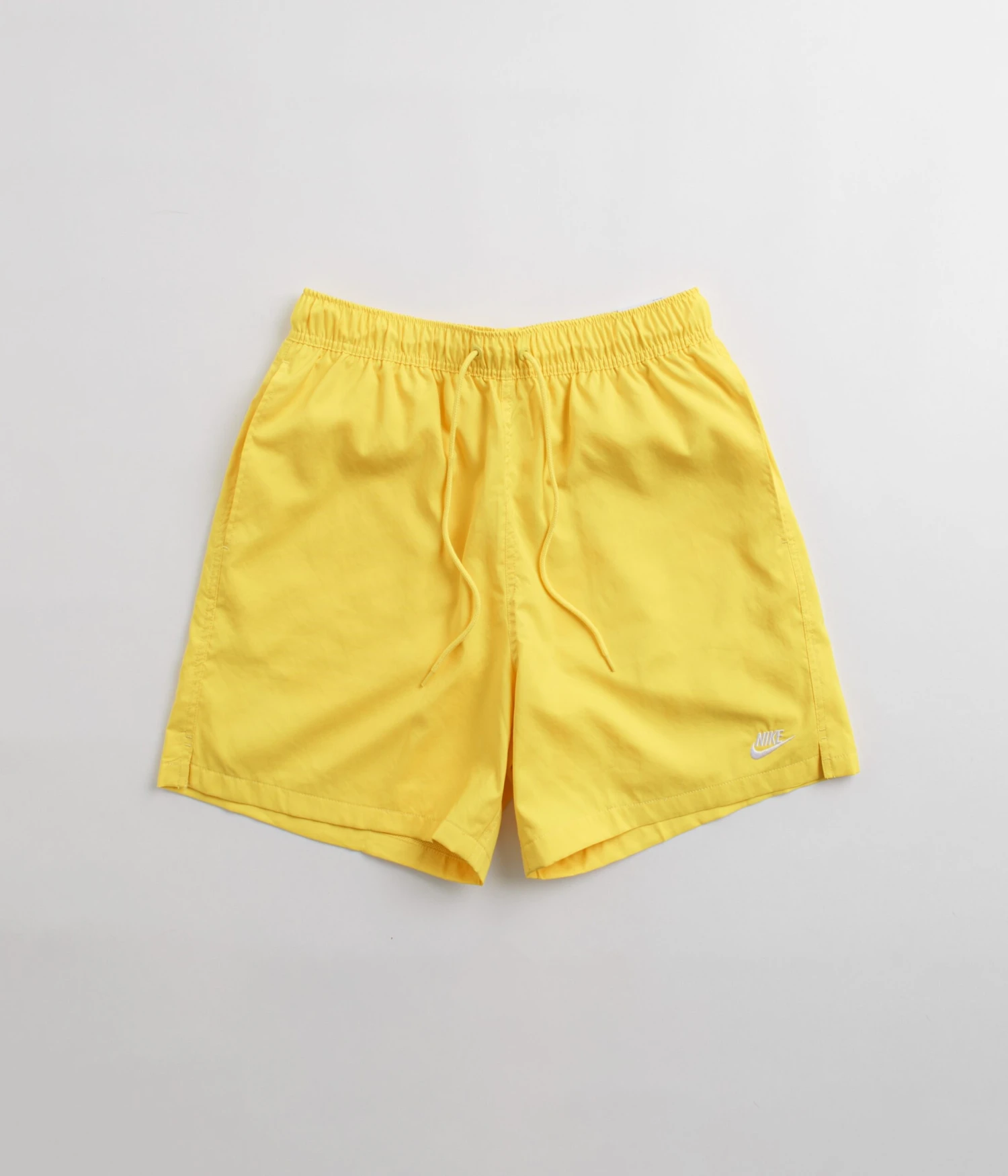 Nike Club Woven Flow Shorts in Lightening and White. Designed with a relaxed seat and thigh, these Nike shorts are made from 100% polyester with a breathable mesh lining. Featuring an elasticated waistband, a 6” inseam and tonal stitched seams, these yellow Nike shorts are finished with two side pockets, a single rear pocket and with embroidered logo branding.