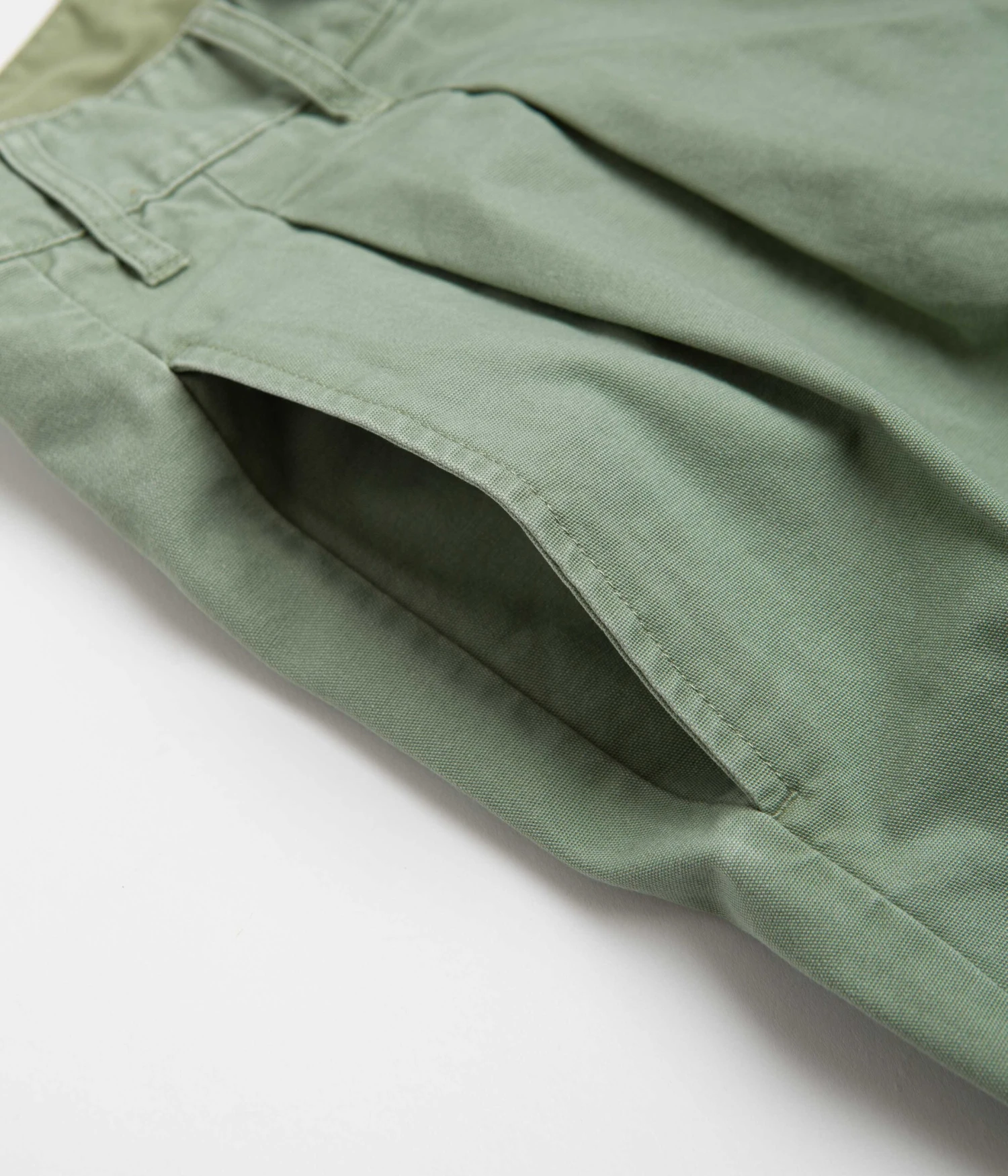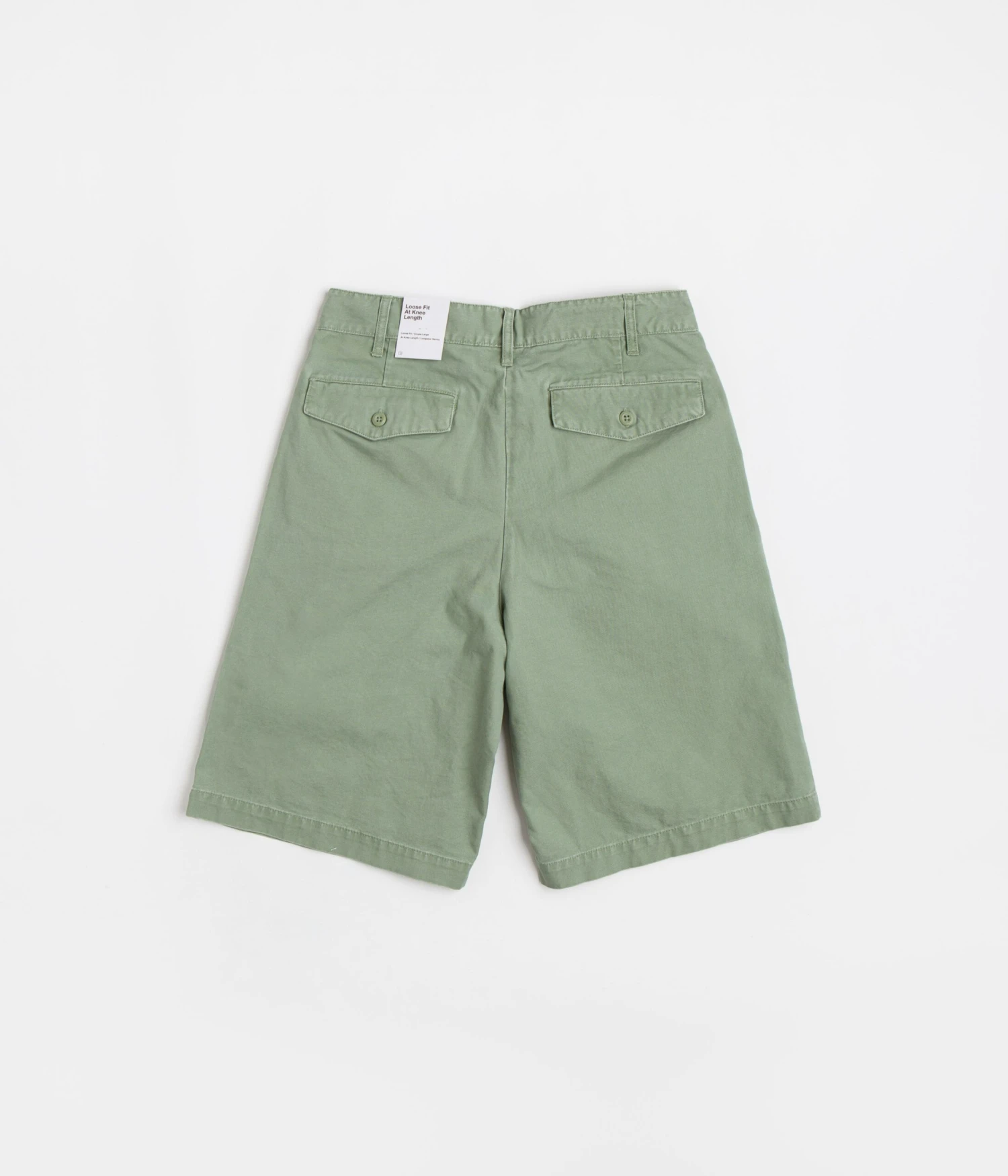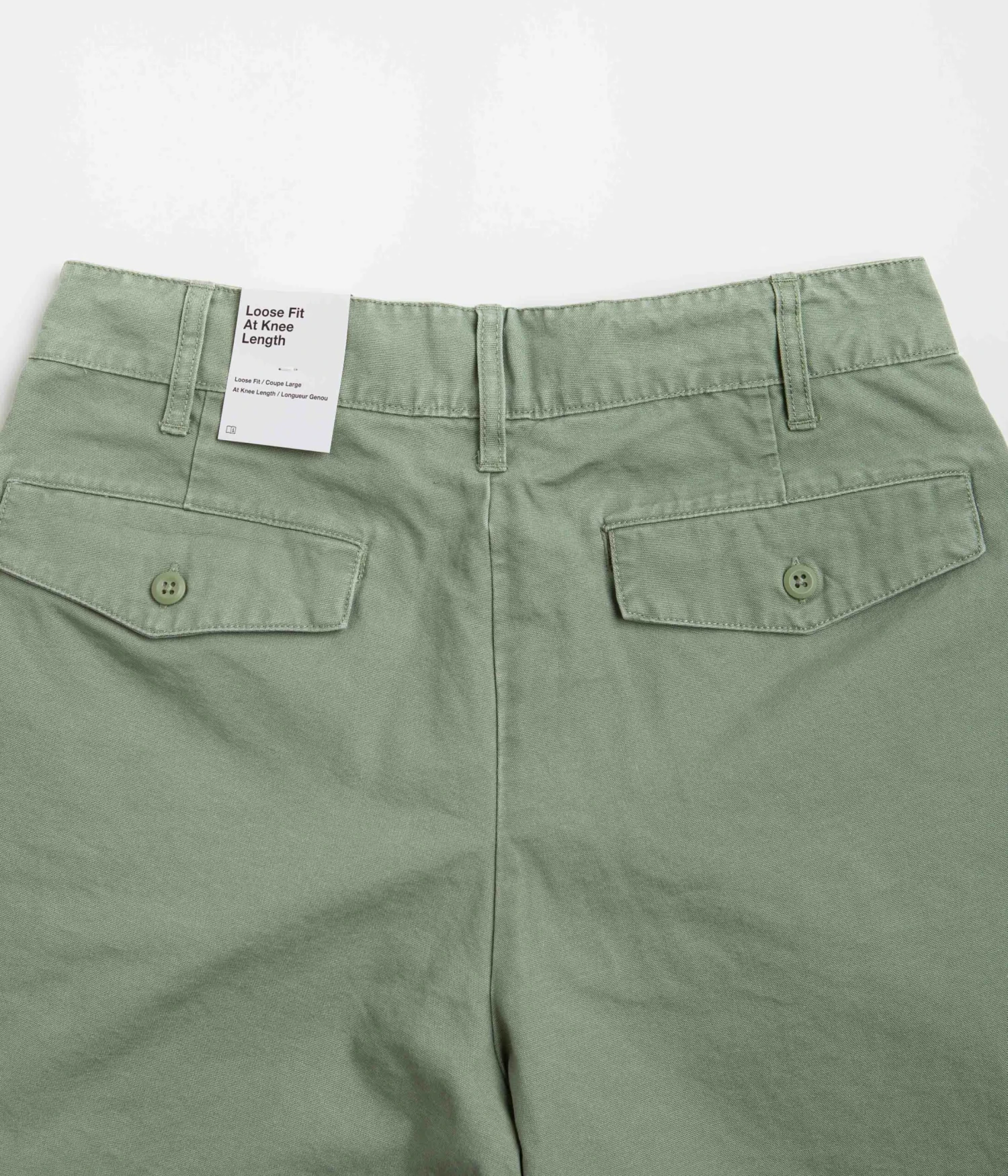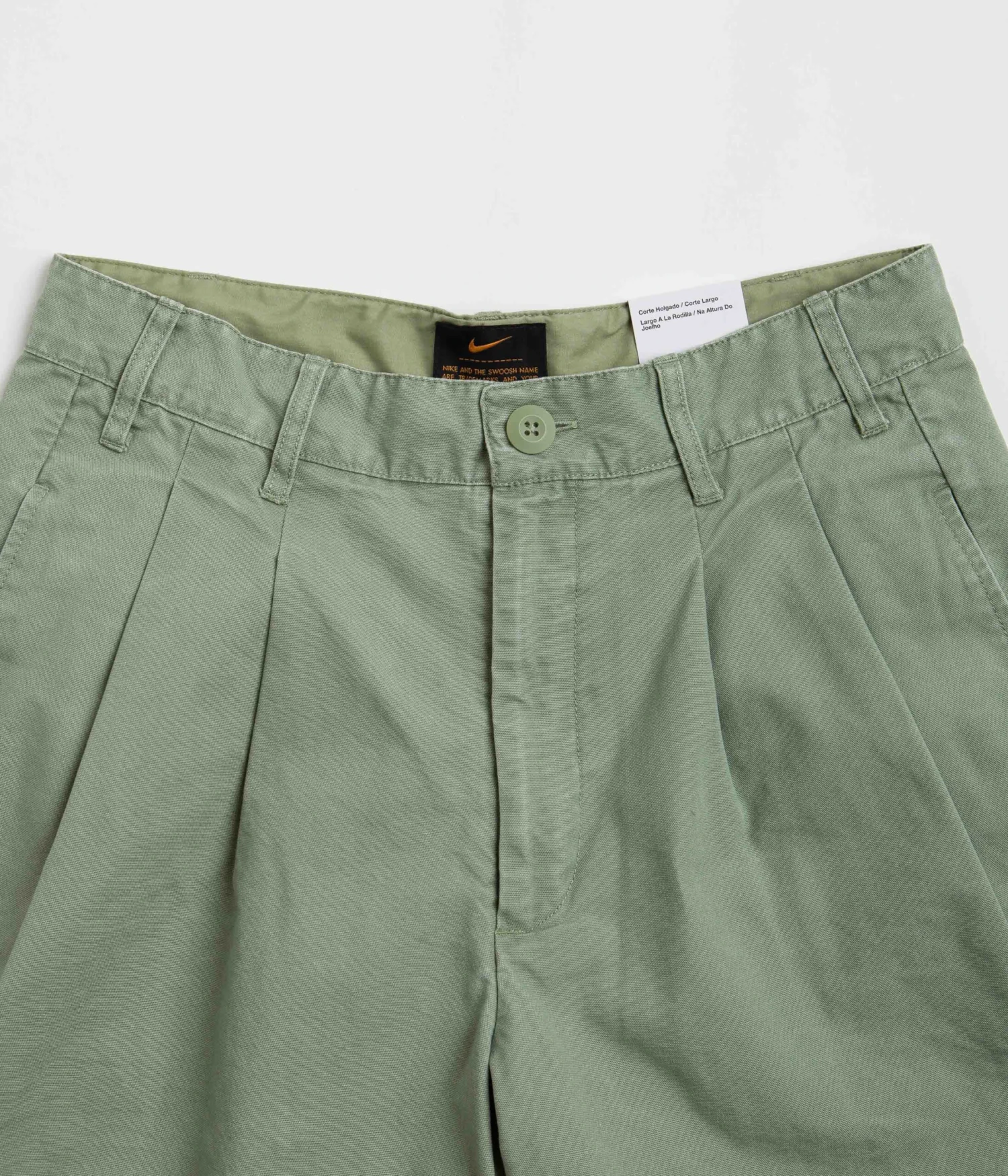 Nike Pleated Chino Shorts in Oil Green and White. Part of the brand’s Nike Life collection, these utility style Nike shorts are tailored to a relaxed fitting with a knee length cut. Featuring pleated front panels with a 100% cotton construction, these green Nike chino shorts are finished with a zippered fly, two side pockets, two flap-over rear pockets and with an embroidered Swoosh sewn above the left cuff.Â