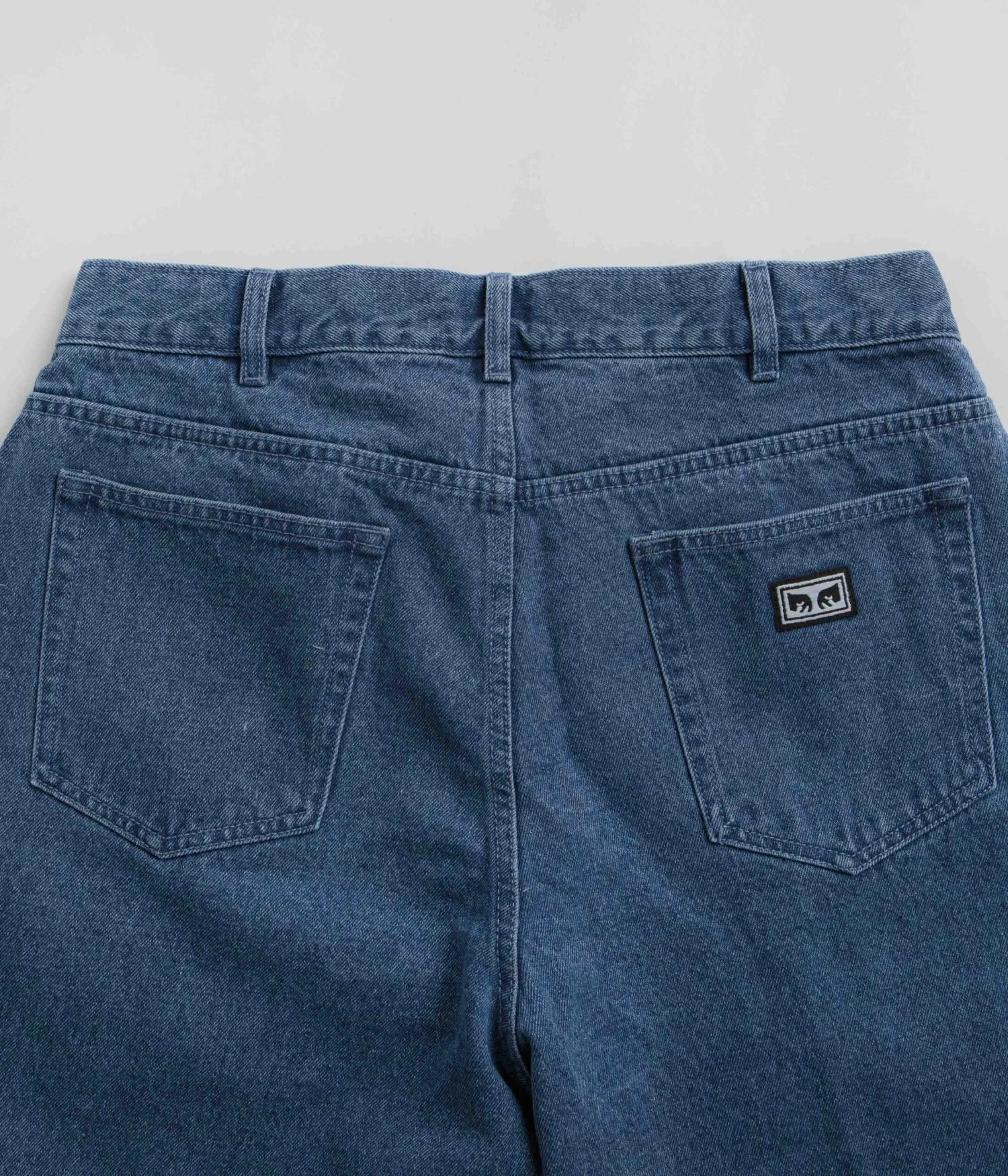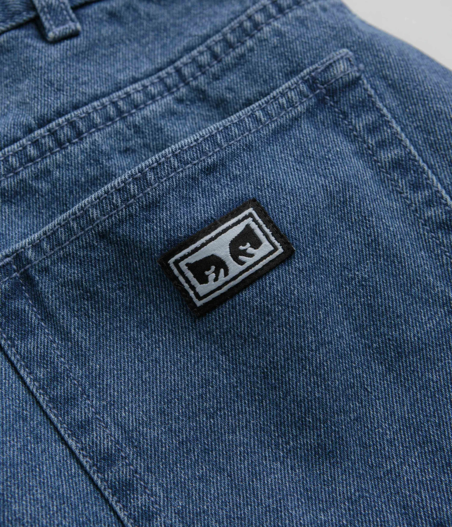 Obey Bigwig Baggy Denim Shorts in Light Indigo. Made from 100% heavyweight cotton denim, these baggy fitting Obey shorts are designed with a belt loop waist and a single button secured zipper fly. Finished in a shade of blue with two side pockets, two rear pockets, an embroidered coin pocket and with a woven rear flag label.