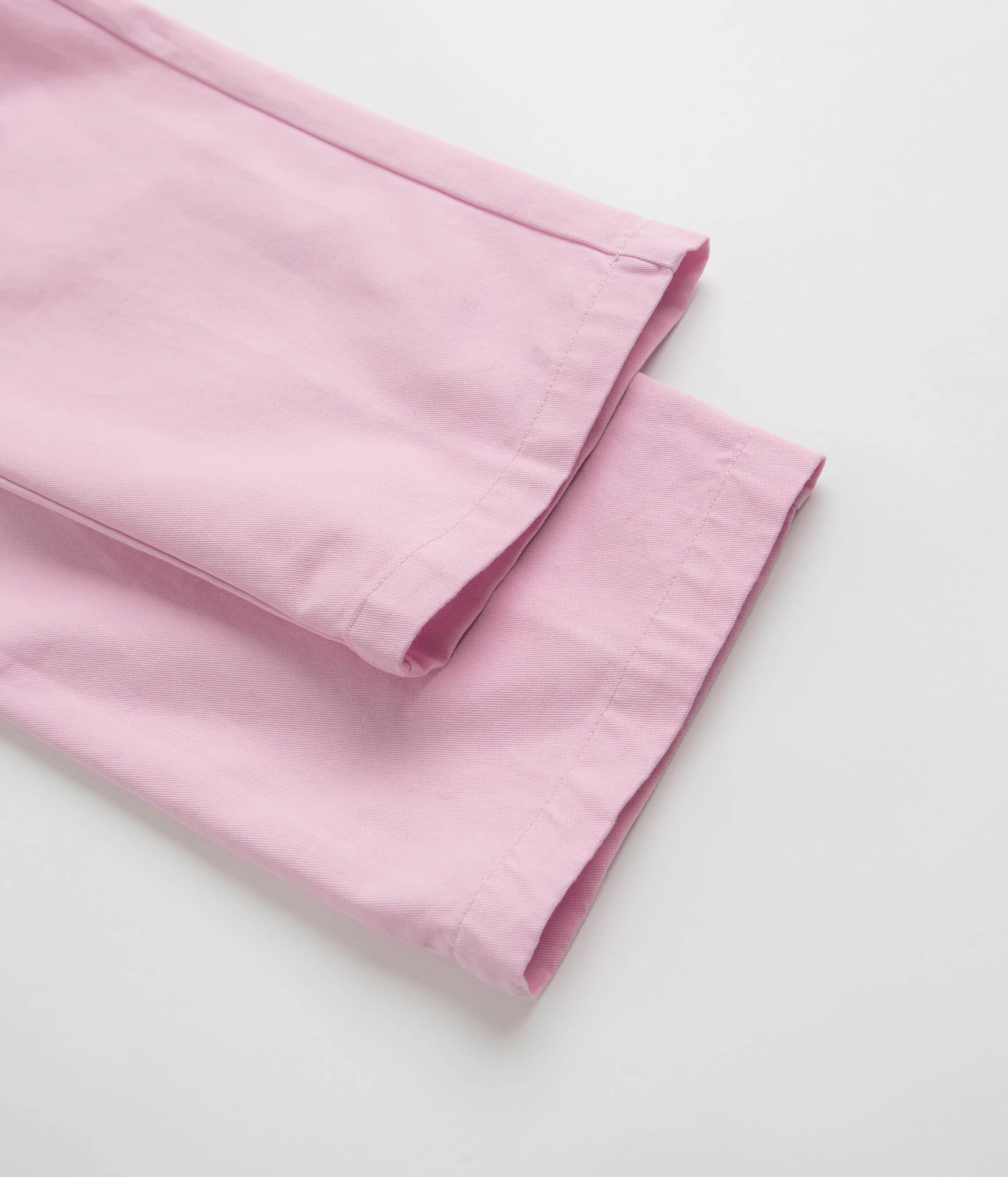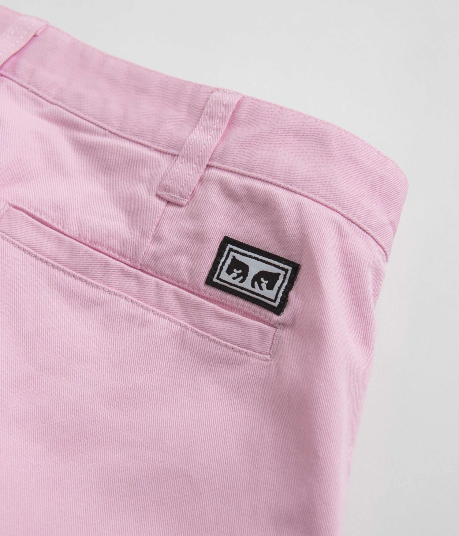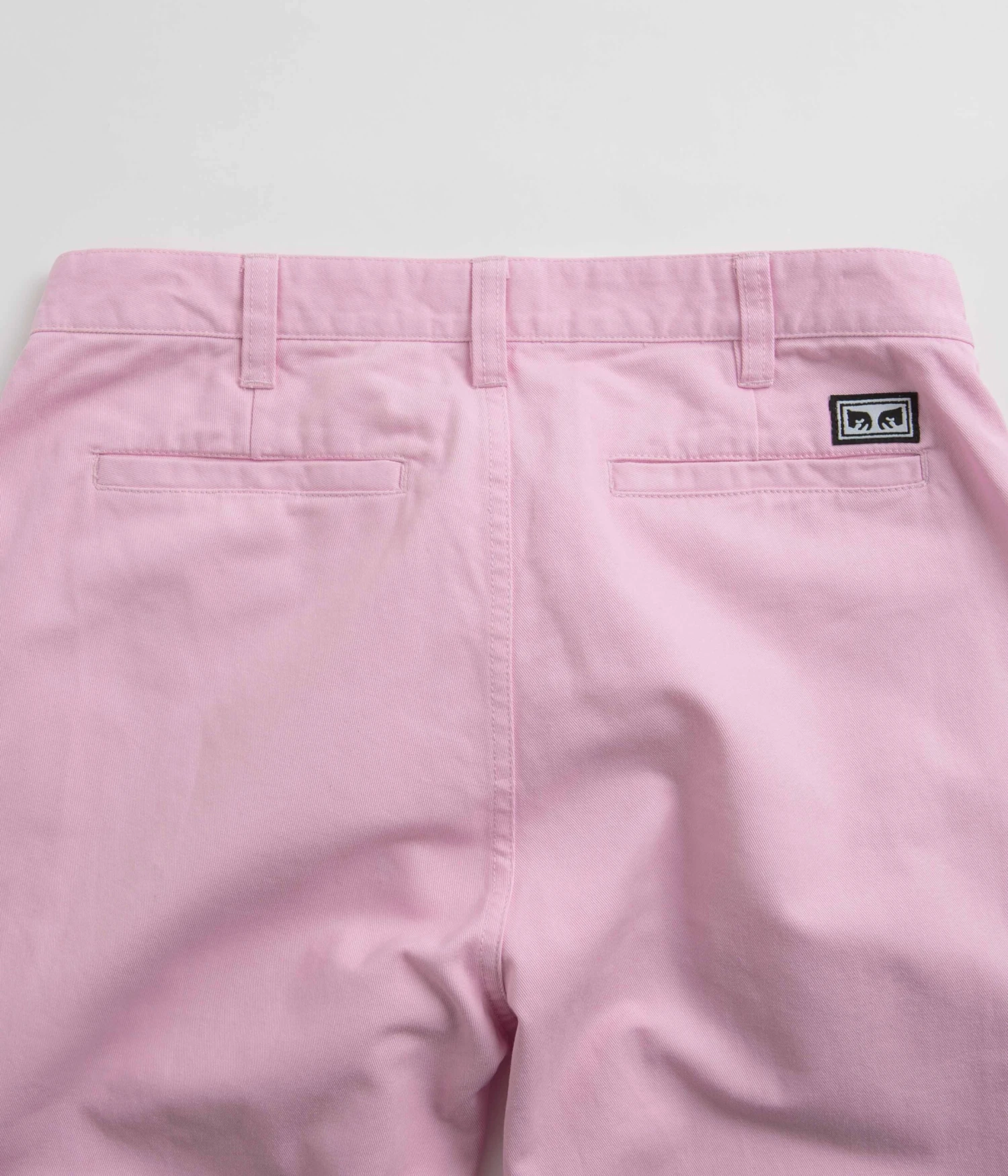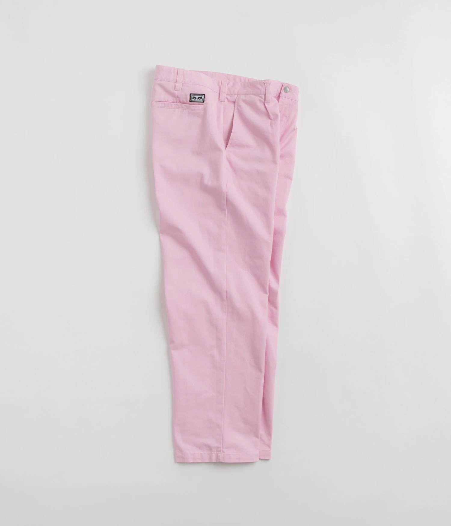 Obey Hardwork Pleated Pants in Piroutte. Made from 100% cotton twill, these regular fitting Obey pants are designed with pleated details and with a classic belt loop waist. Featuring a shank-button closure, a zippered fly and four classic pockets, these pink Obey pants are finished with tonal stitched seams and with woven flag label branding.
