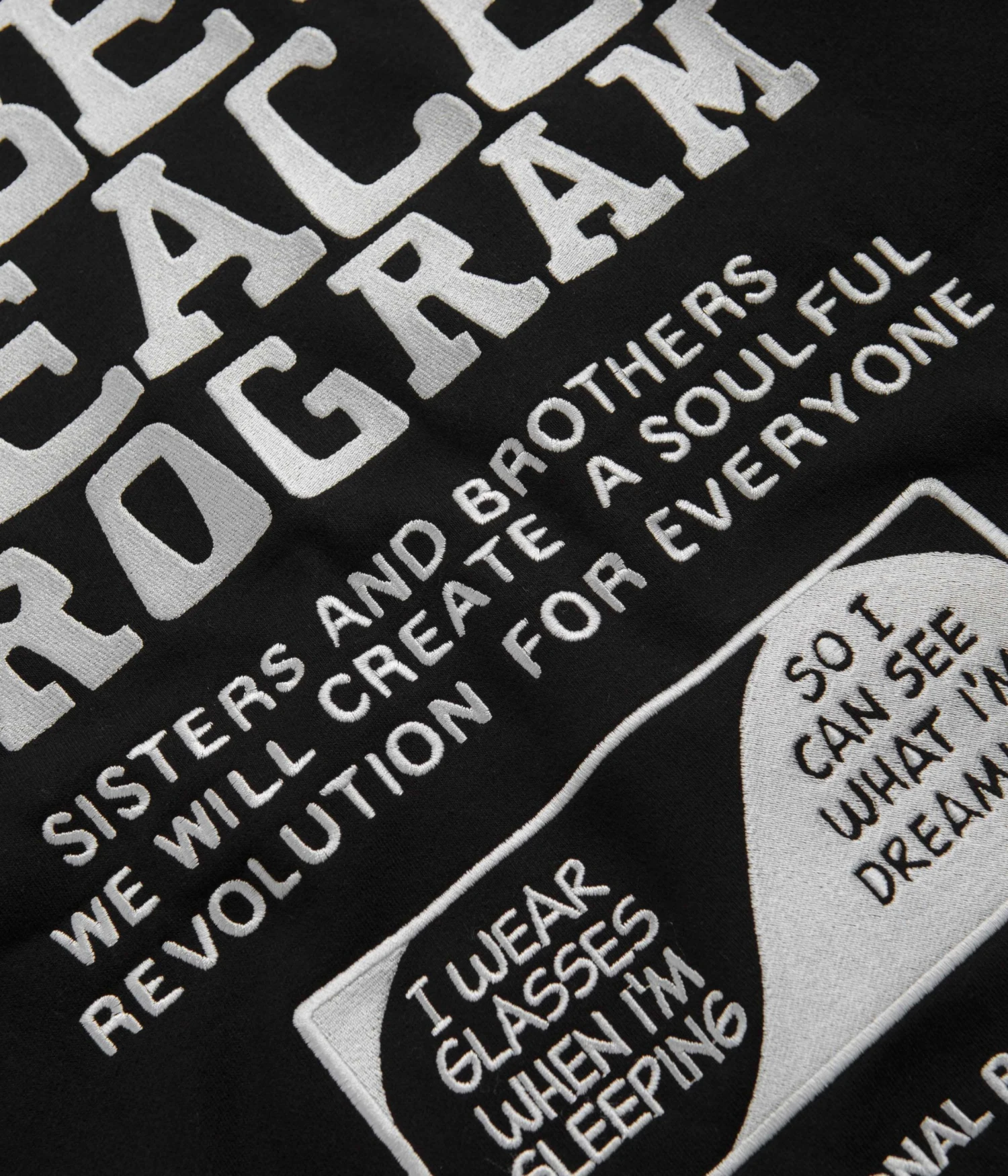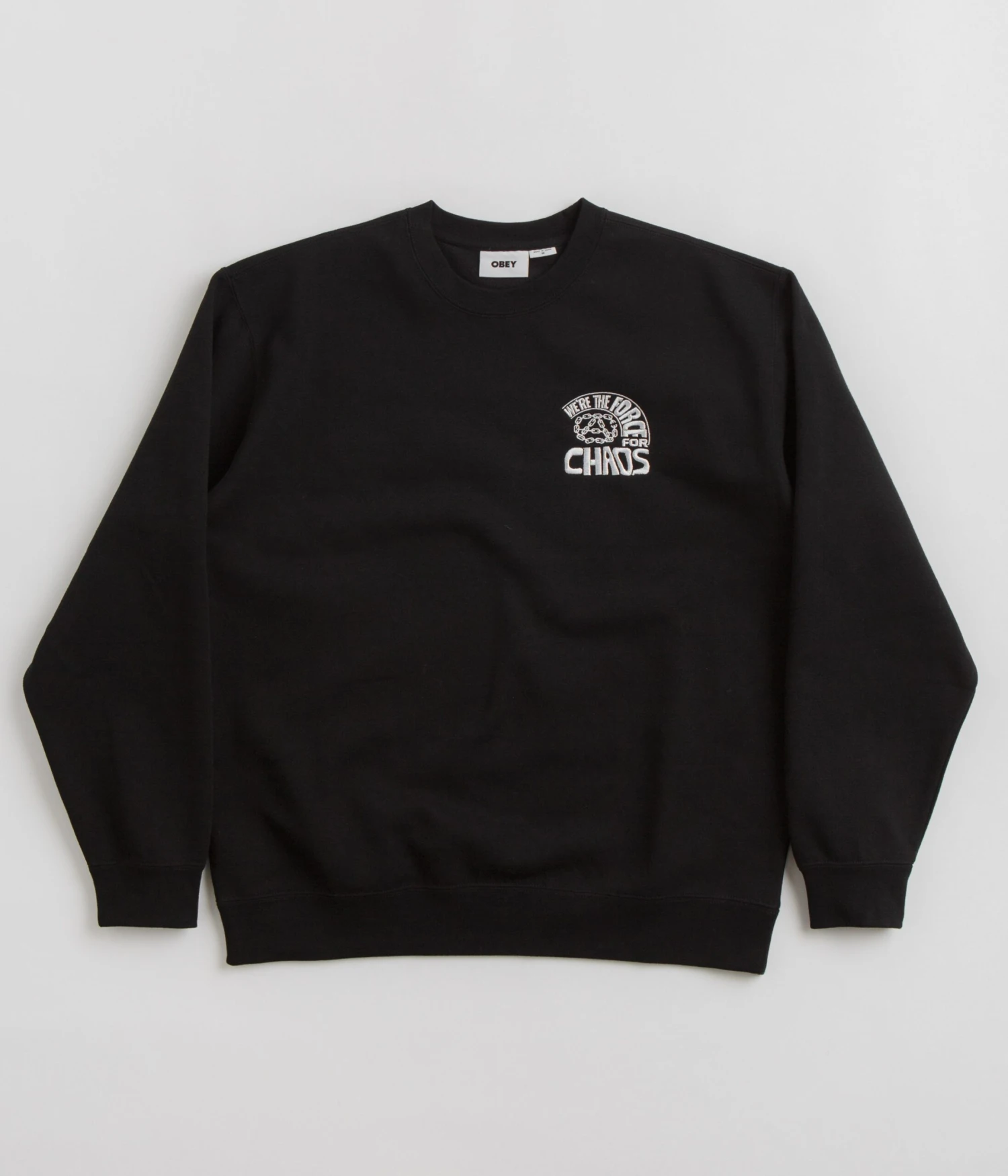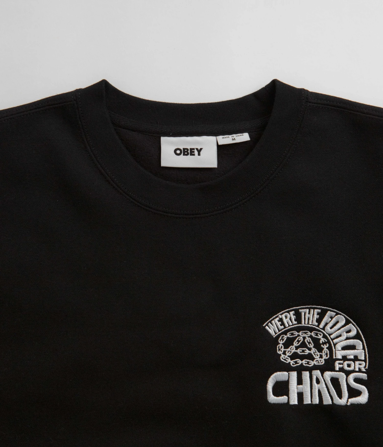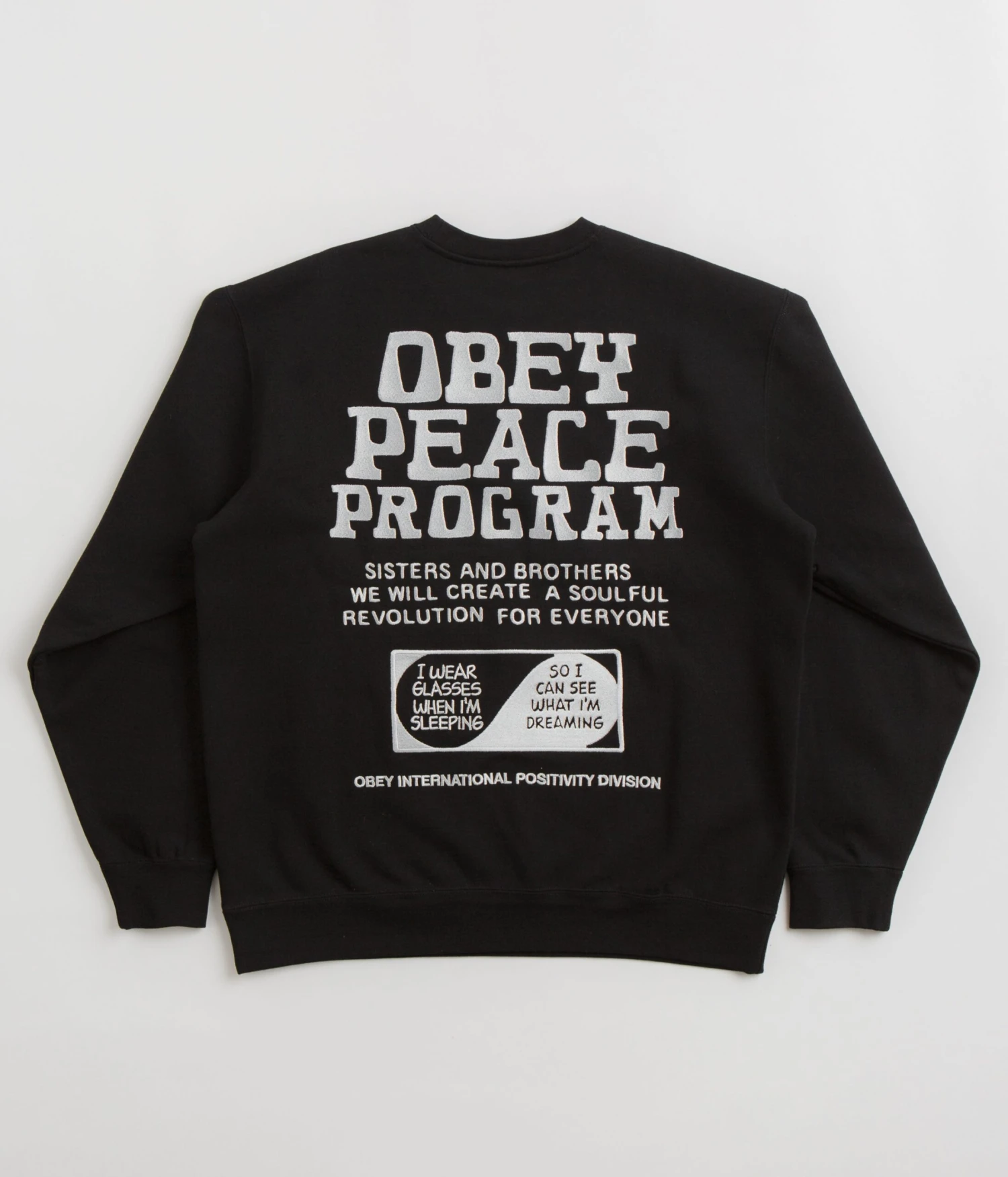 Obey Peace Program Crewneck Sweatshirt in Black. Tailored to a regular fitting from a cotton-polyester blend, this Obey sweatshirt is designed with a brushed fleece lining. Featuring a rib knit collar, ribbed cuffs and a woven elastic hem, this black Obey sweater is finished with embroidered front and rear artwork.