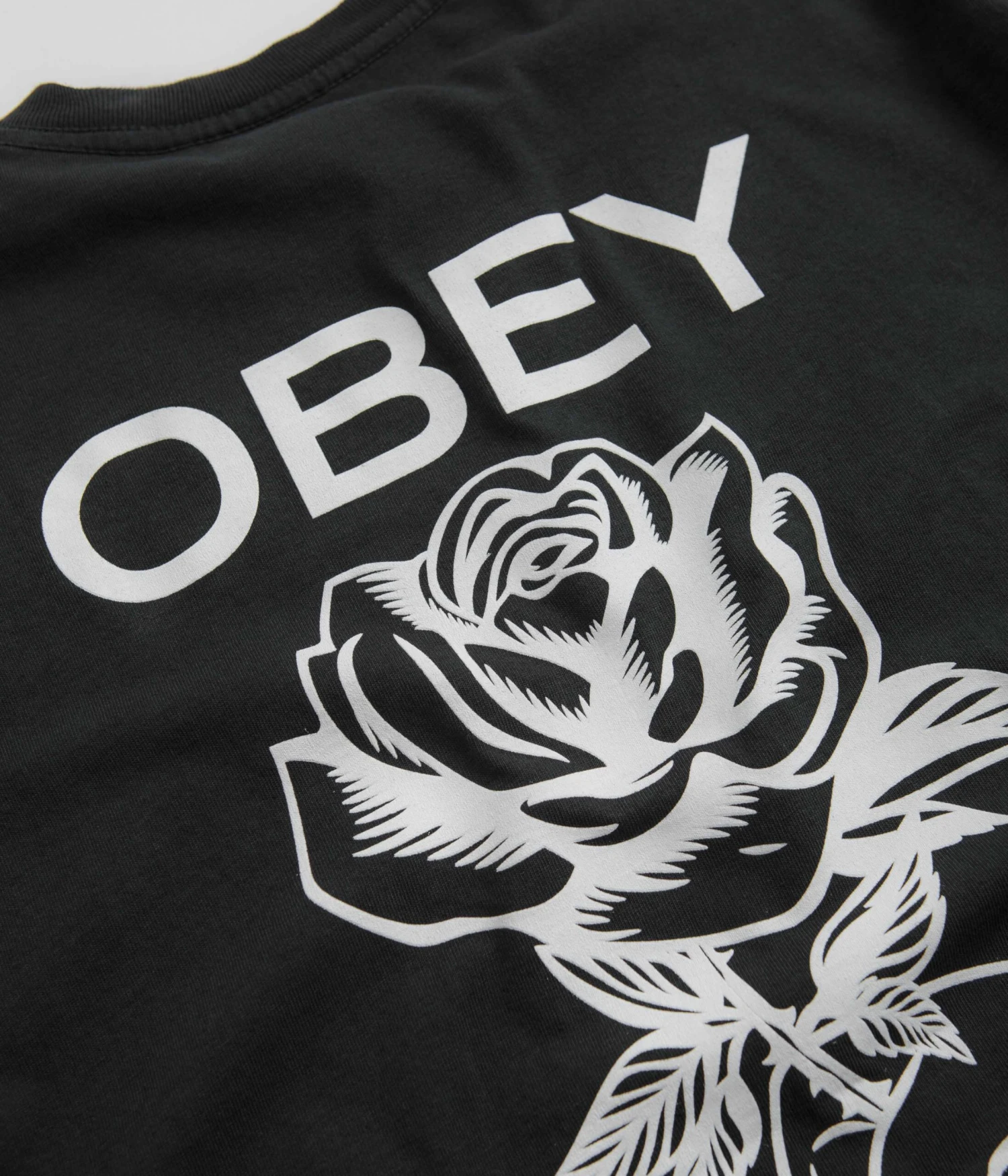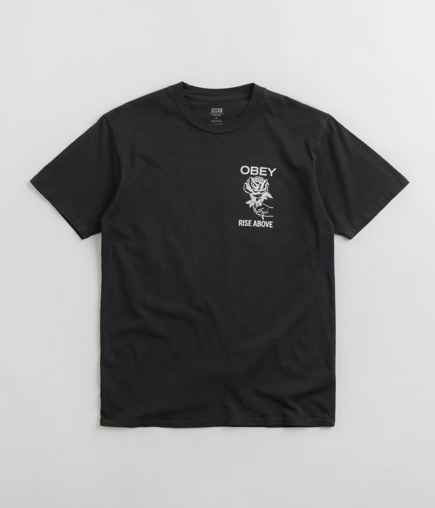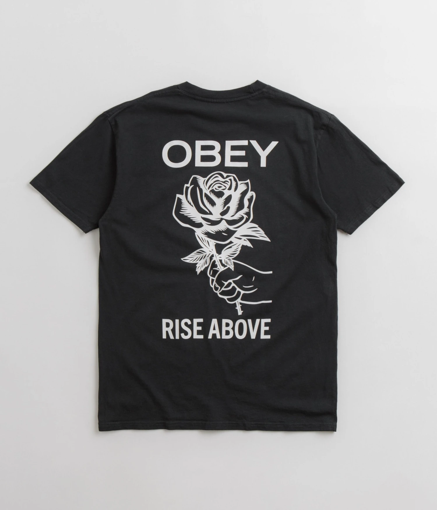 Obey Rise Above Rose T-Shirt in Pigment Vintage Black. Made from 100% cotton with a pigment dyed construction, this new season Obey t-shirt is designed with a classic crew collar and a straight cut hem. Finished in a shade of black with printed front and rear graphics.