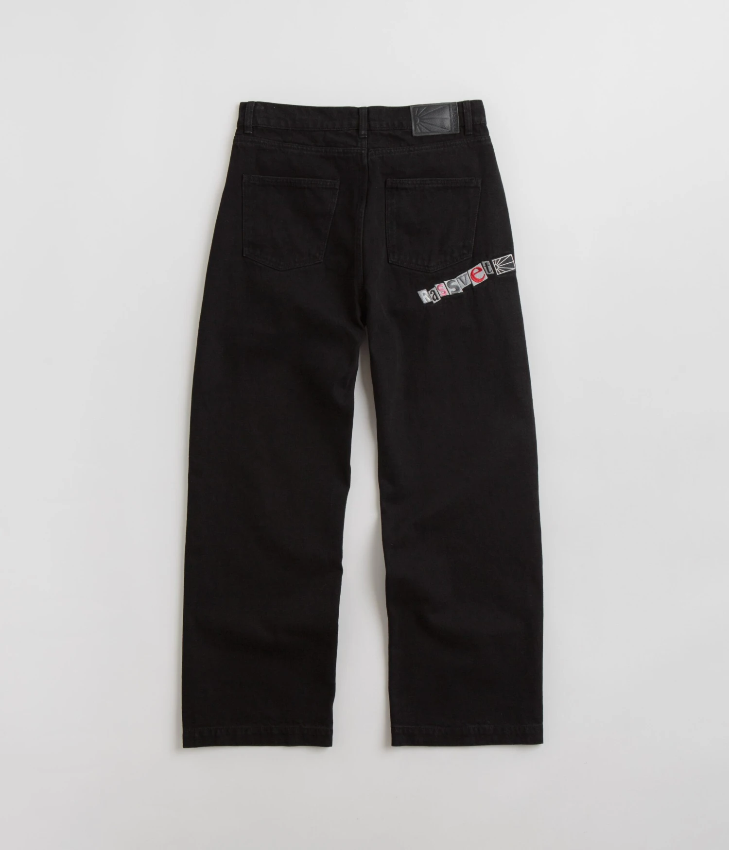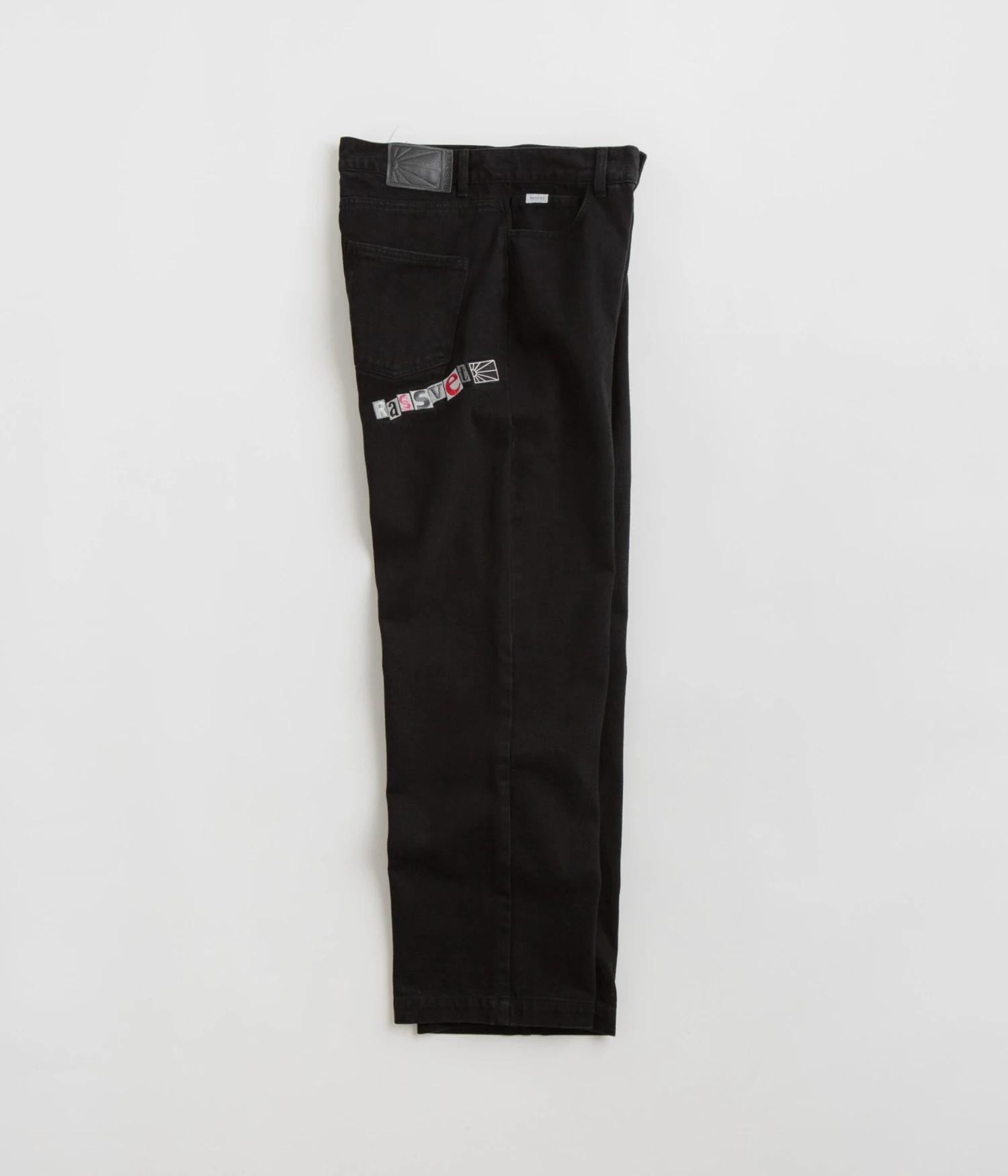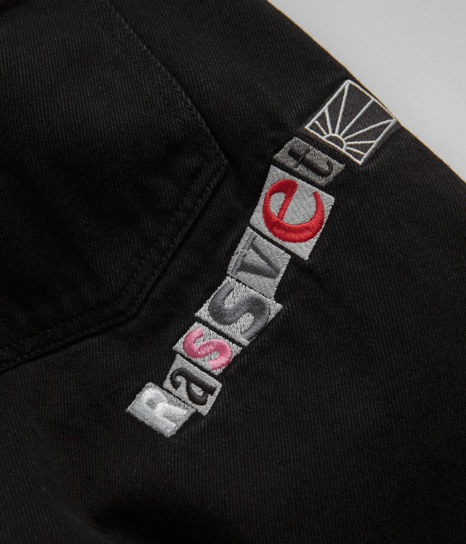 PACCBET Typo Classic Jeans in Black. Tailored to a regular fitting from 100% cotton denim, these PACCBET jeans are designed with a belt loop waistband and a single button secured zipper fly. Featuring a straight leg cut, these black PACCBET jeans are finished with two front pockets, two rear pockets and a single coin pocket.
