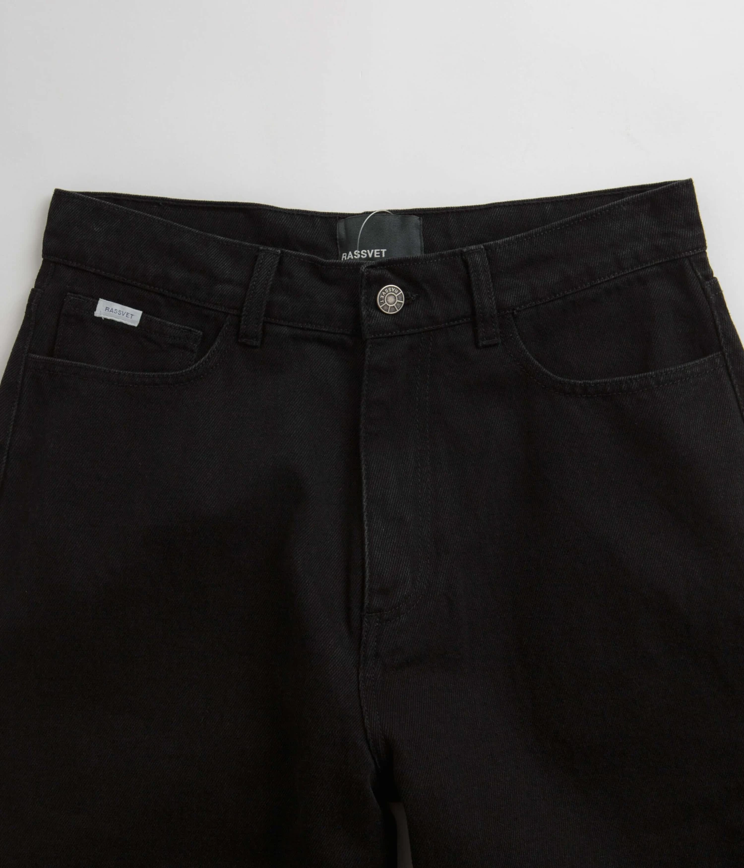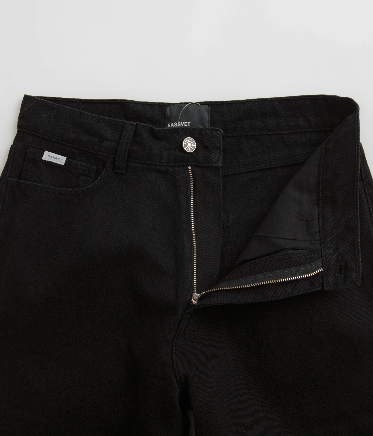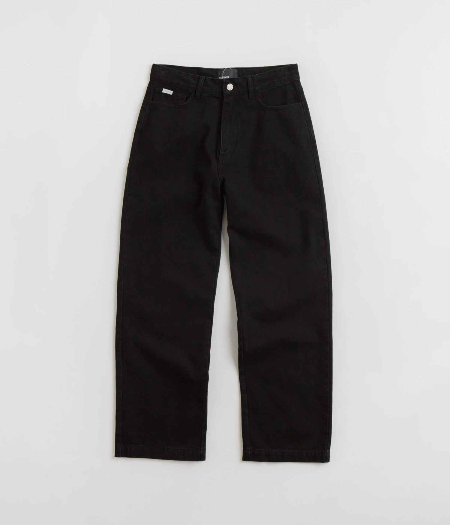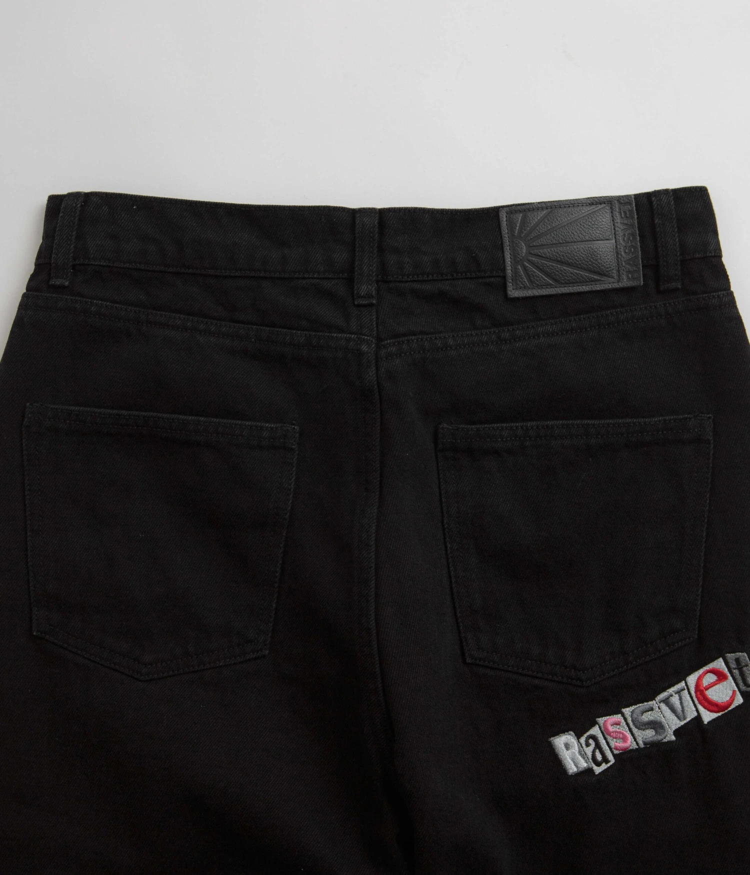 PACCBET Typo Classic Jeans in Black. Tailored to a regular fitting from 100% cotton denim, these PACCBET jeans are designed with a belt loop waistband and a single button secured zipper fly. Featuring a straight leg cut, these black PACCBET jeans are finished with two front pockets, two rear pockets and a single coin pocket.
