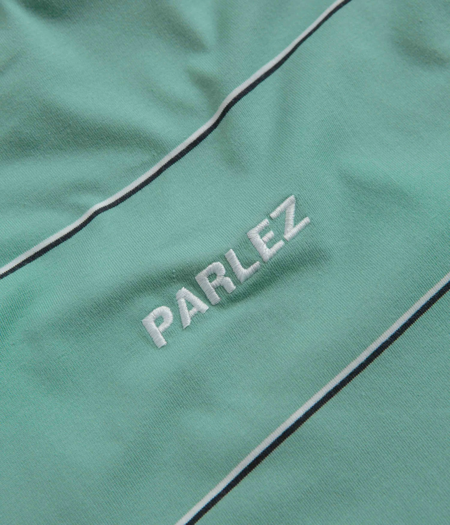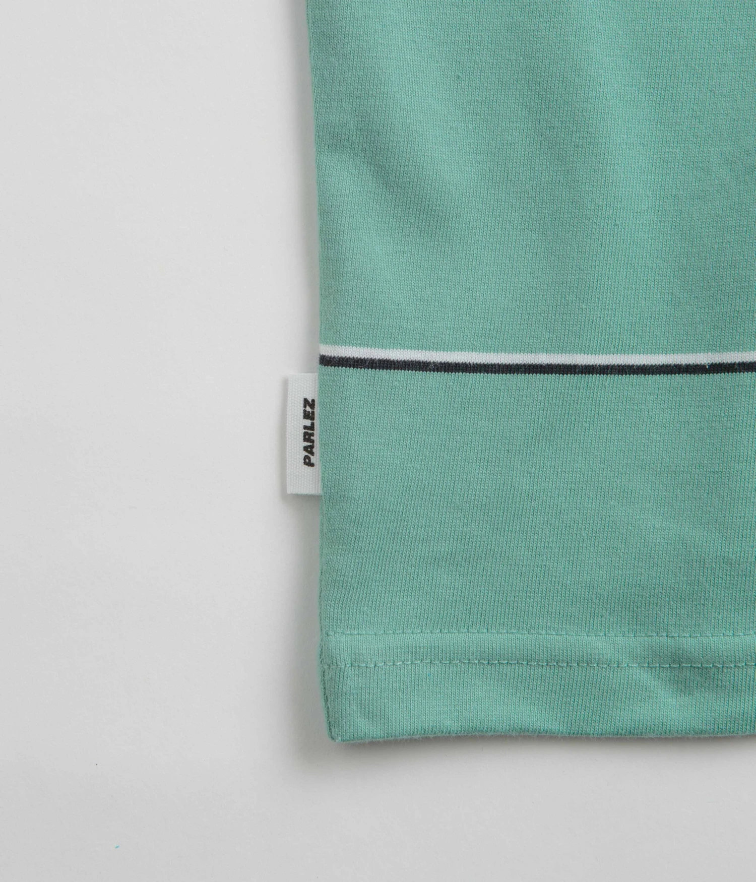 Parlez Bataka Oversized Stripe T-Shirt in Sea Mist. Oversized fitting with a striped pattern, this Parlez t-shirt is made from 100% organic cotton. GOTS certified with a classic crew collar and a straight cut hem, this teal green Parlez t-shirt is finished with embroidered left chest branding.