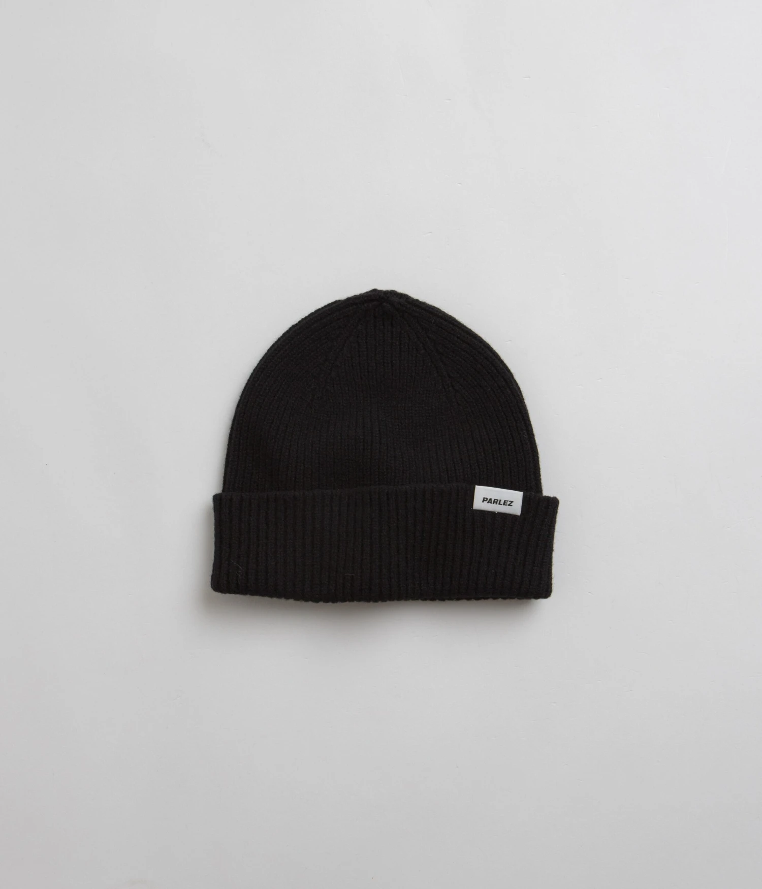Parlez Cooke Beanie in Black. Made from 100% pure lambswool, this colour block Parlez beanie is designed with a stretchy rib knit face. Single sized and finished in a shade of black with an adjustable fold-over cuff and woven flag label branding.