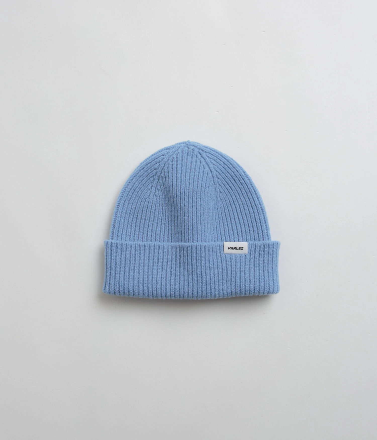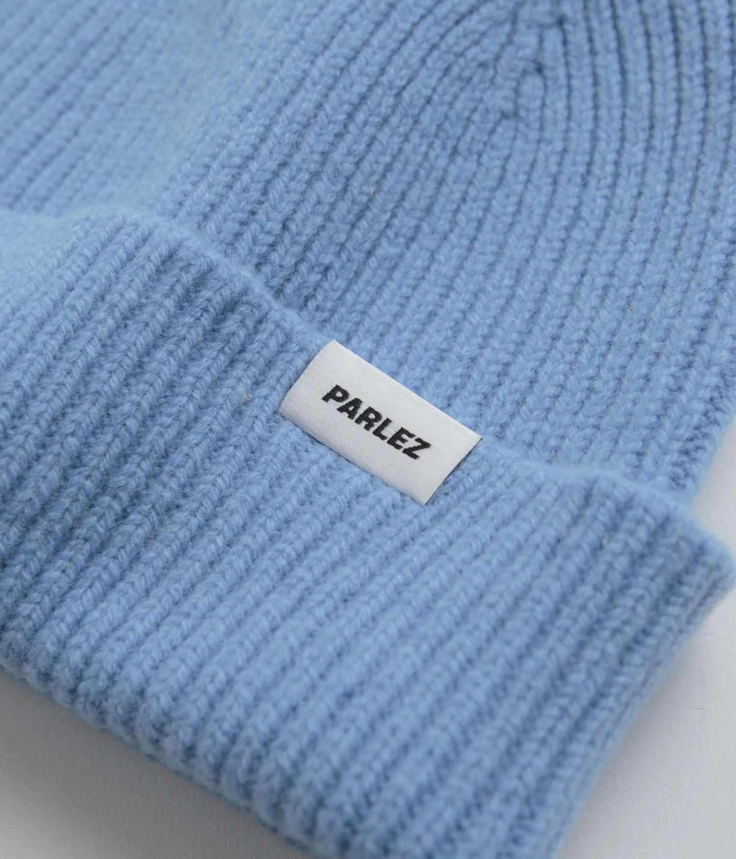 Parlez Cooke Beanie in Dusty Blue. Single sized and made from 100% pure lambswool, this colour block Parlez beanie is designed with a stretchy rib knit face. Finished in a shade of blue with a turn-up cuff and woven flag label branding.