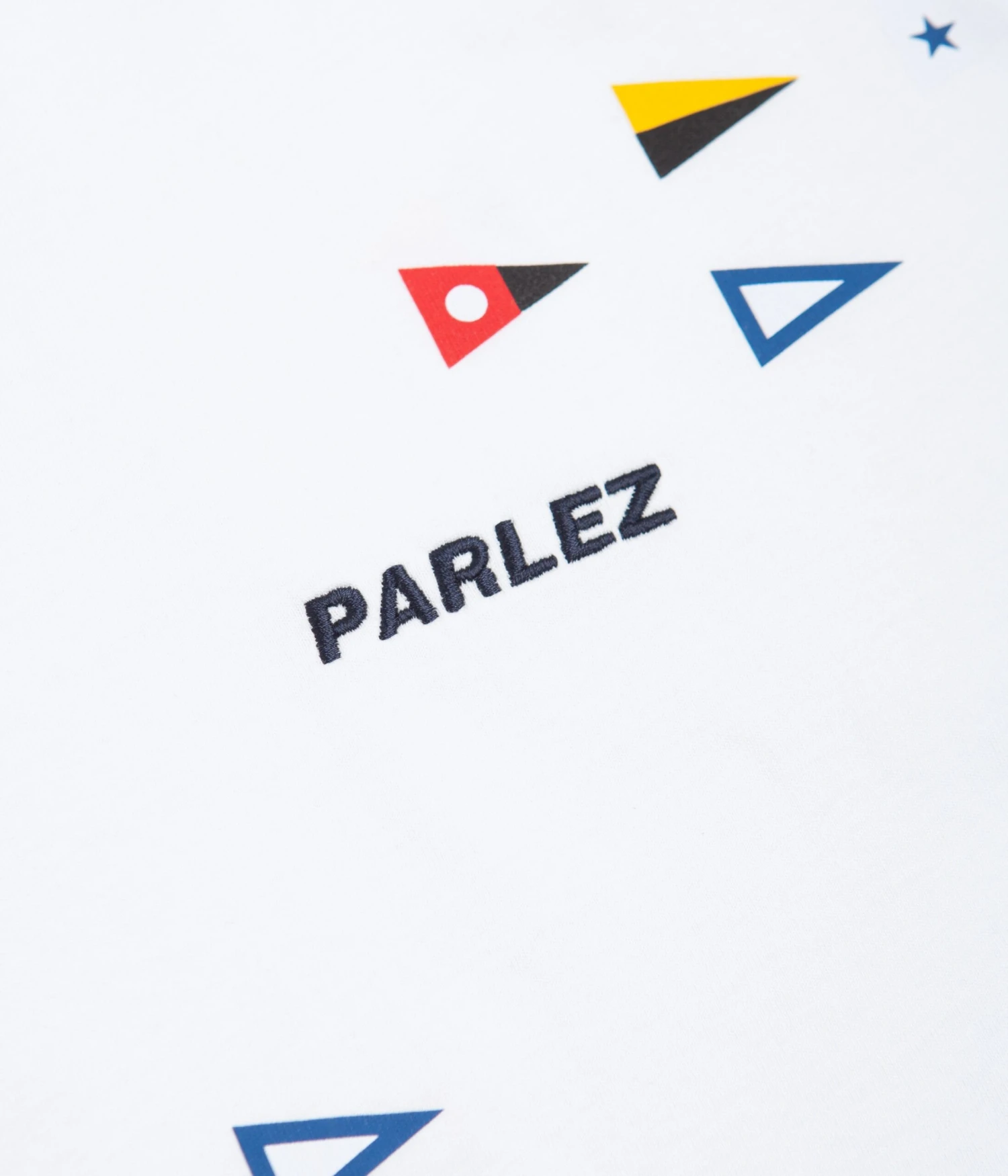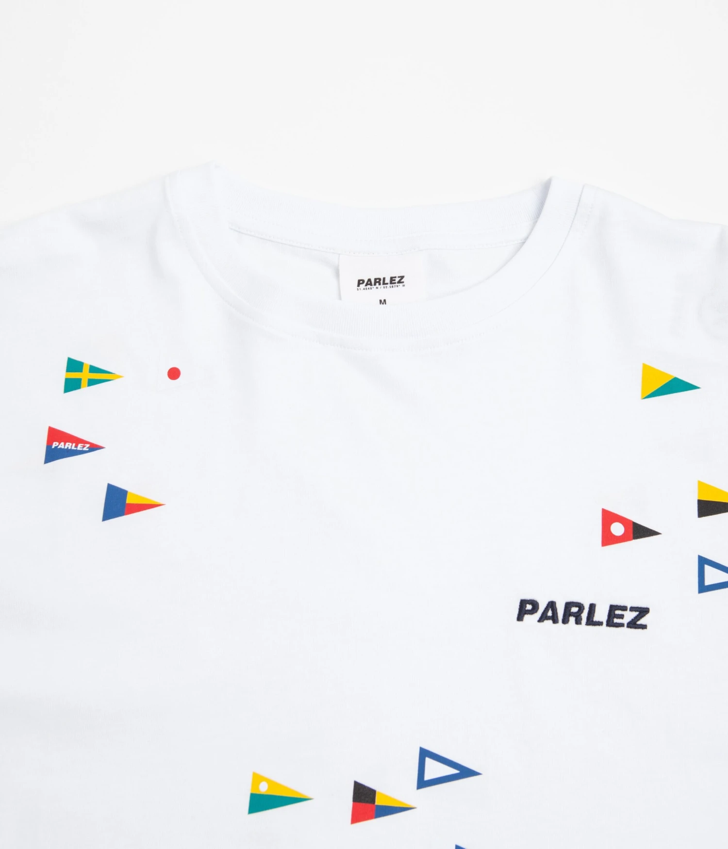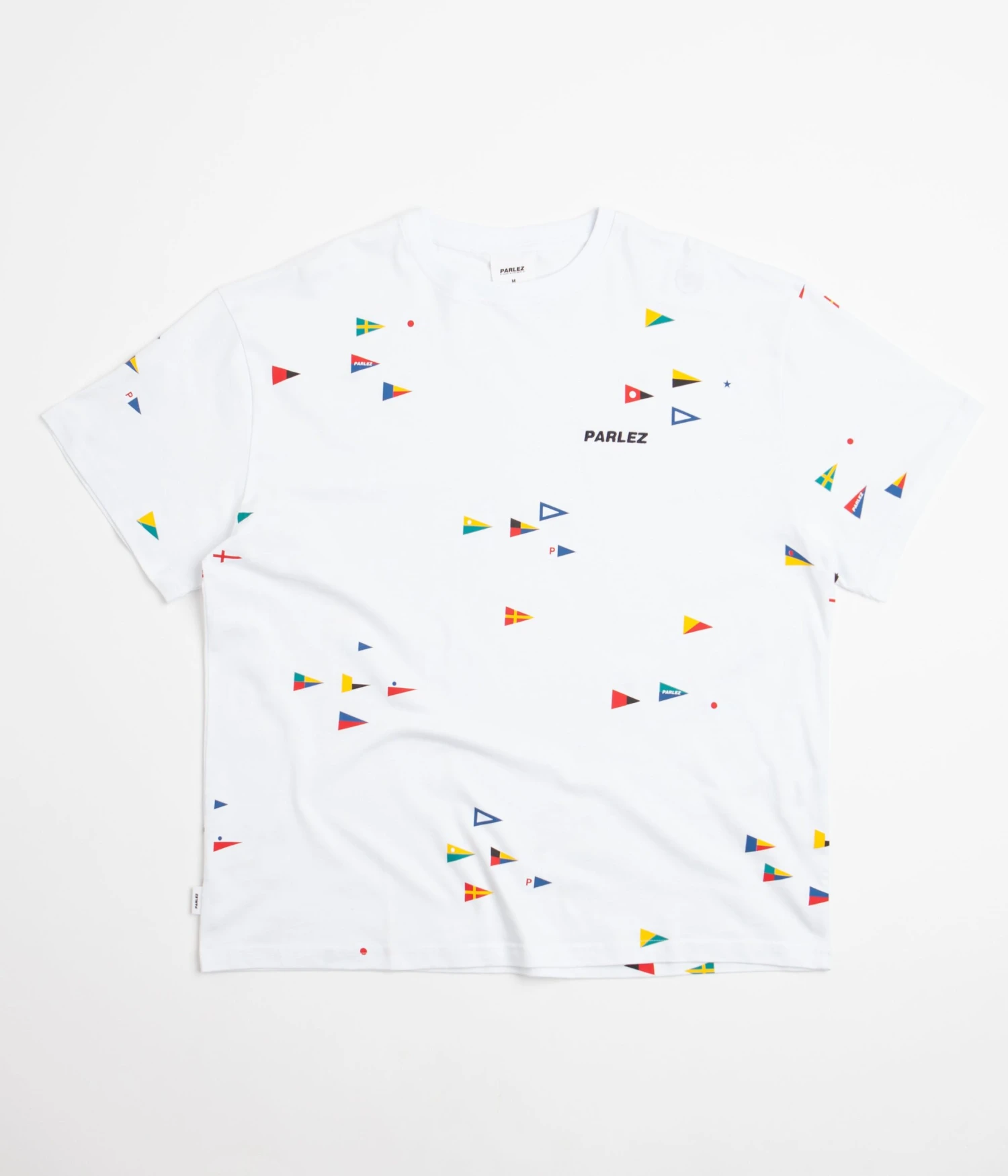 Parlez Topaz Oversized T-Shirt in White. Arriving as part of the brand’s latest collection, this oversized Parlez t-shirt is made from 100% organic cotton with a GOTS certified fabrication. Featuring a classic crew collar and a straight cut hem, this white Parlez t-shirt is finished with an all-over nautical flag print, a woven flag label and with an embroidered left chest logo.