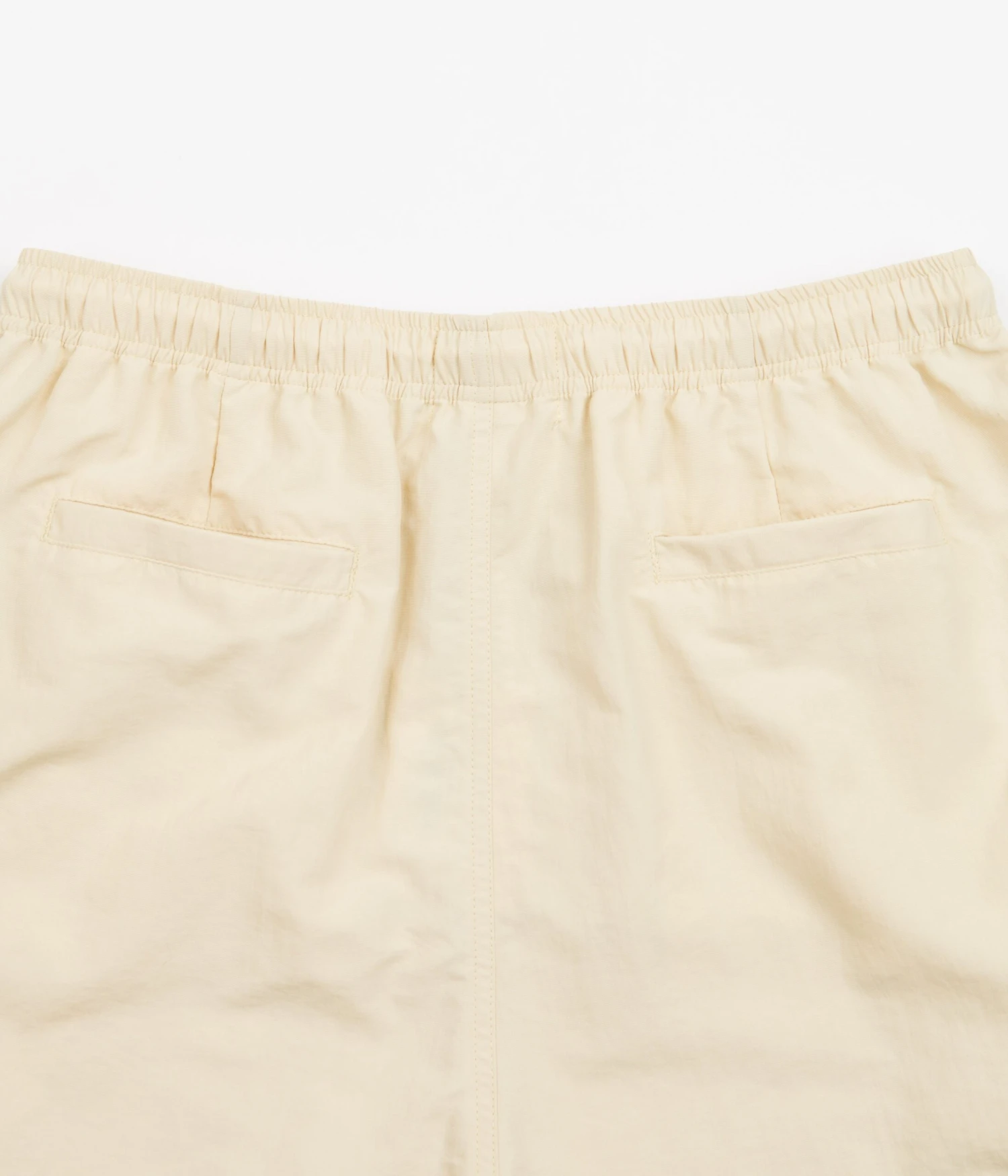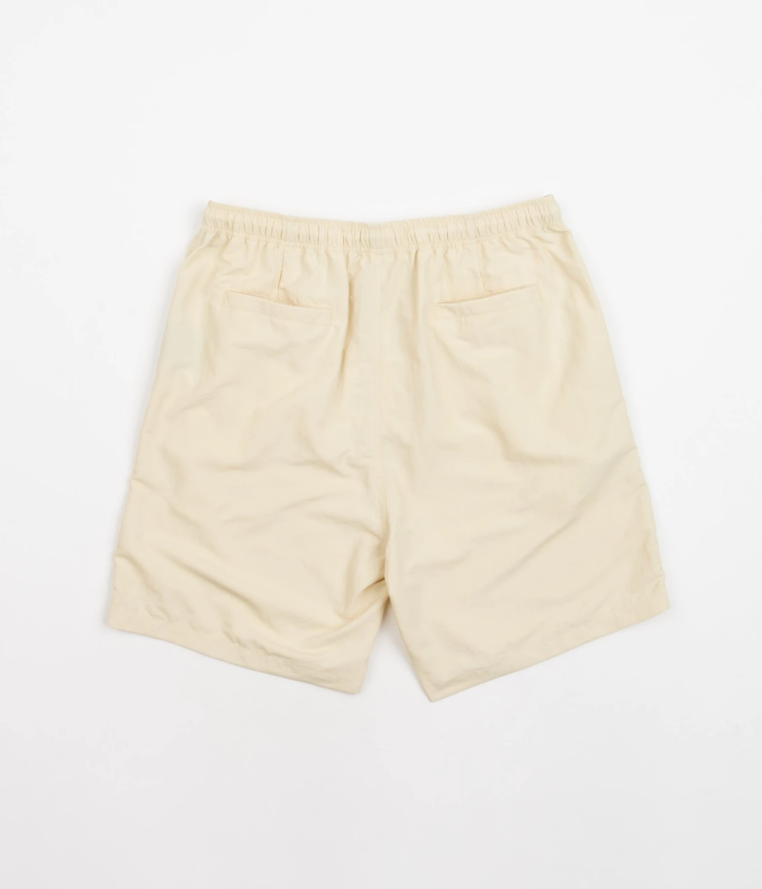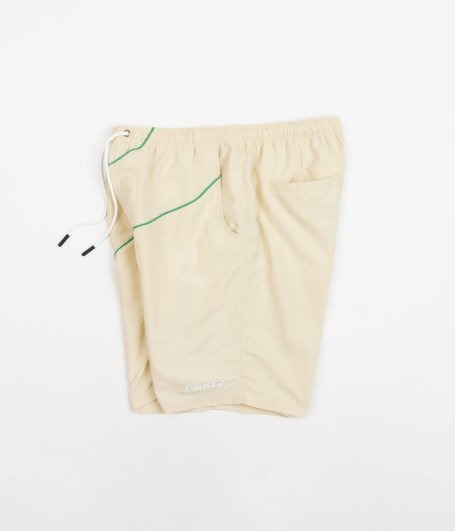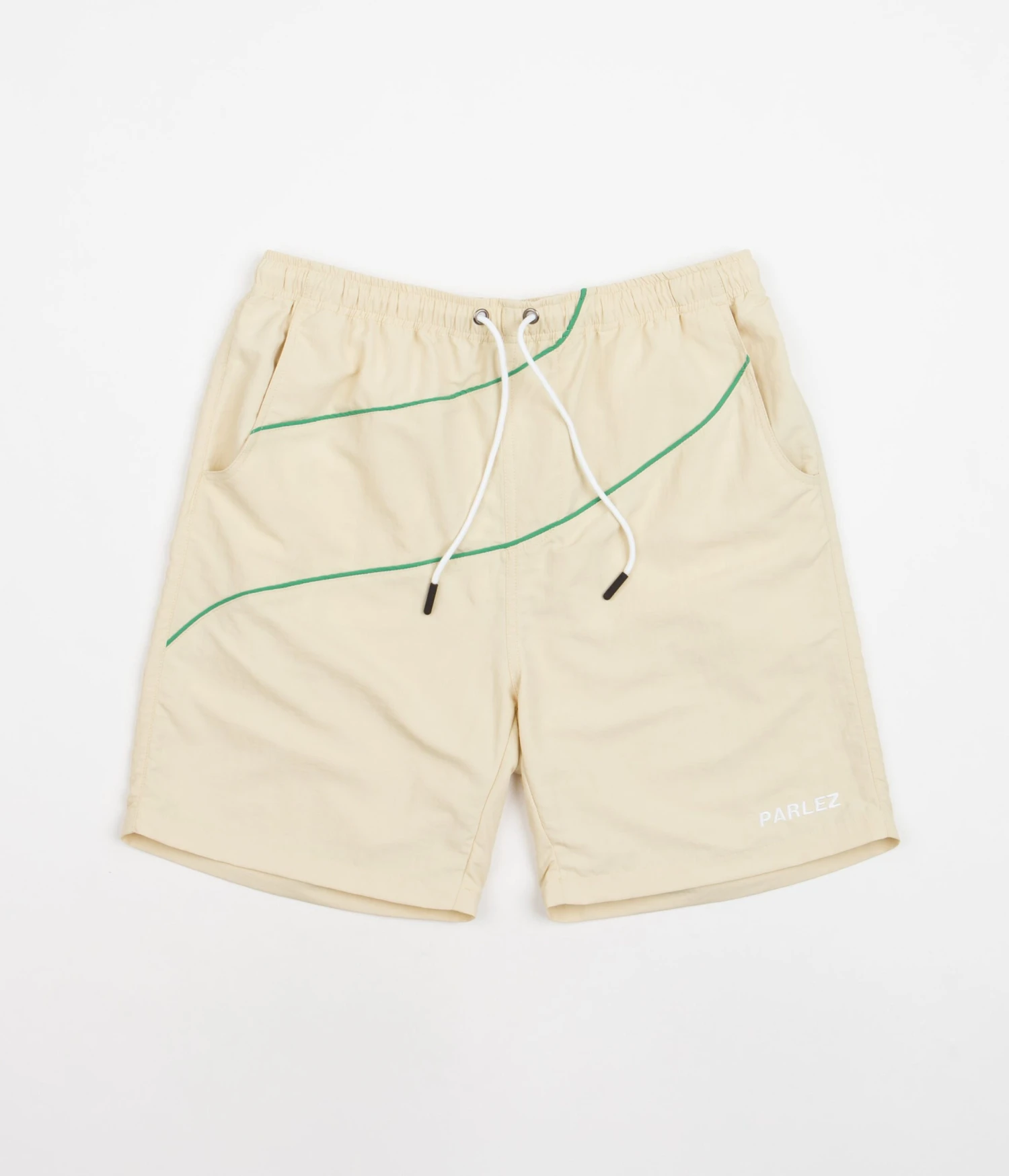 Parlez Venice Shorts in Ecru. Made from 100% recycled nylon and tailored to a regular fitting, these above-knee Parlez shorts are styled with a drawstring waist and a polyester mesh lining. Featuring contrast piping, these ecru Parlez shorts are fully water-resistant and are finished with embroidered ‘Parlez’ branding sewn above the left cuff.Â