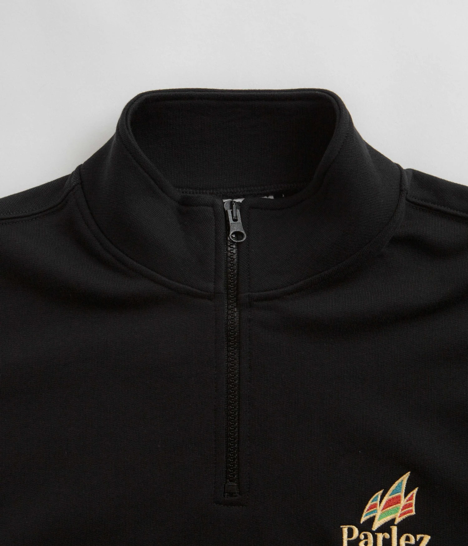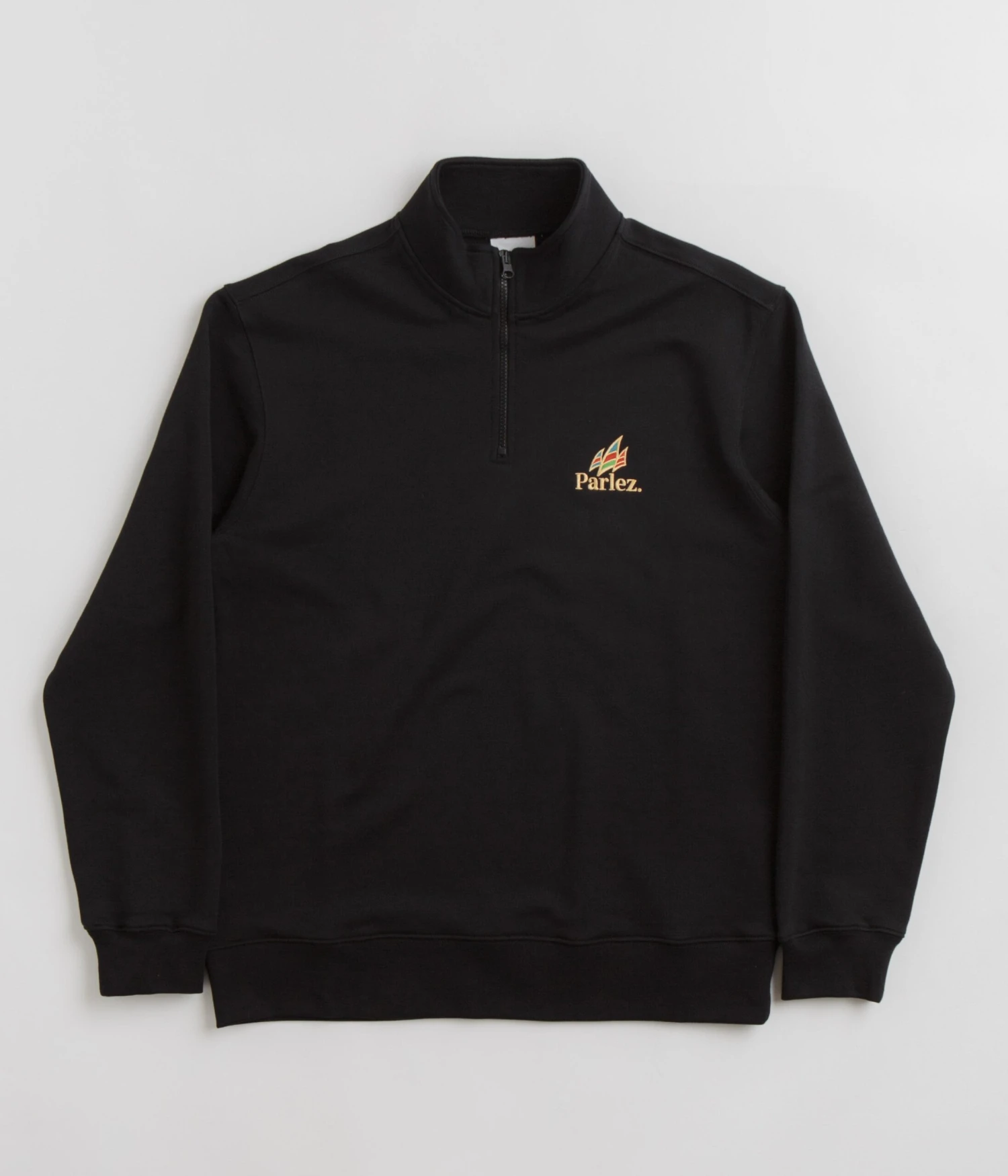 Parlez Wanstead 1/4 Zip Sweatshirt in Black. Made from 100% organic cotton, this regular fitting Parlez sweatshirt is designed with a ¼ length YKK Vislon zipper and thick ribbed cuffs. Finished in a shade of black with a woven elastic hem and embroidered left chest branding.