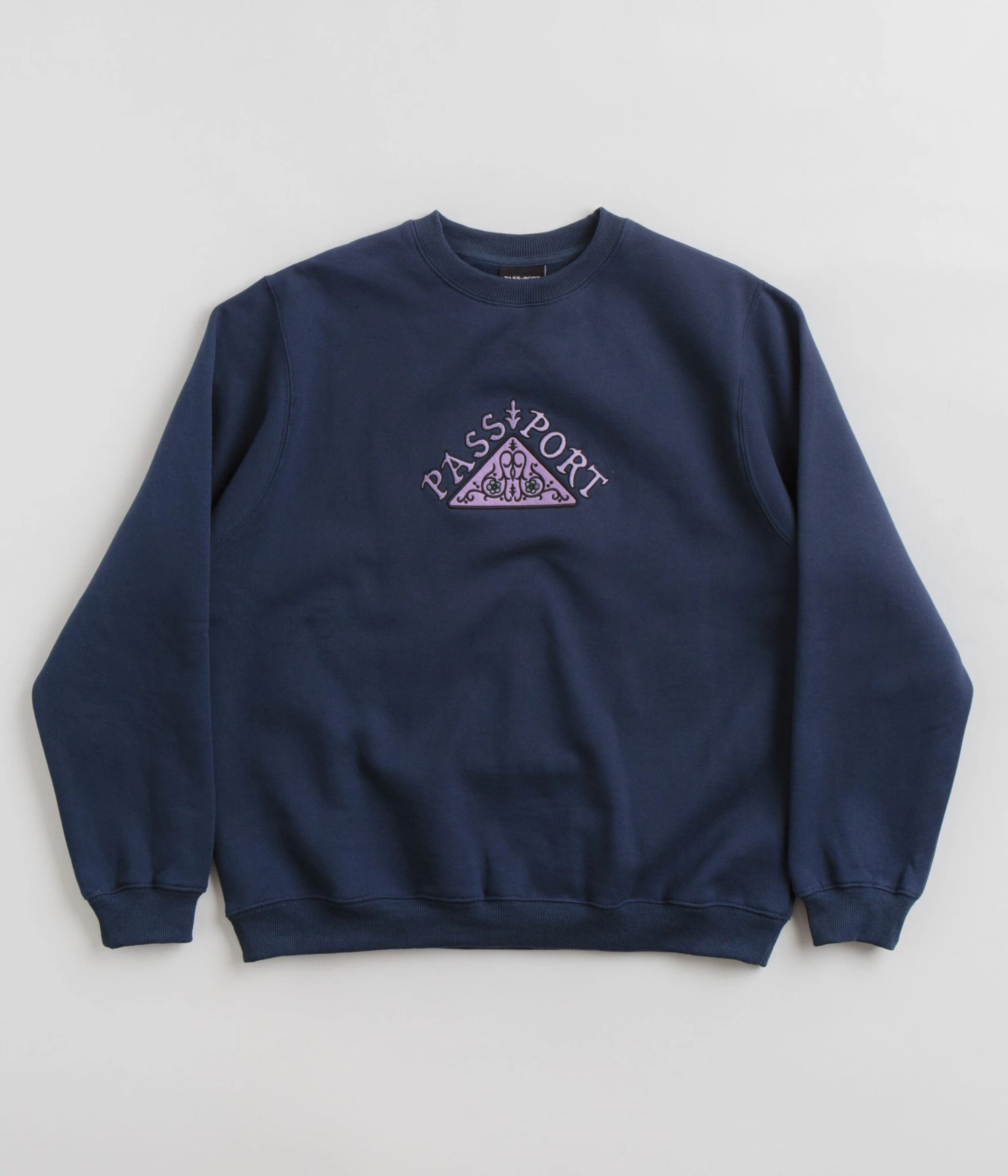 Pass Port Manuscript Crewneck Sweatshirt in Navy. Made from a cotton-polyester blend, this Pass Port sweatshirt is tailored to a regular fitting with a classic rib knit collar. Featuring rib knit cuffs and a woven elastic hem, this navy Pass Port sweater is finished with an embroidered Pass Port chest graphic with felt applique details.