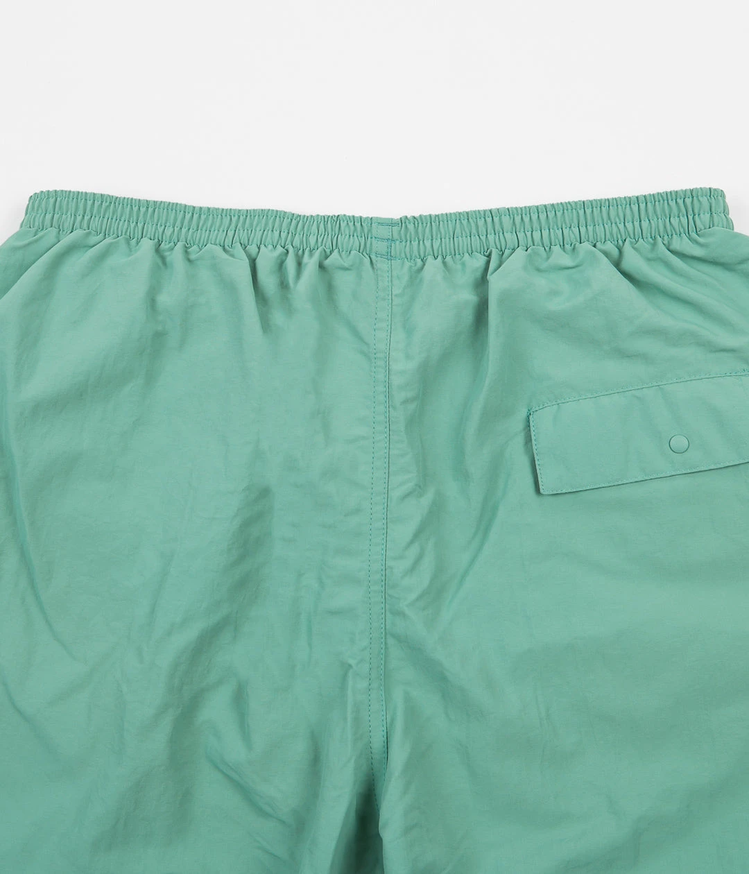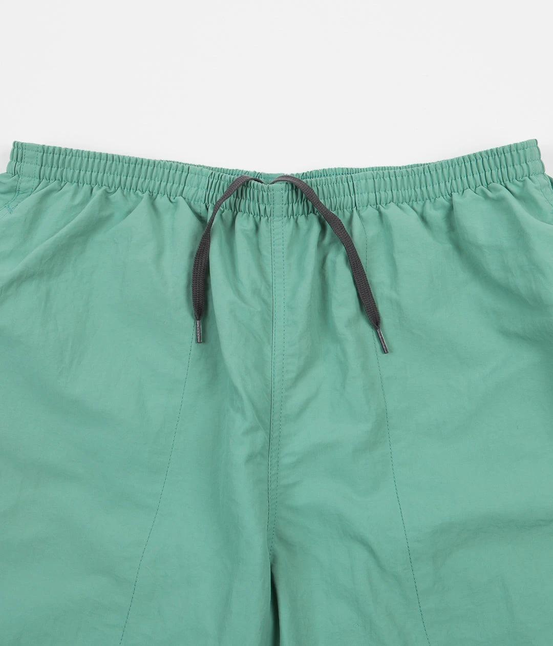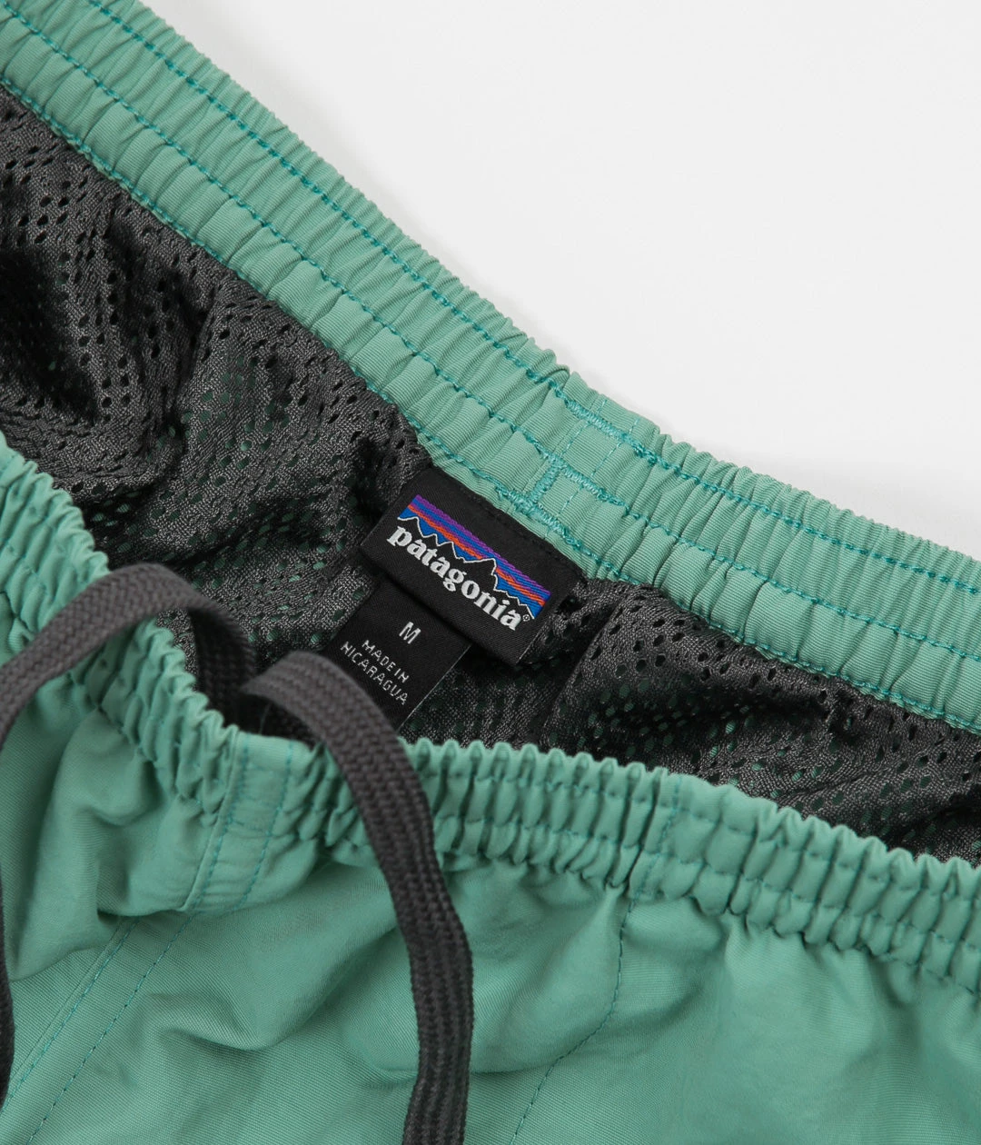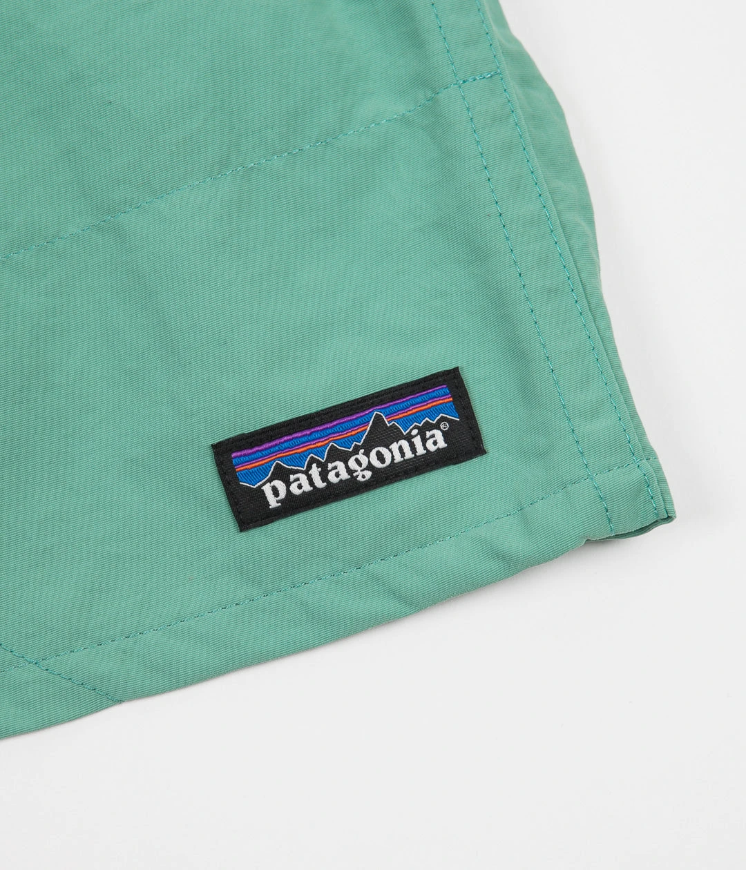 Patagonia Baggies Longs 7” Shorts in Light Beryl Green. Made from lightweight 100% recycled nylon with a DWR finish, these Patagonia shorts have been tailored to a relaxed fit to suit wear in and out of the water. A mesh liner has been added for support and the waistband is elasticated for comfort and an internal pull-cord lets you customise the fit to suit. Vertical side pockets on either side of the front reduce drag in the water and have drain and dry mesh corners whilst on the reverse a rear flap pocket sits on the right side and closes with a low-profile snap. Allowing for movement during a variety of activities the inseam measures to 7”.