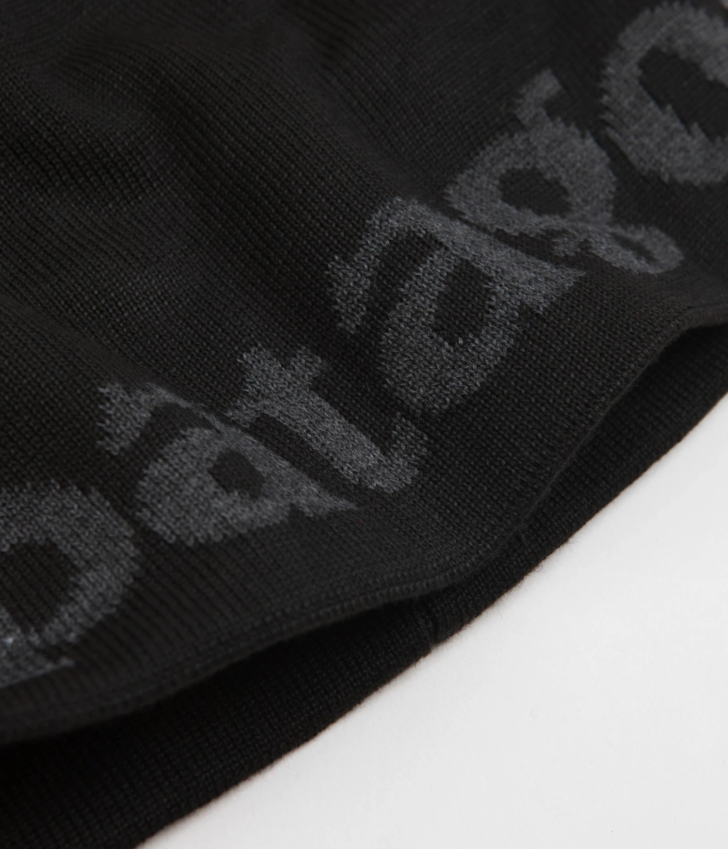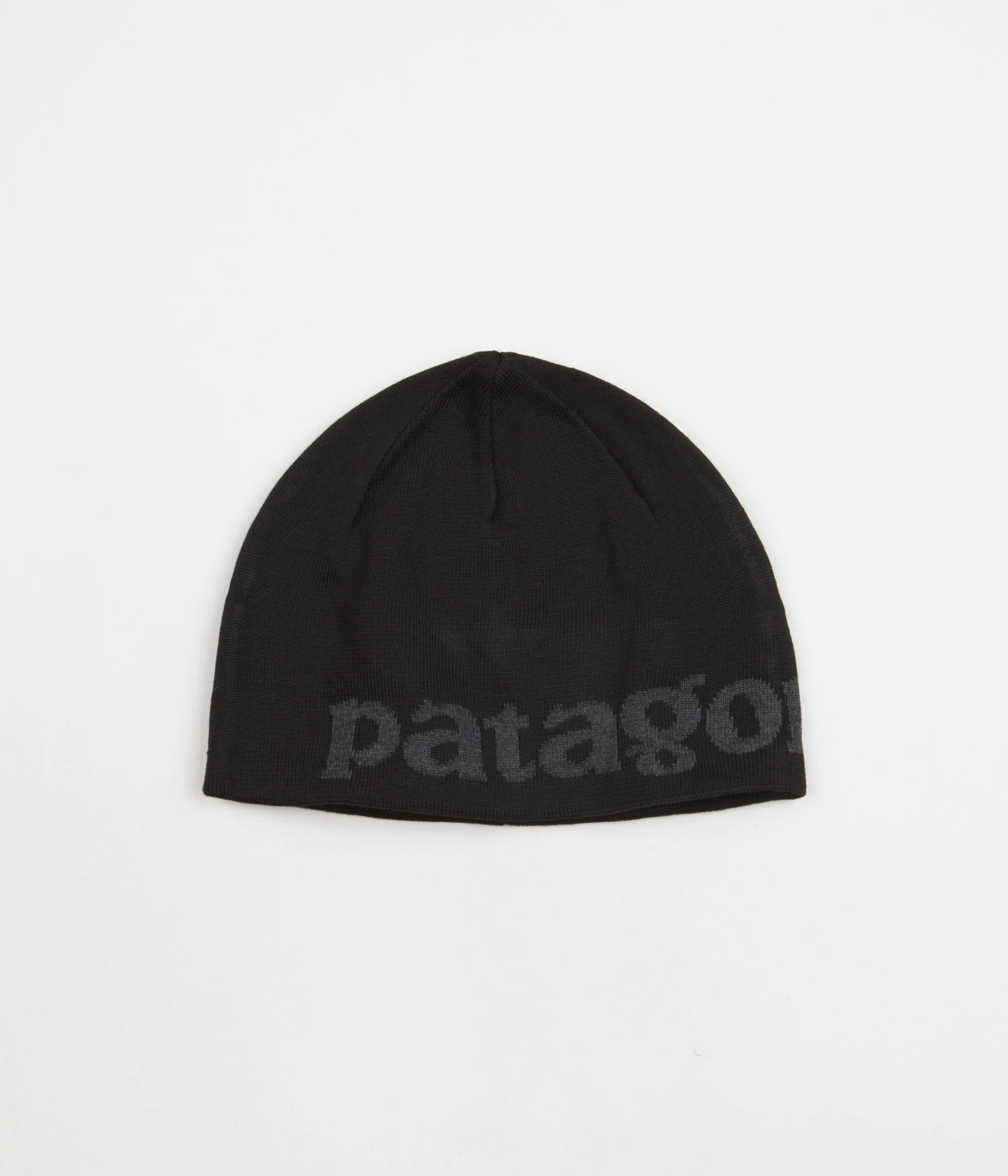Patagonia Beanie in Logo Belwe: Black. Made from 100% recycled polyester yarn and Fair Trade Certified, this single sized Patagonia beanie is styled with a tightly woven construction and a lowered profile. Cuff-less and finished with woven and wrap-around Patagonia branding.